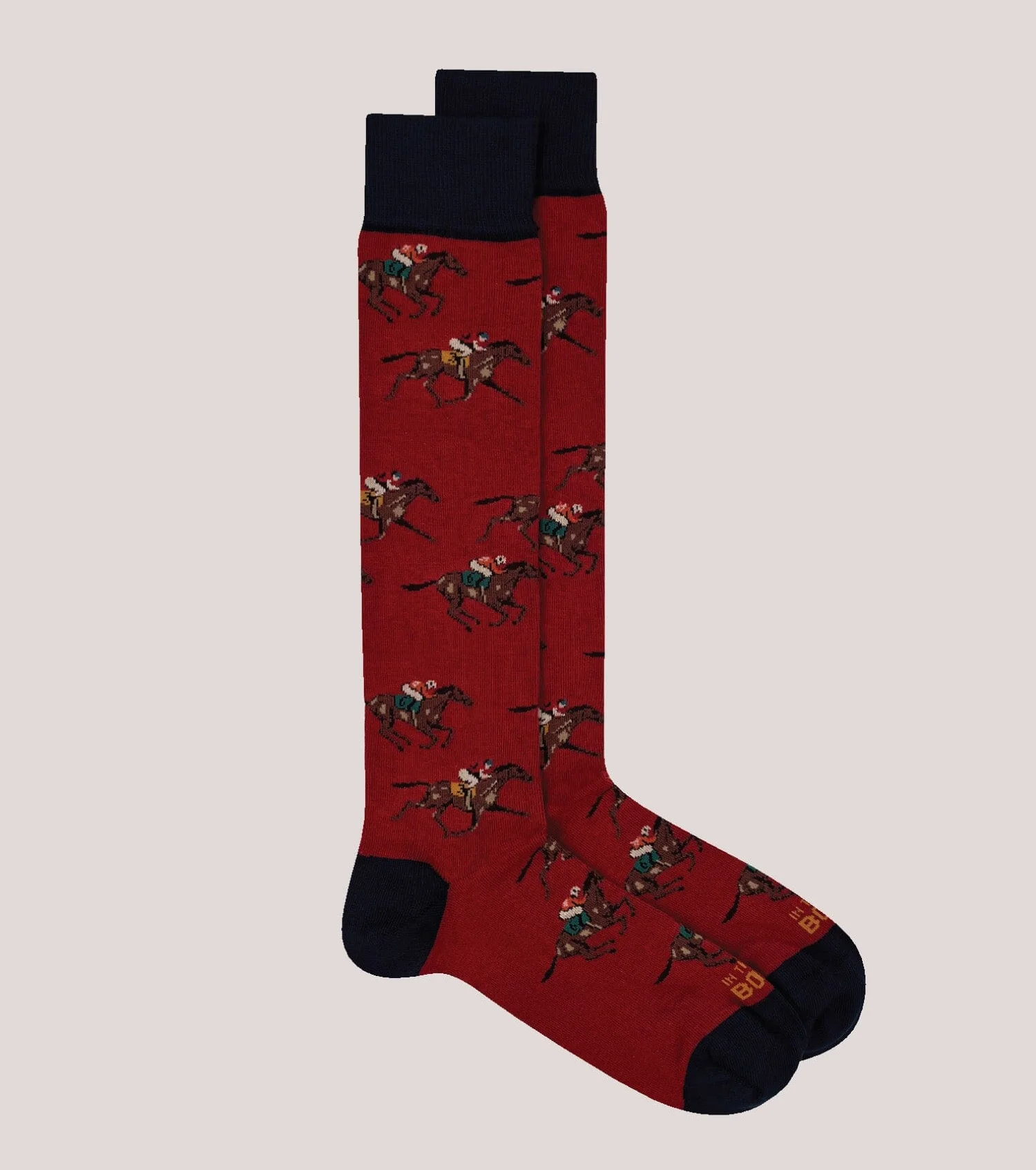Calzino lungo di colore rosso scuro con disegno a tema Cavalli di colore marrone, avorio e ocra. Bordino gambale di colore blu.