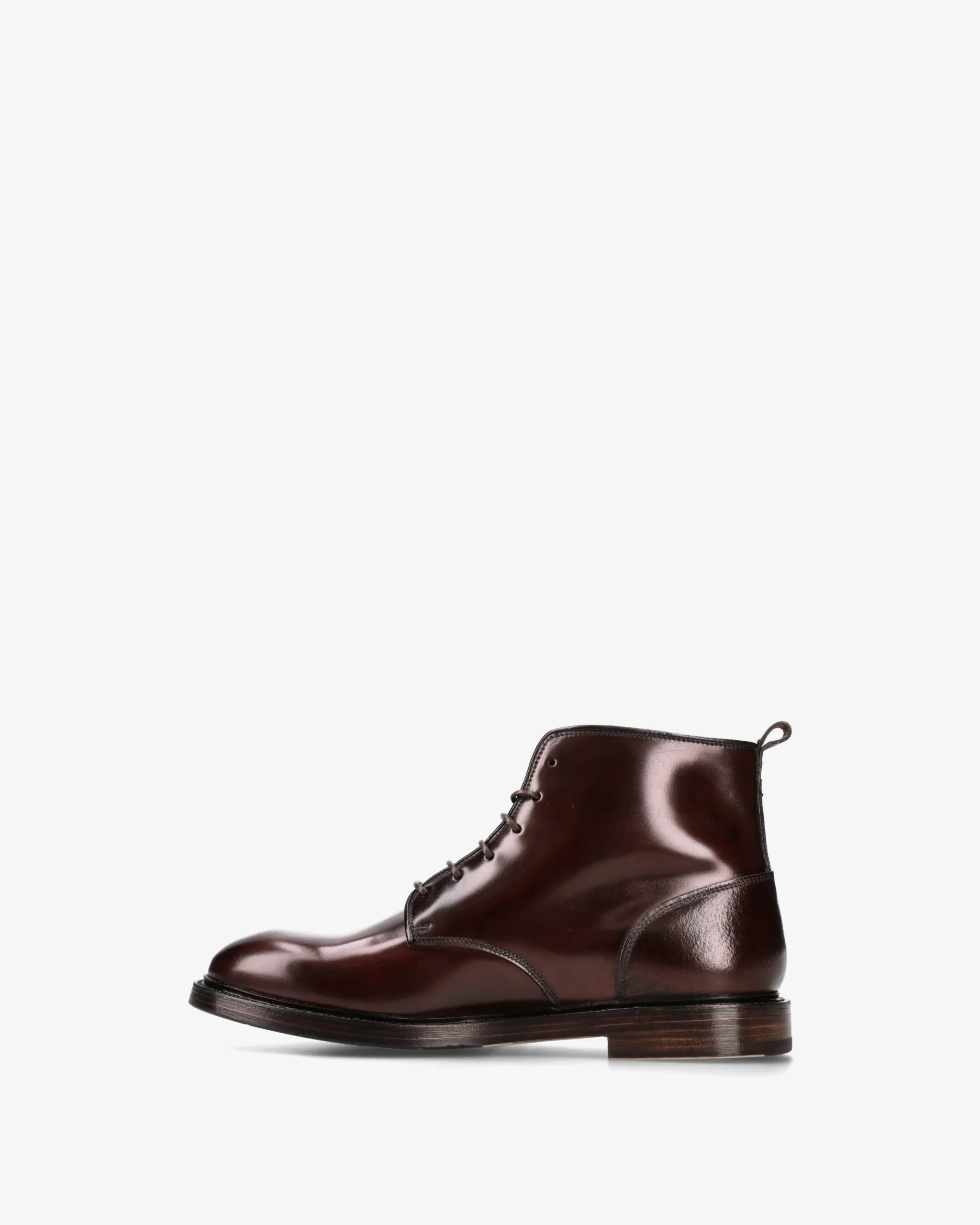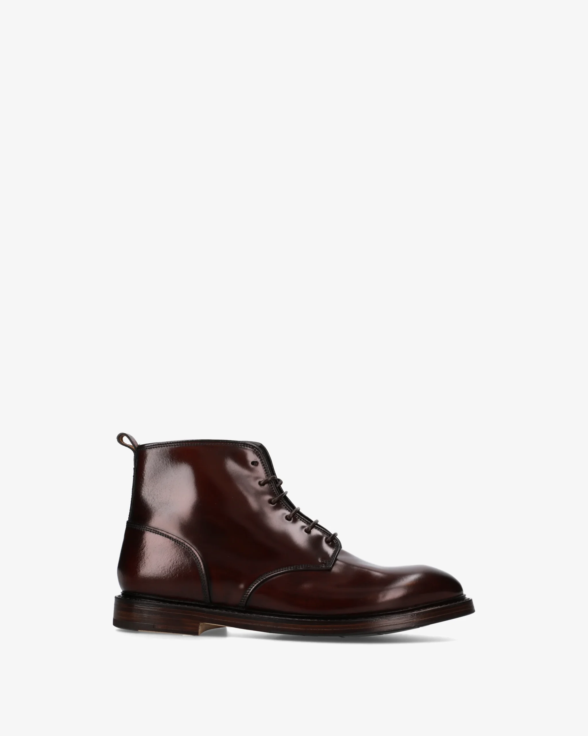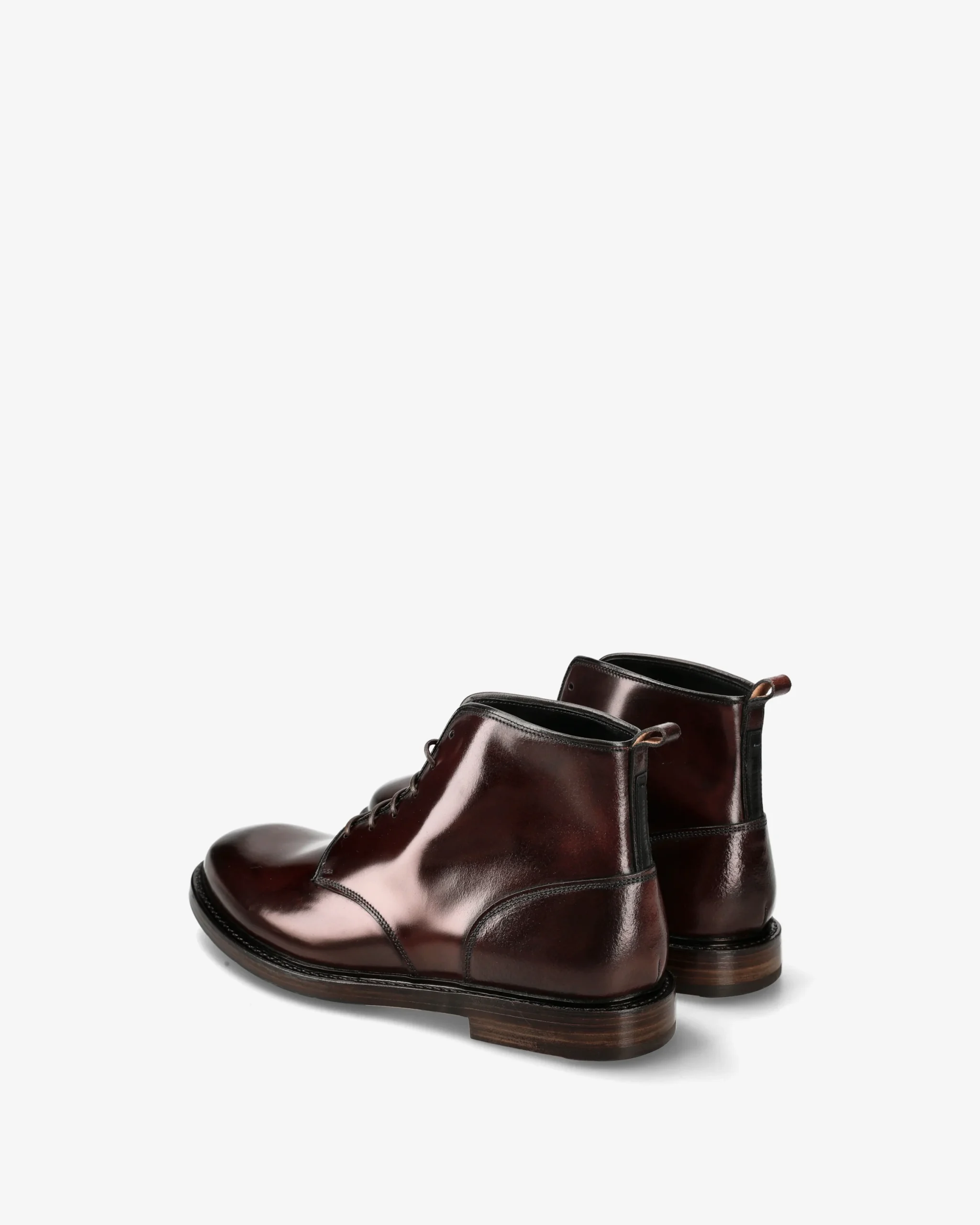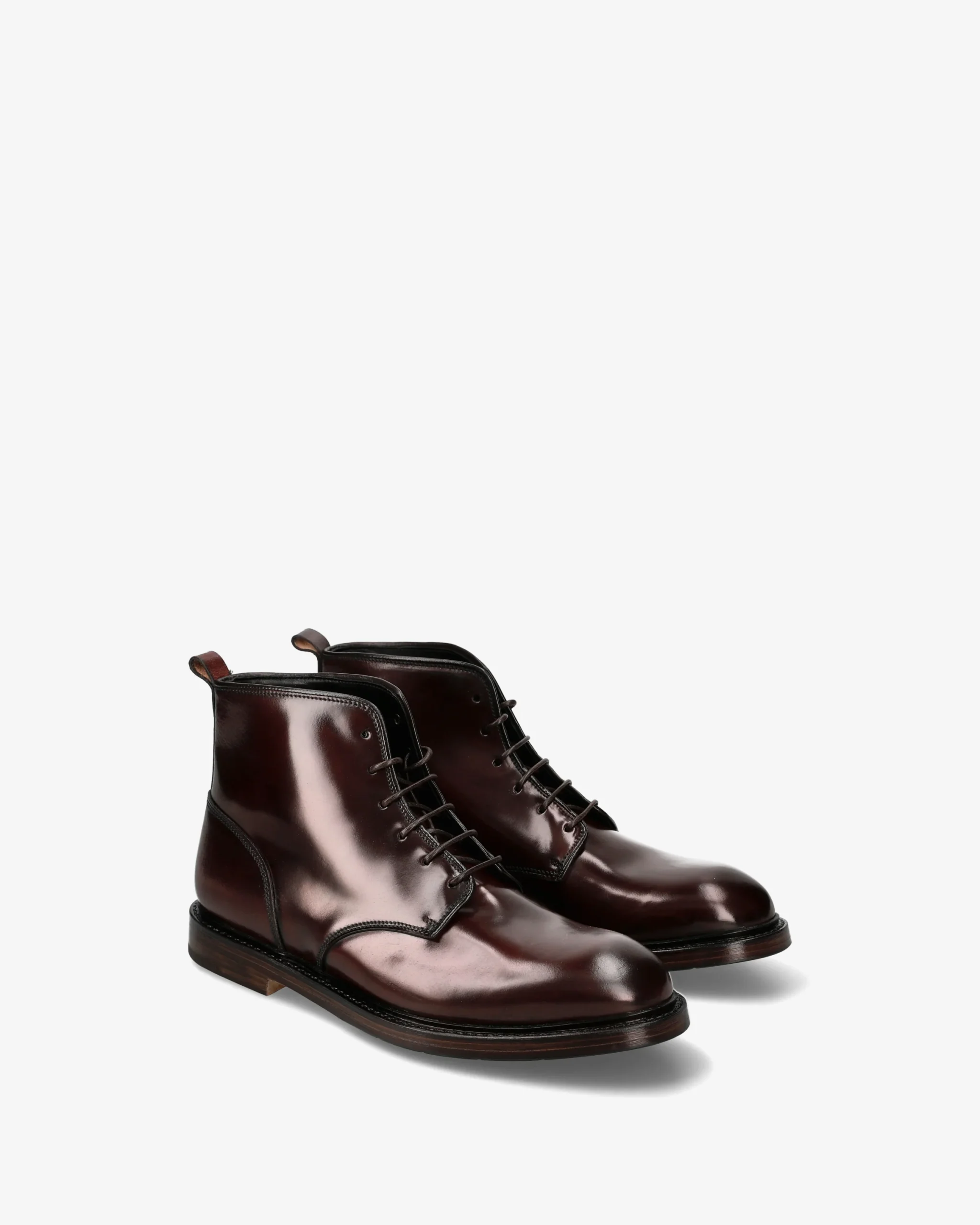 A lace-up boot with an imposing and refined character, combining classic military aesthetics with noble materials. The glossy finish and high-end construction make it a piece of excellence in terms of durability and style.