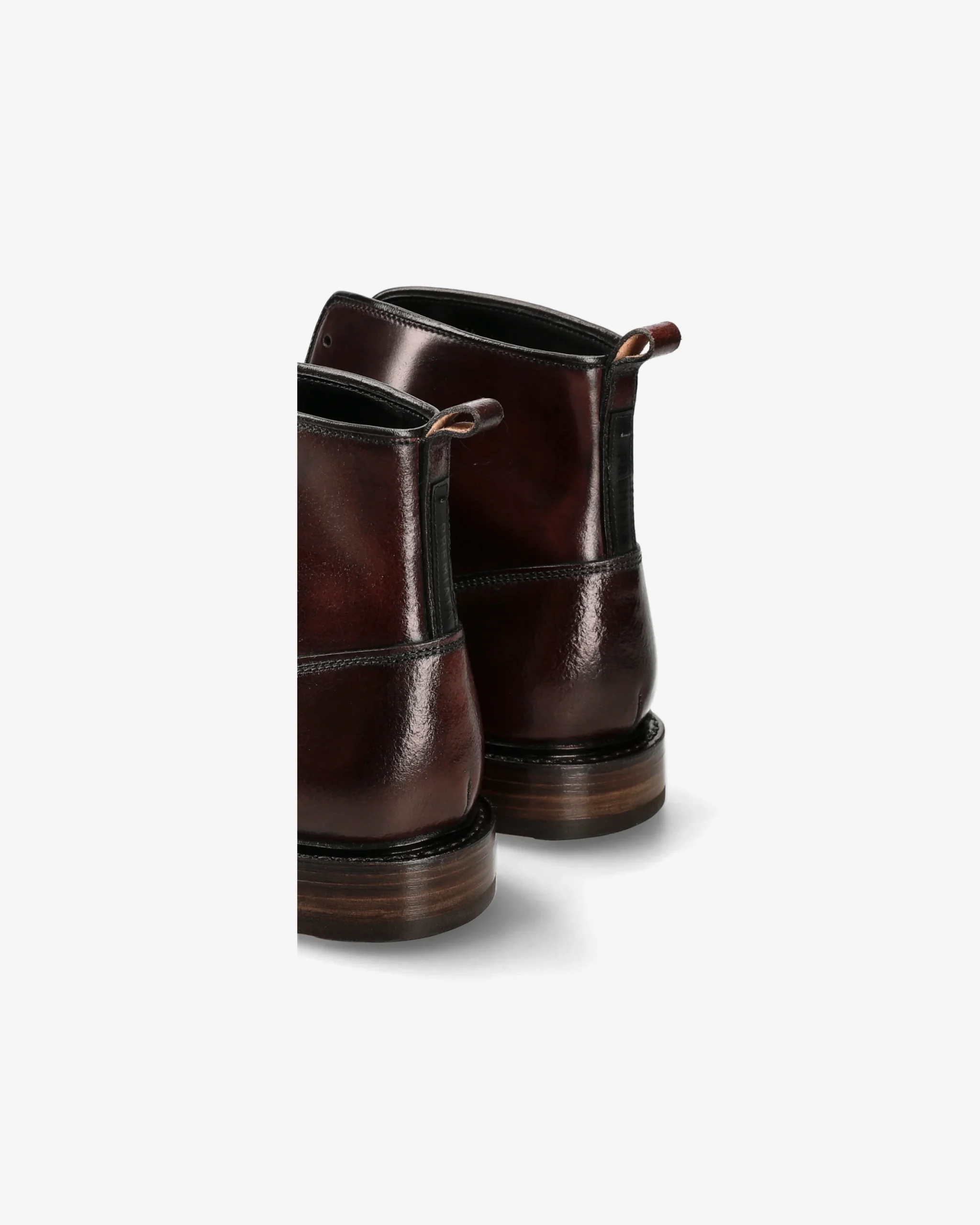 A lace-up boot with an imposing and refined character, combining classic military aesthetics with noble materials. The glossy finish and high-end construction make it a piece of excellence in terms of durability and style. Fine horse leather in a deep, intense burgundy shade with a glassy sheen. Made using the Goodyear method, featuring an exposed […]