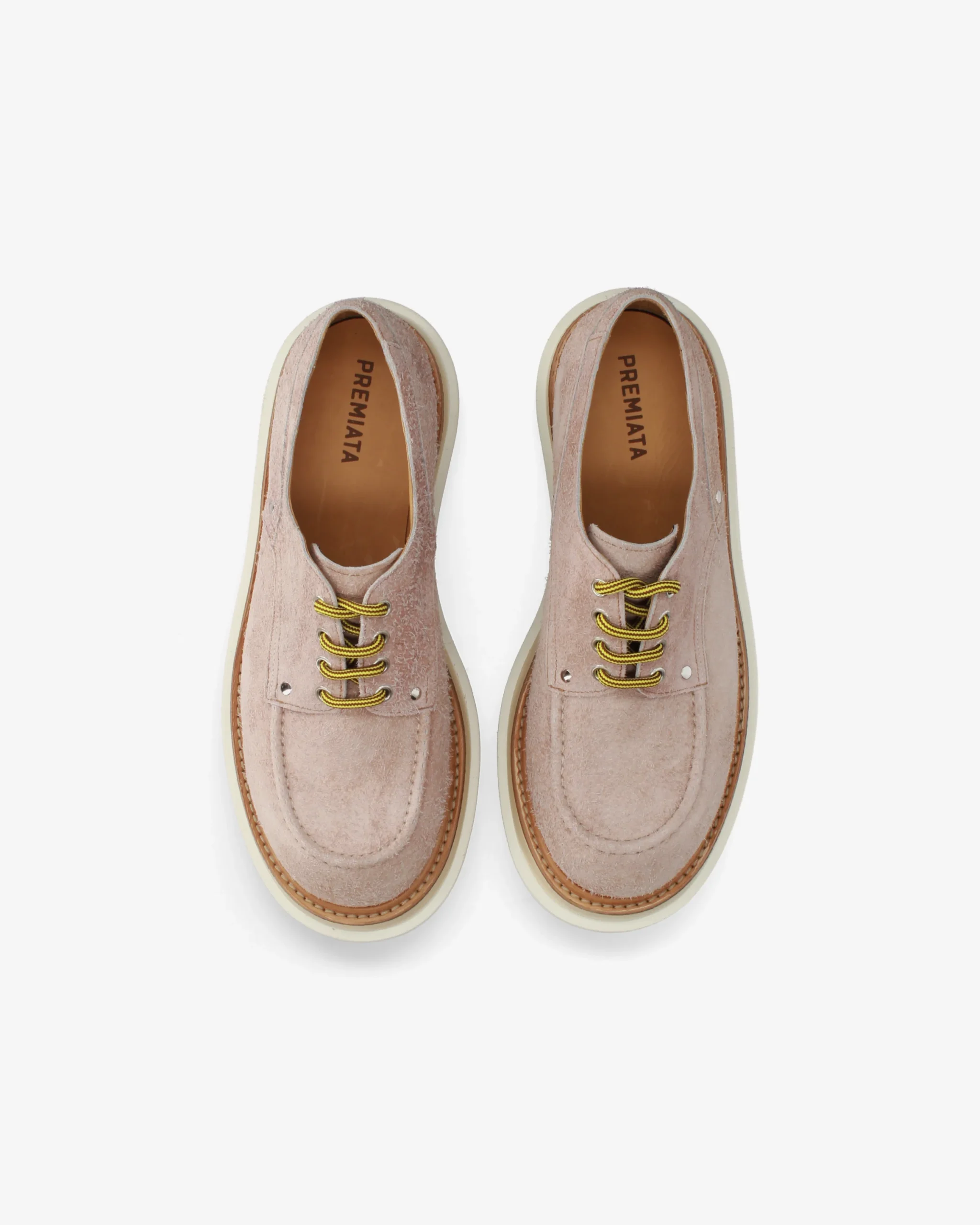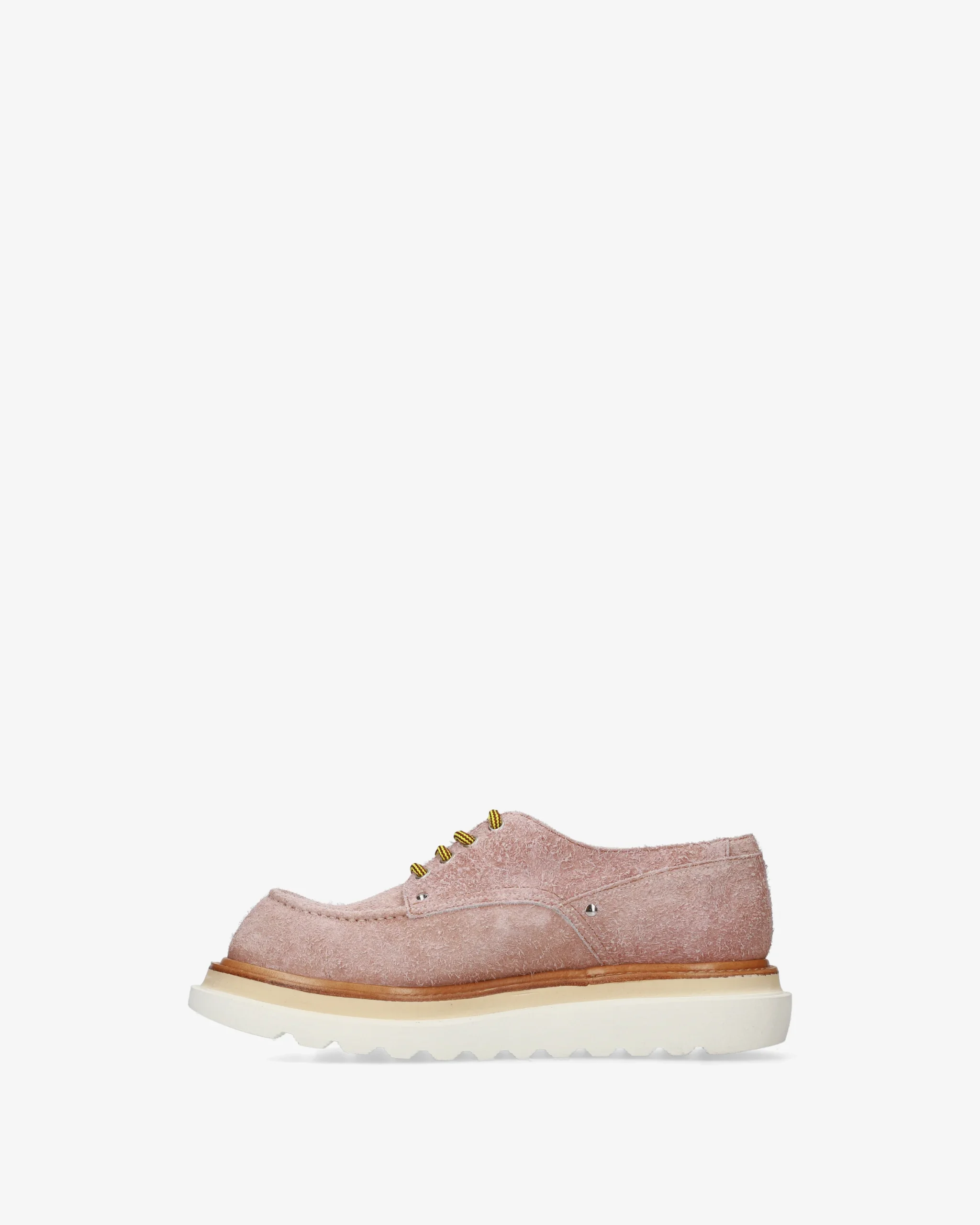 A lace-up shoe with a bold, textured design that reinterprets the classic Derby with generous volumes and a contemporary-inspired color contrast. The shaggy texture of the material emphasizes its artisanal and unconventional aesthetic.