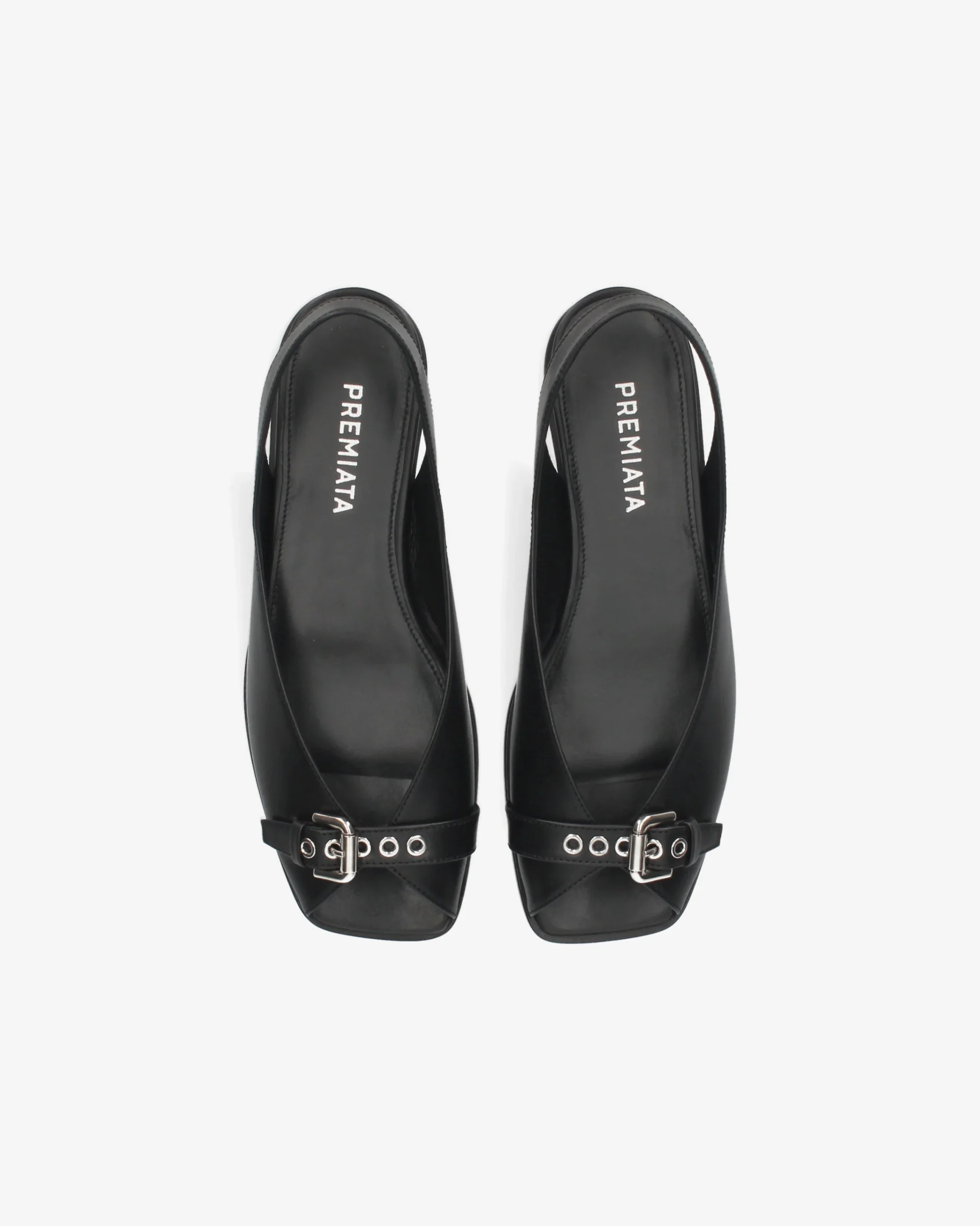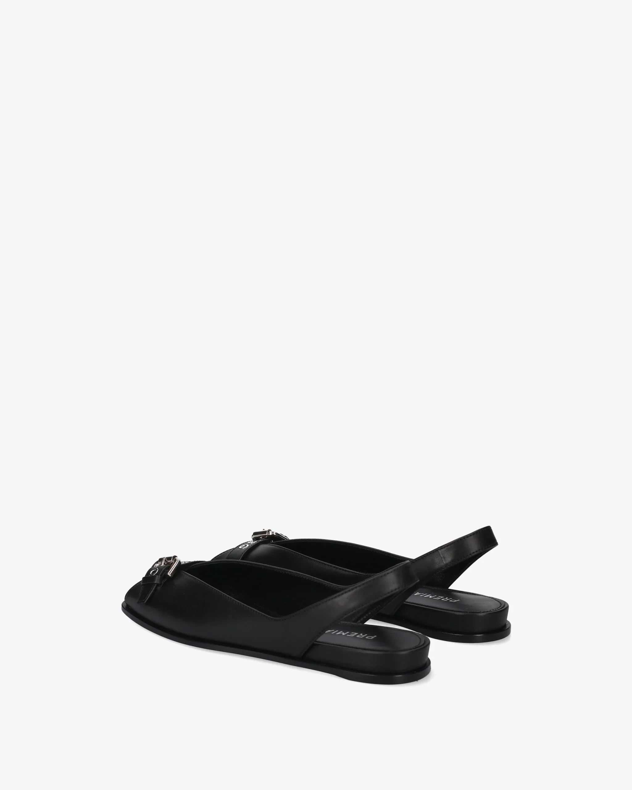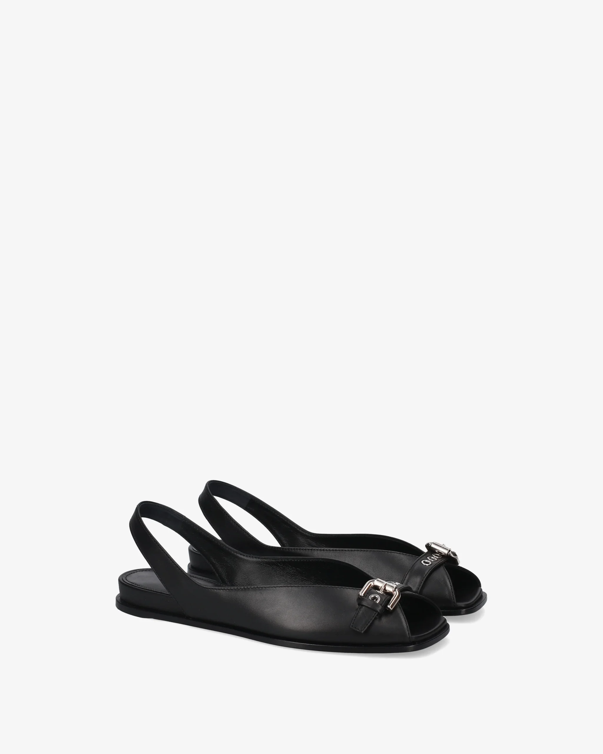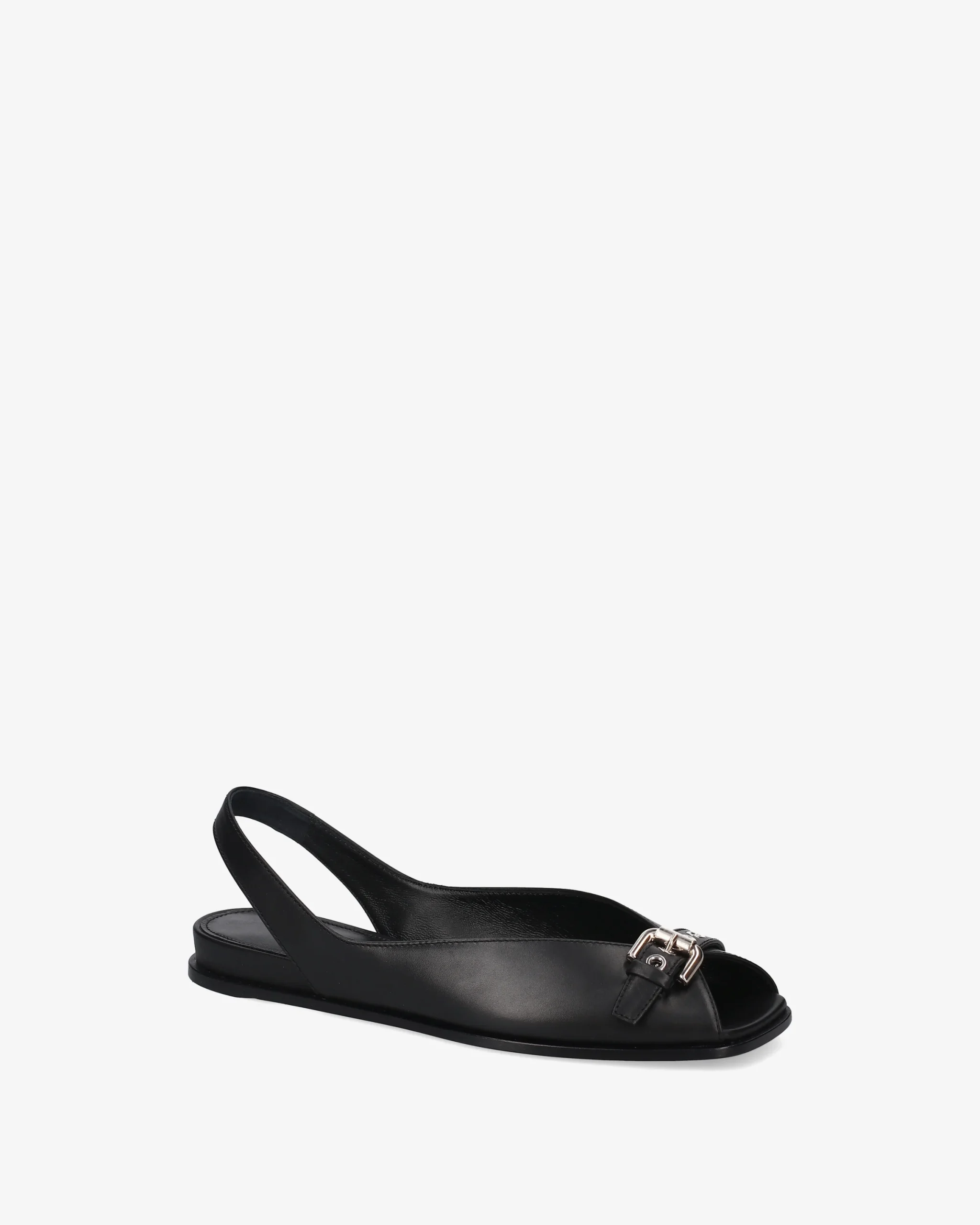 A contemporary take on the classic slingback, featuring a tapered silhouette and biker-inspired hardware details. Crafted from high-quality smooth leather, it combines flat comfort with sophisticated design. Smooth black leather Decorative strap on the toe with shiny silver-finish metal roller buckle Open-toe style with deep V-neckline and elastic back strap Ultra-flat leather sole