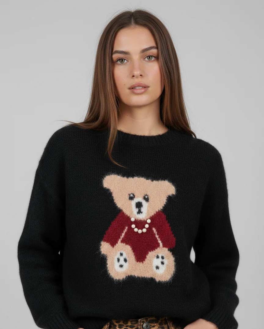 Avvolgiti nel comfort di questo maglione teddy che unisce stile e calore. Il design chic con il delizioso orsetto ricamato cattura l’essenza romantica di Parigi, perfetto per chi ama i dettagli affettuosi. Realizzato con materiali morbidi e accoglienti, รจ il capo ideale per le giornate fredde quando desideri sentirti coccolata senza rinunciare all’eleganza. Un pezzo versatile che trasforma il tuo guardaroba invernale in una dichiarazione di stile dolce e sofisticato.