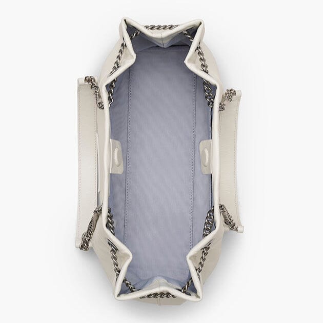 Borsa a spalla di Marc Jacobs, realizzata in pelle lucida di colore bianco latte con manici in pelle e catena nikel. Chiusura centrale tramite magnete. Interno foderato in tessuto. Tasca interna con chiusura a zip e altre taschine aperte. Logo e nome della borsa realizzato con lettere ricamate sulla parte anteriore della borsa.