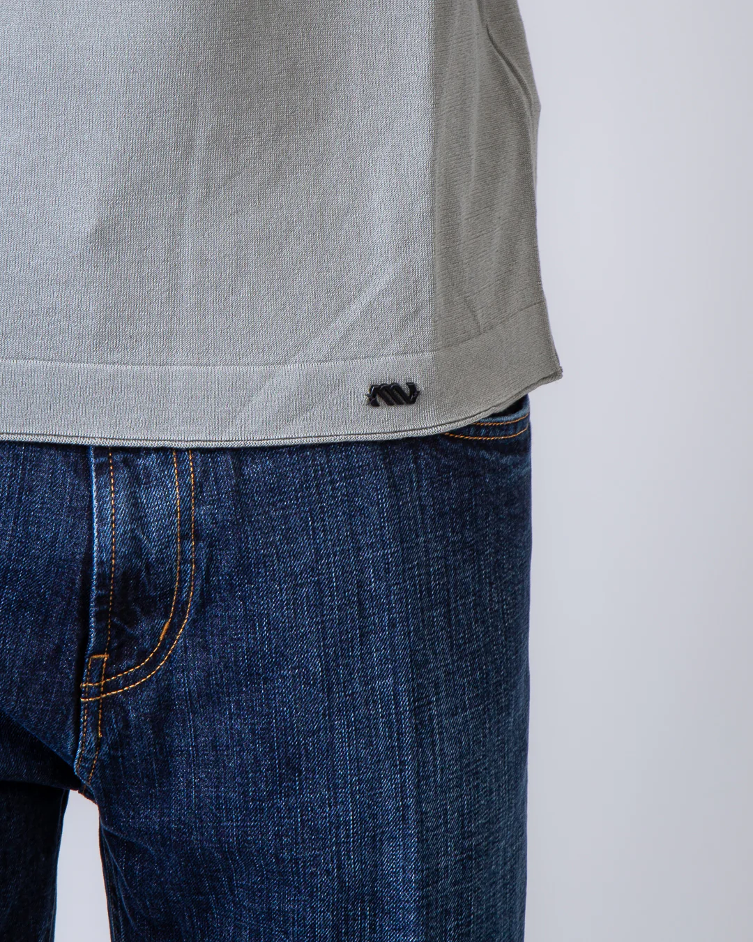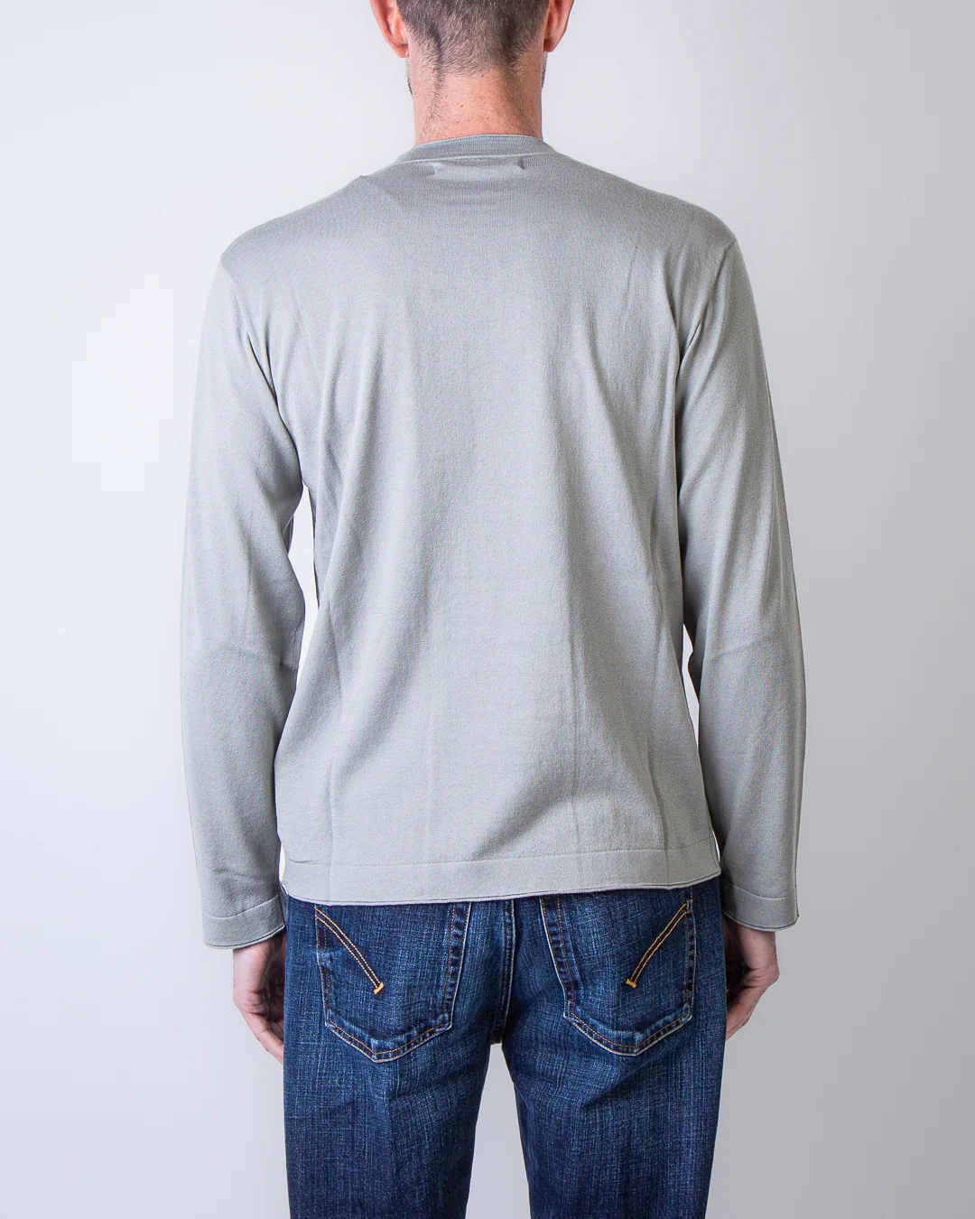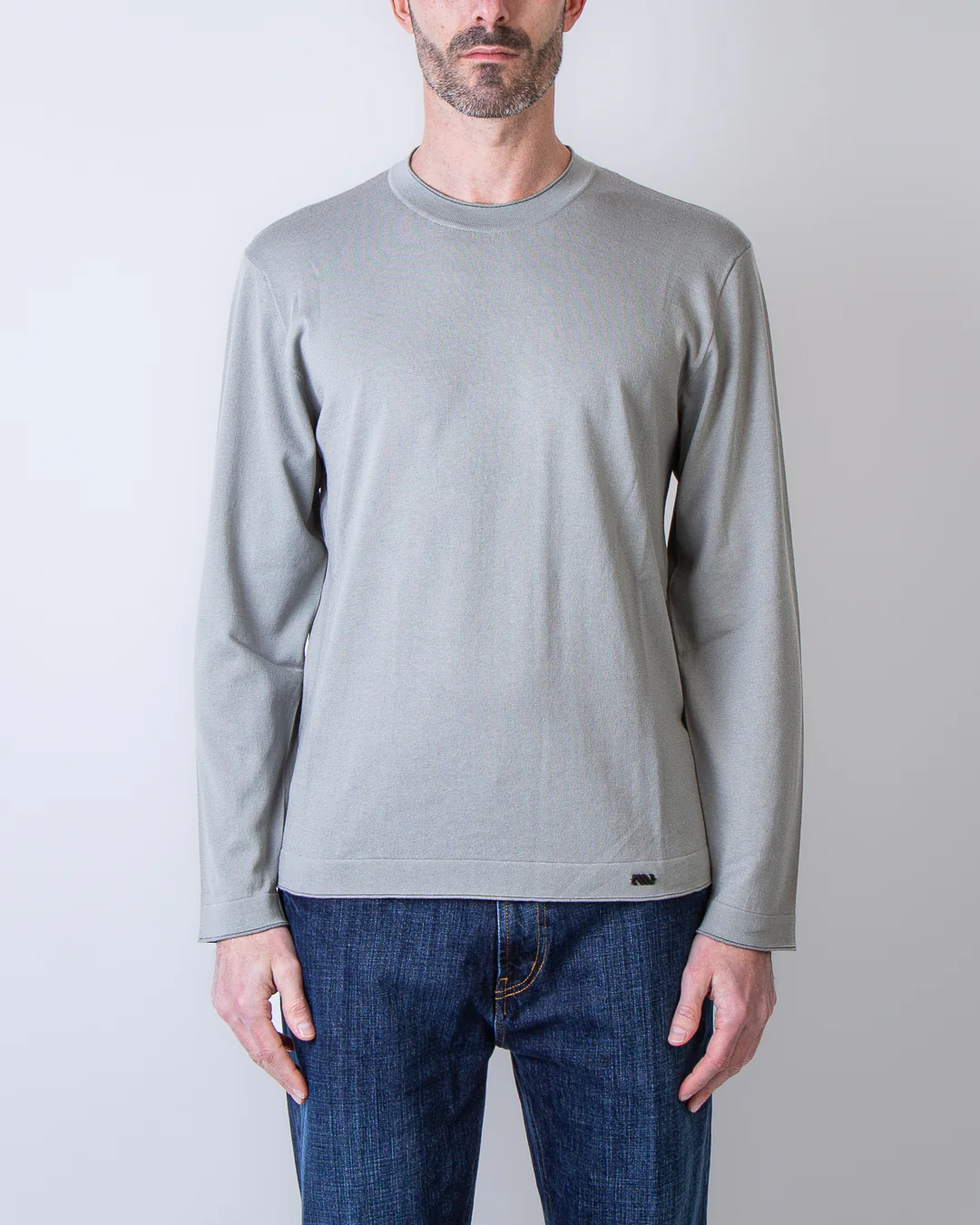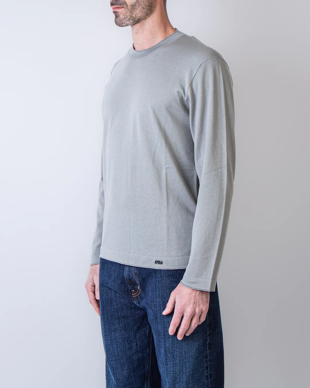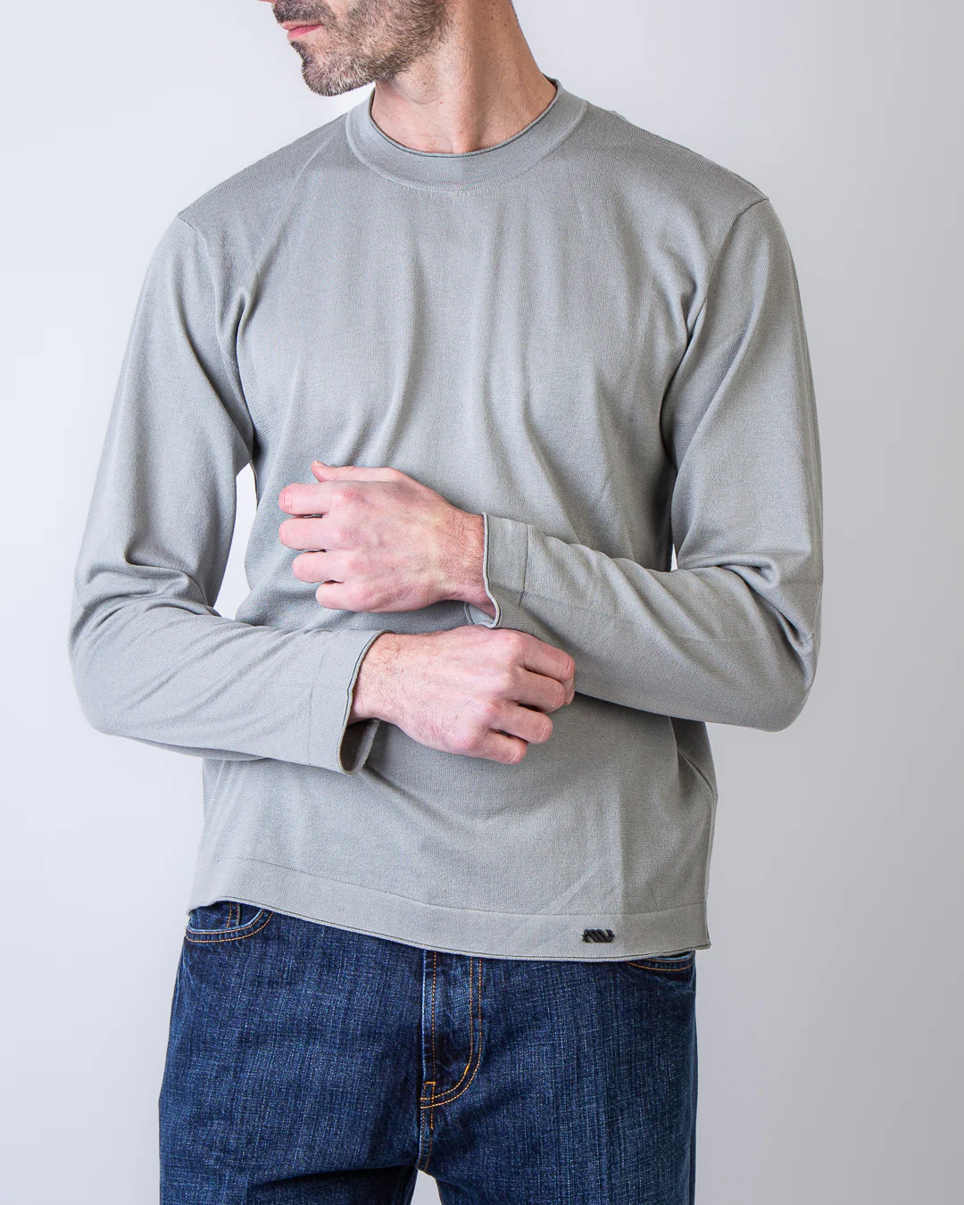 Massimo Osti Studio, maglia uomo 20MKN108A 110683A 904 tortora, girocollo rasato cotone/seta. Il modello รจ alto 186 cm e indossa la taglia L
