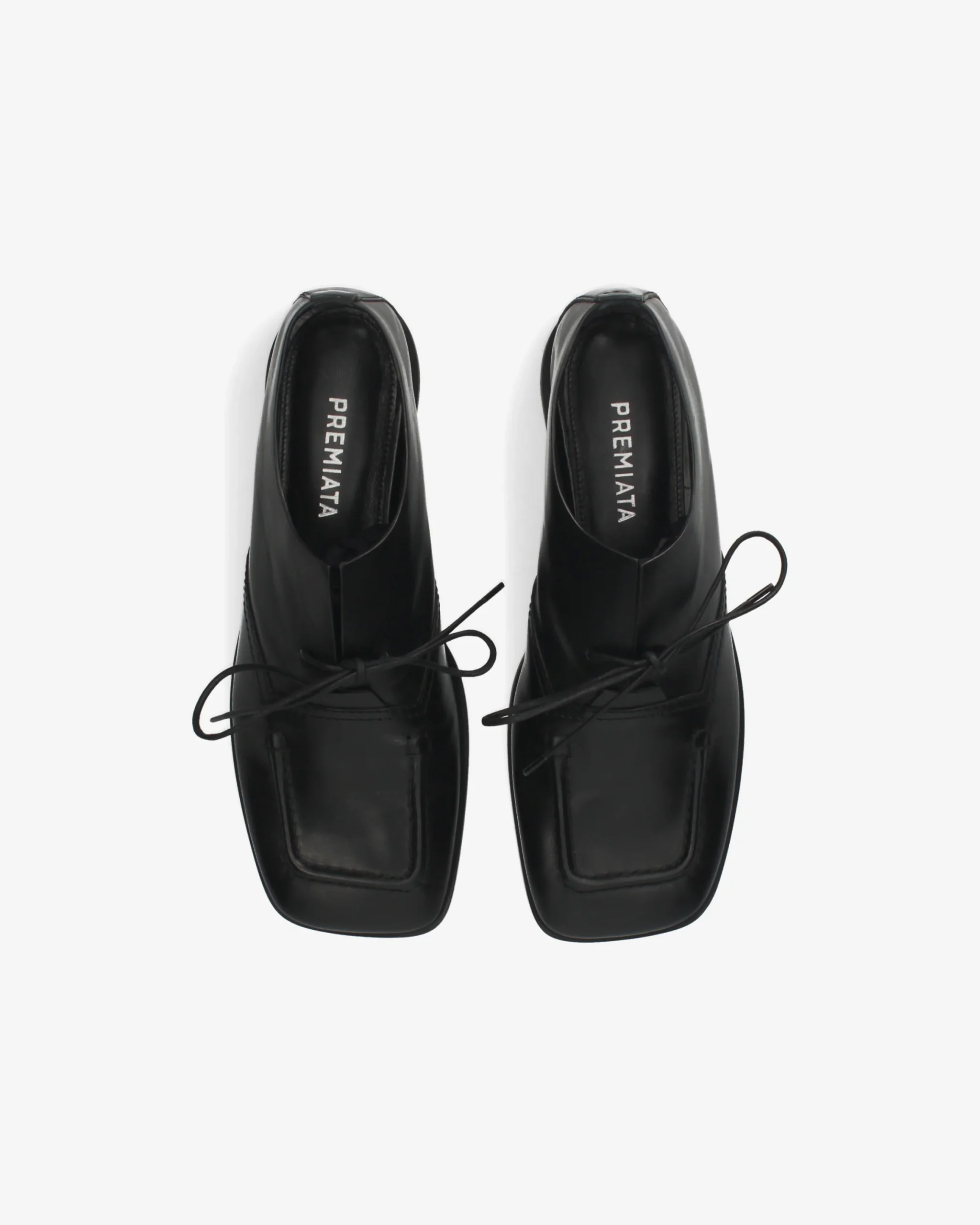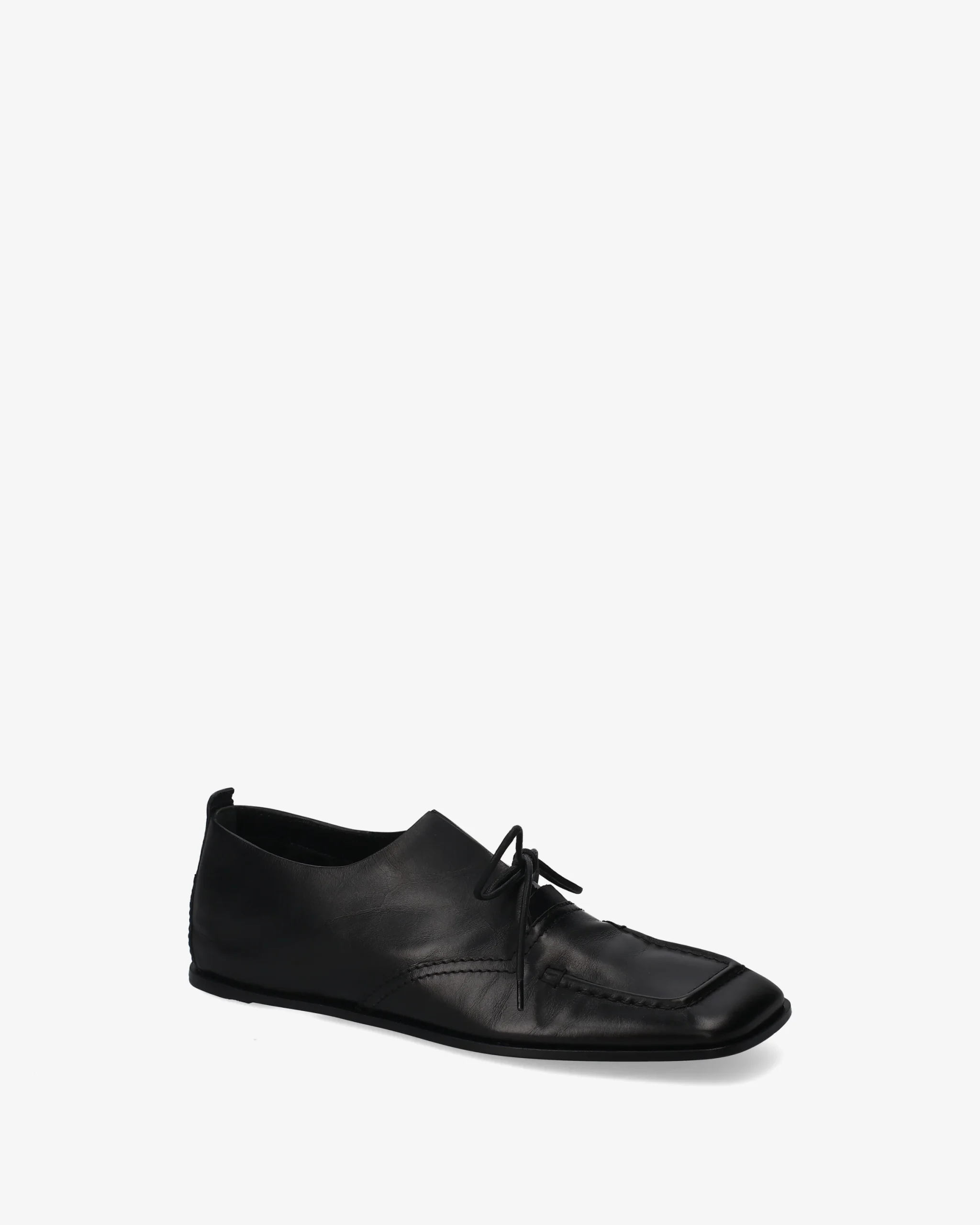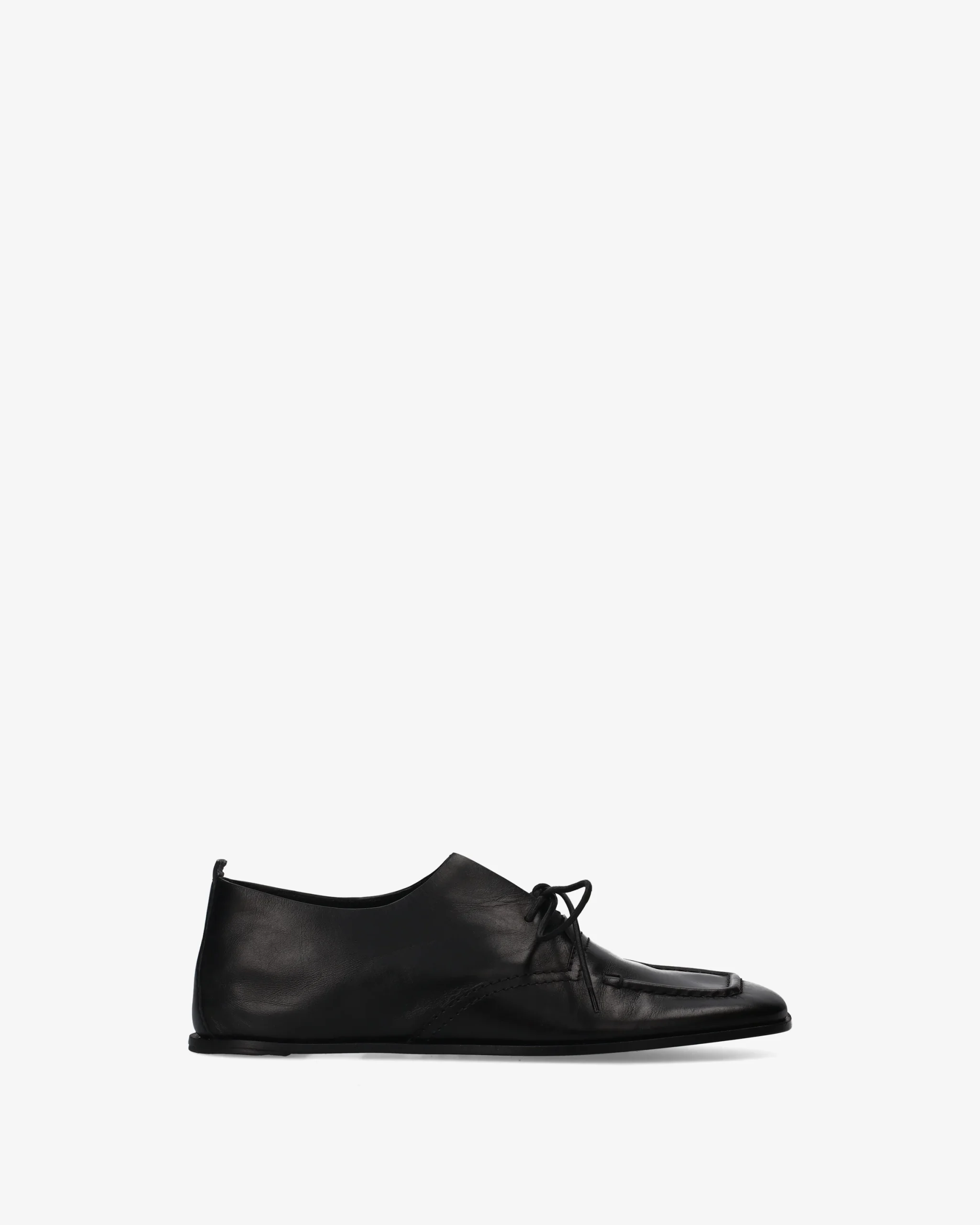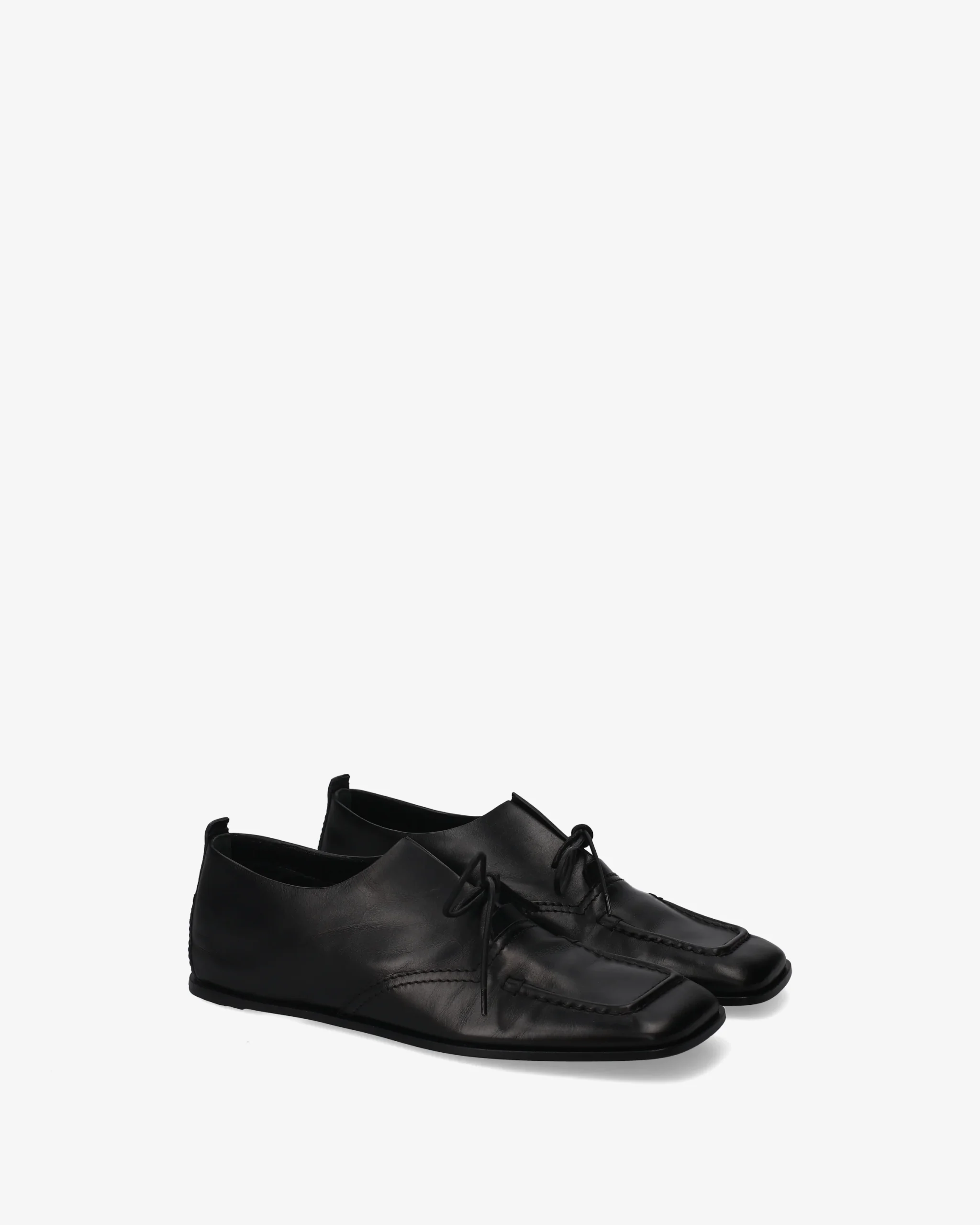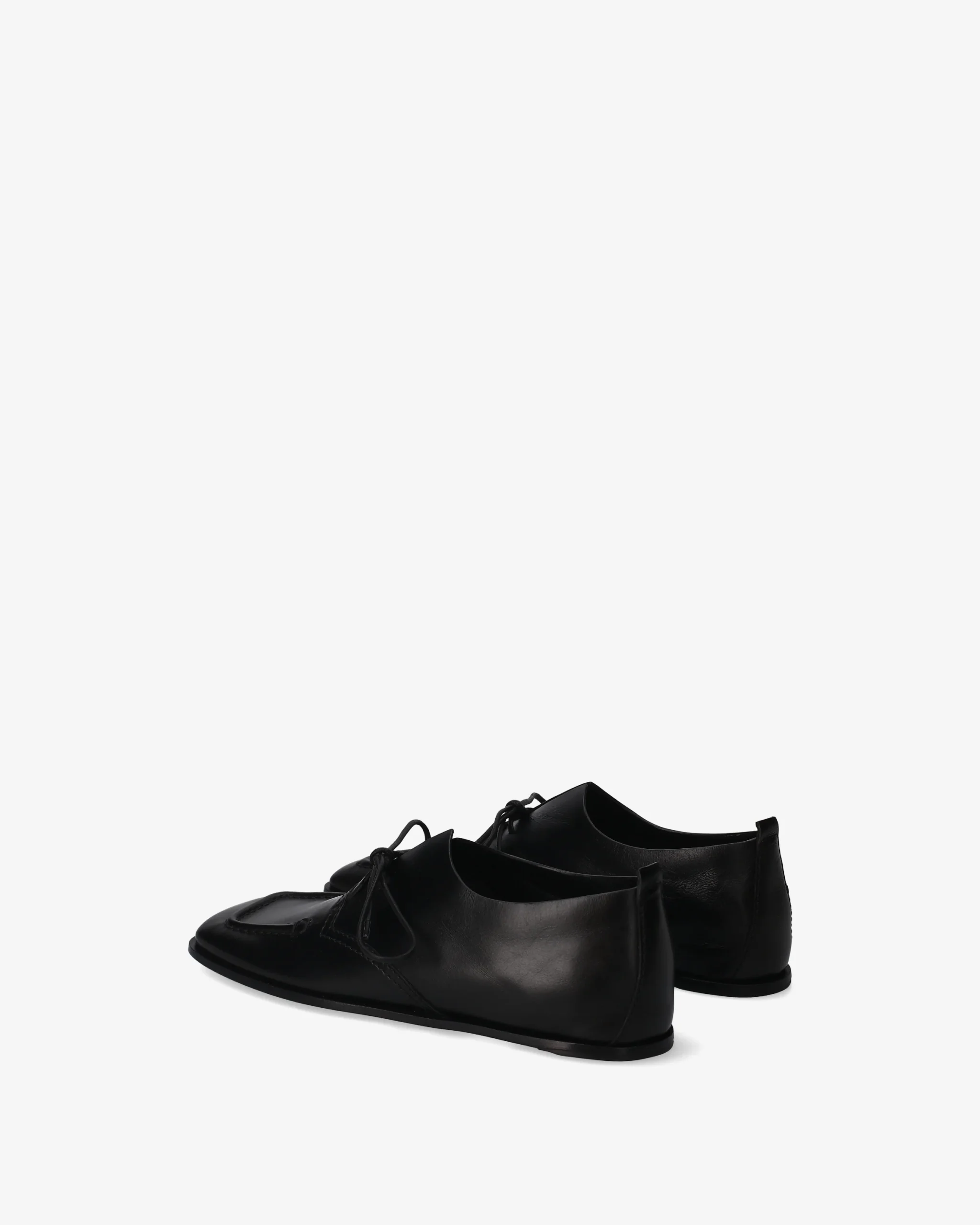 Minimalist lace-up moccasin made from raw-cut calfskin.