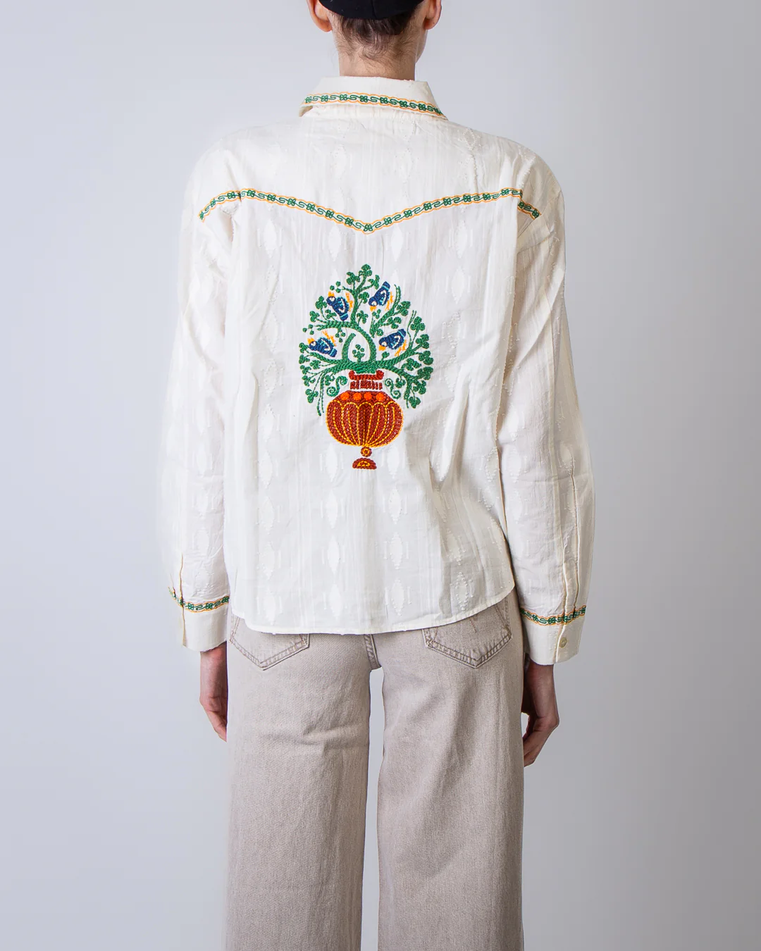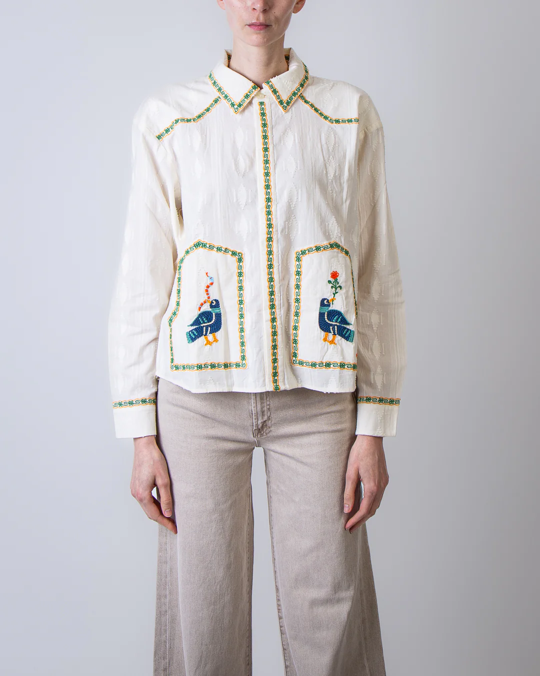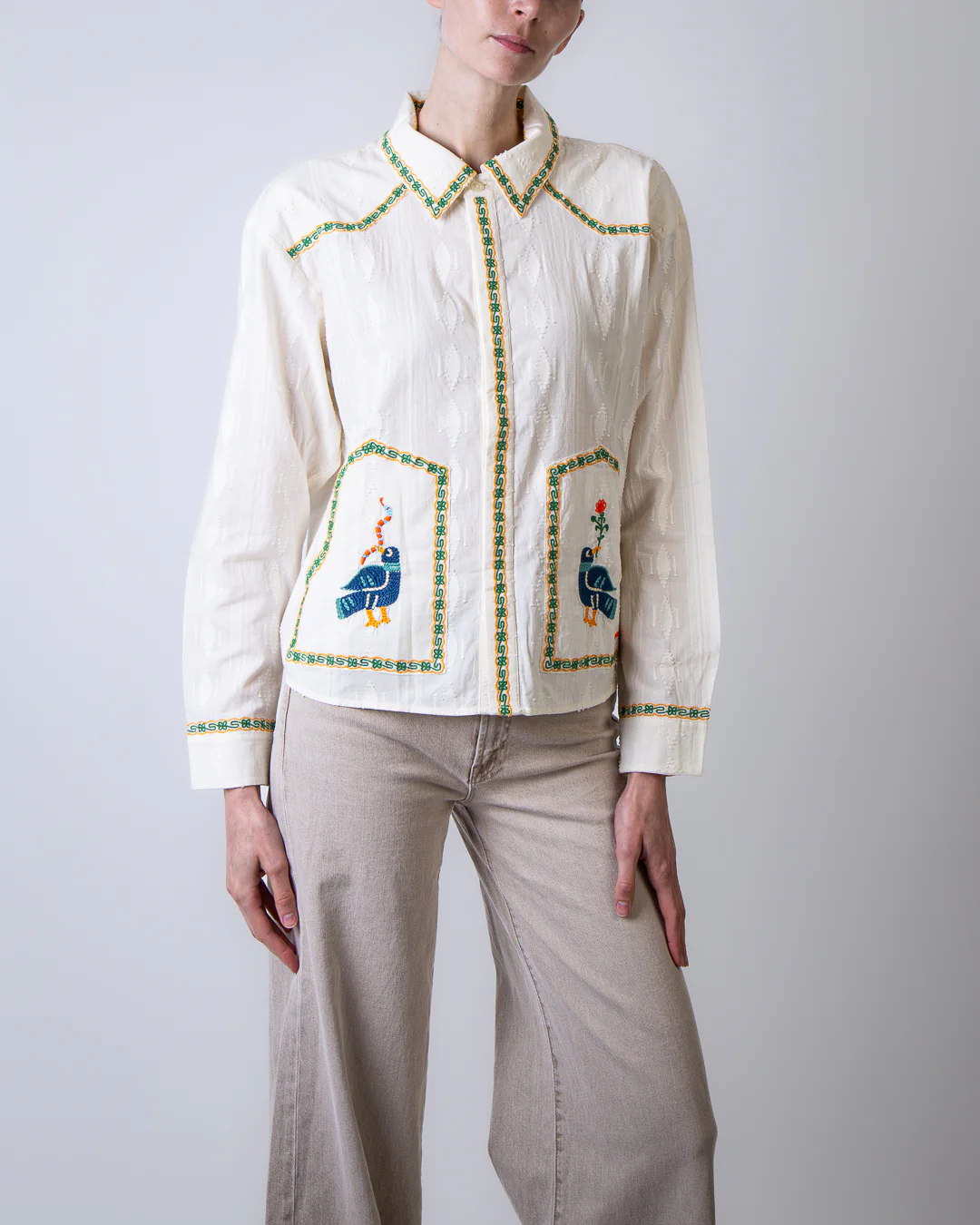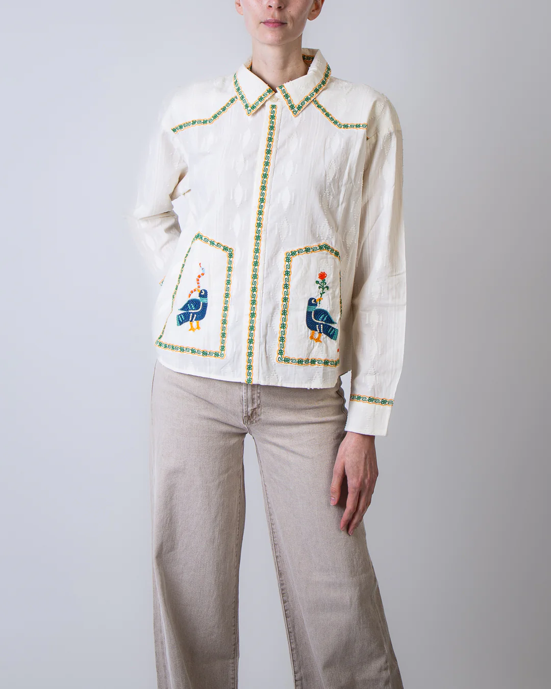 Mother, camicia donna 2614-1834 FAB bianca, camicia folk fable con ricami a mano 100% cotone. La modella รจ alta 175cm e indossa la taglia M