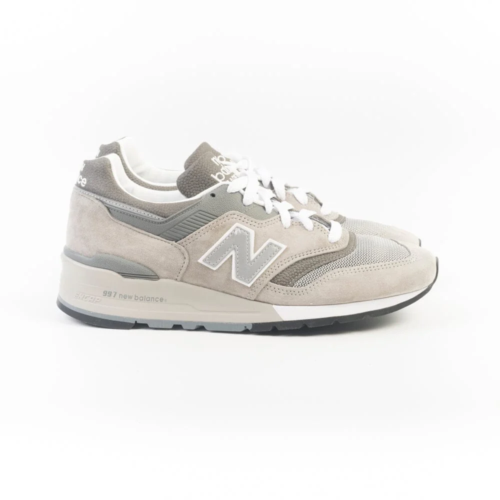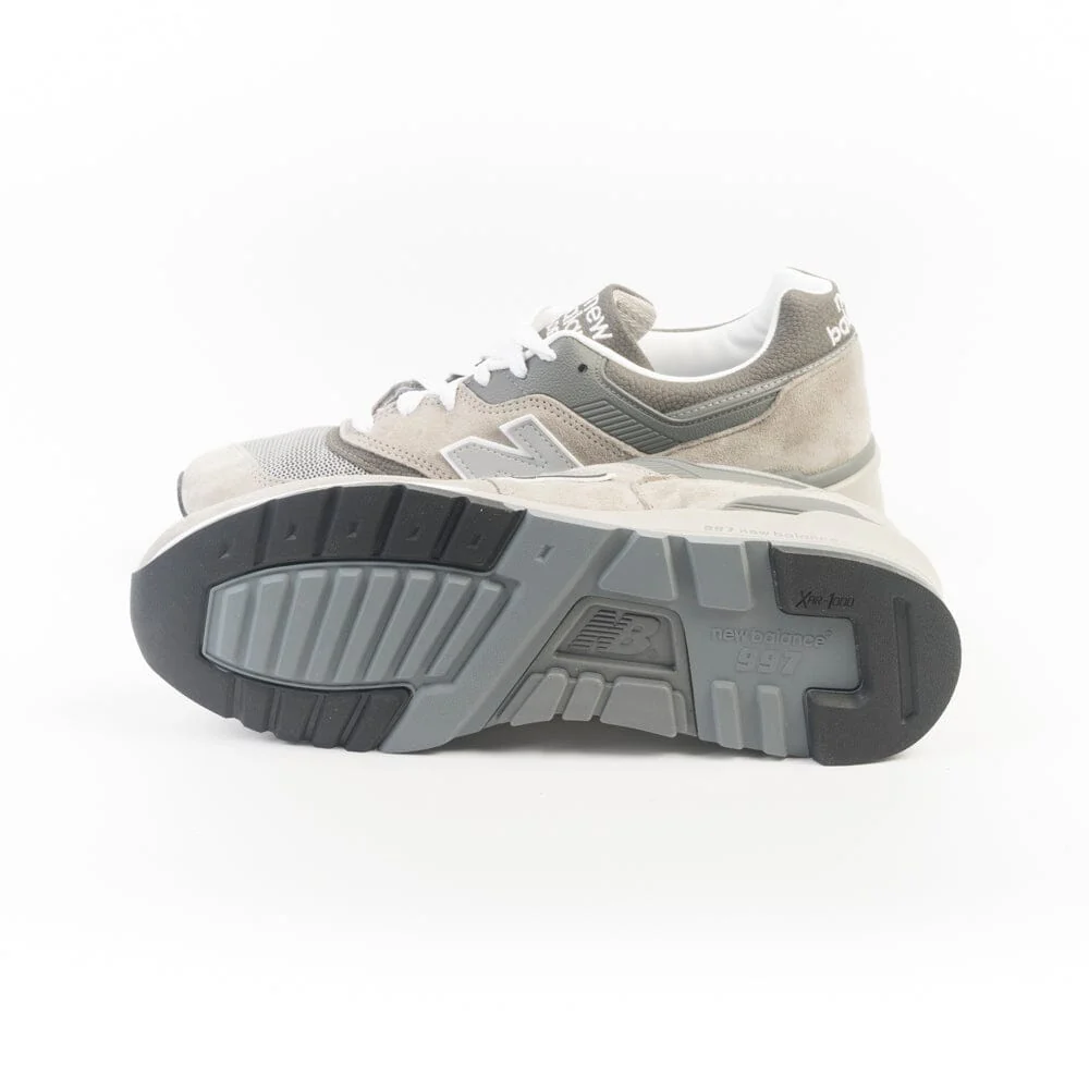 Sneakers serie 997 di New Balance, realizzate in mesh e camoscio nel colore grigio iconico con inserti in pelle martellata di colore grigio scuro. N laterale in pelle di colore grigio. Fondo in gomma grigio. Lacci di cotone bianchi.