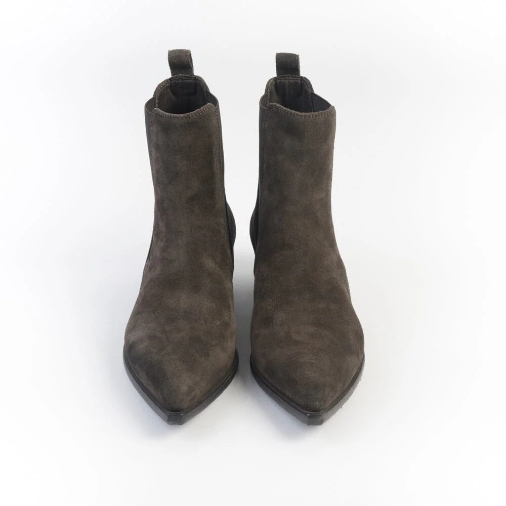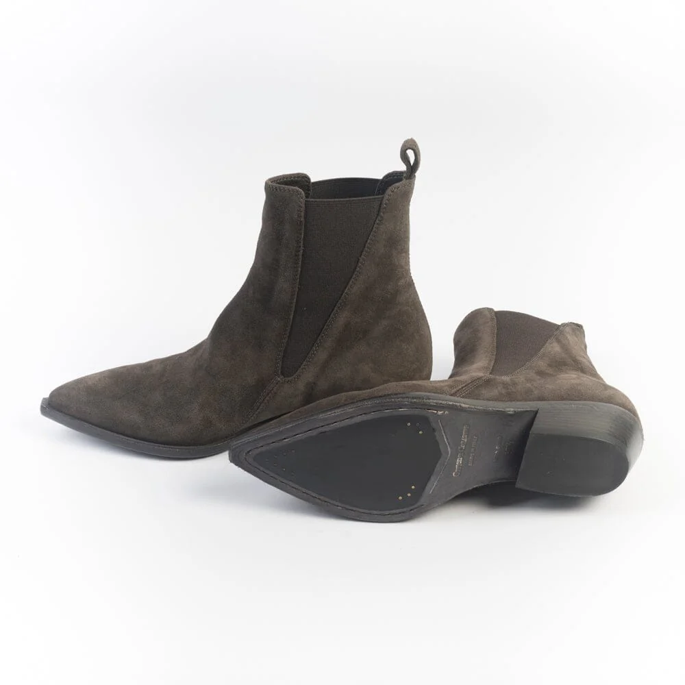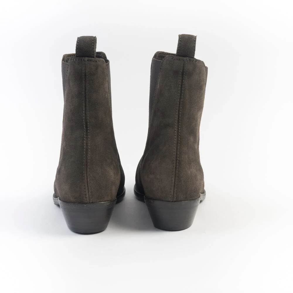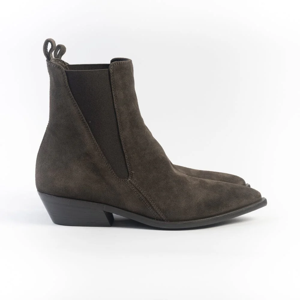 Stivaletto texano di Officine Creative, realizzato in camoscio di colore testa di moro. Elastici lateriali in nuance e asola in camoscio per facilitare la calzata. Interno e sottopiede in pelle, suola in cuoio con inserto in gomma. Tacco leggermente inclinato di 4 cm.