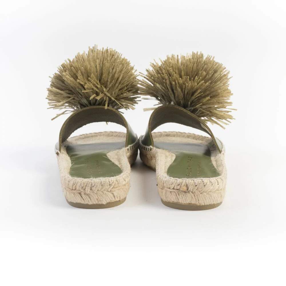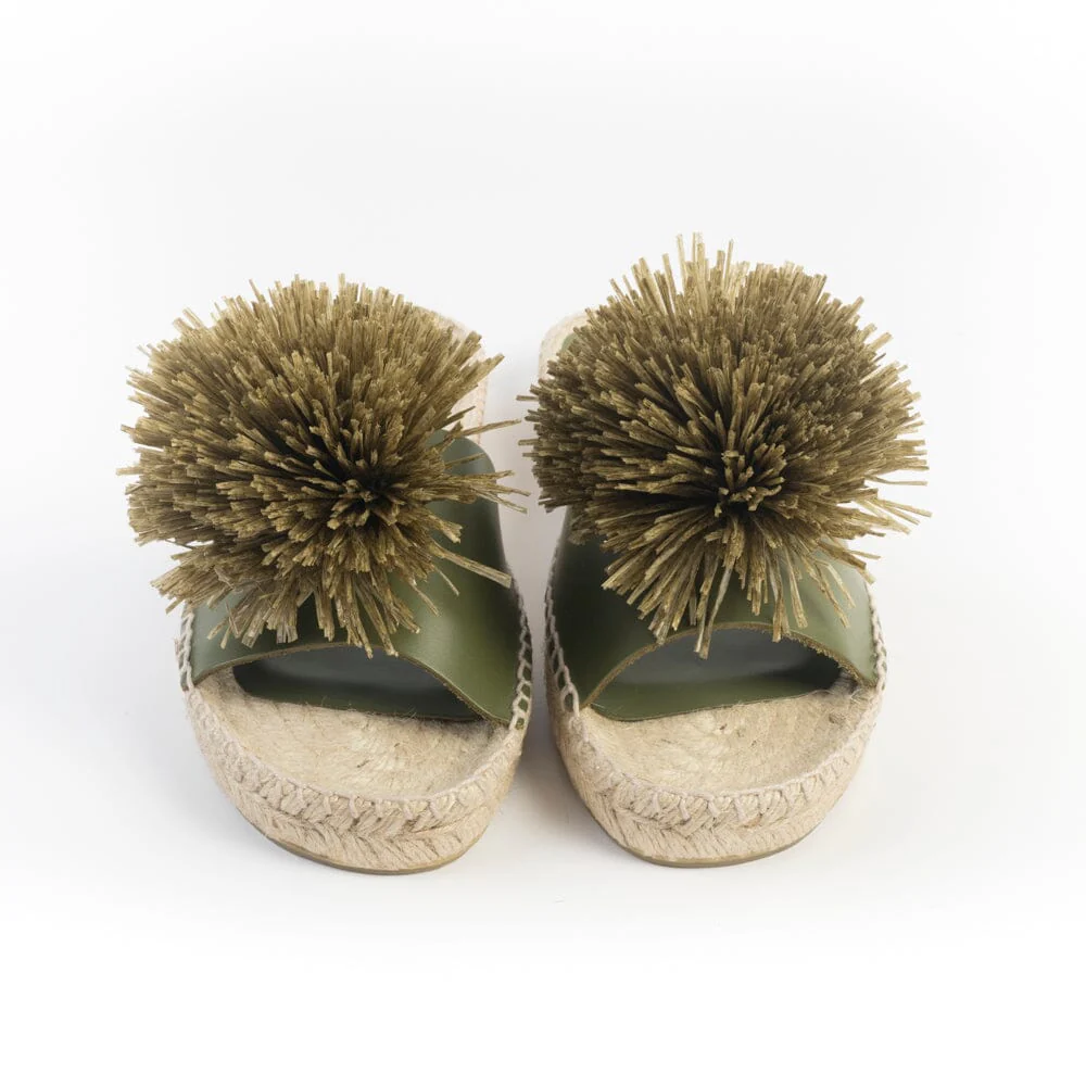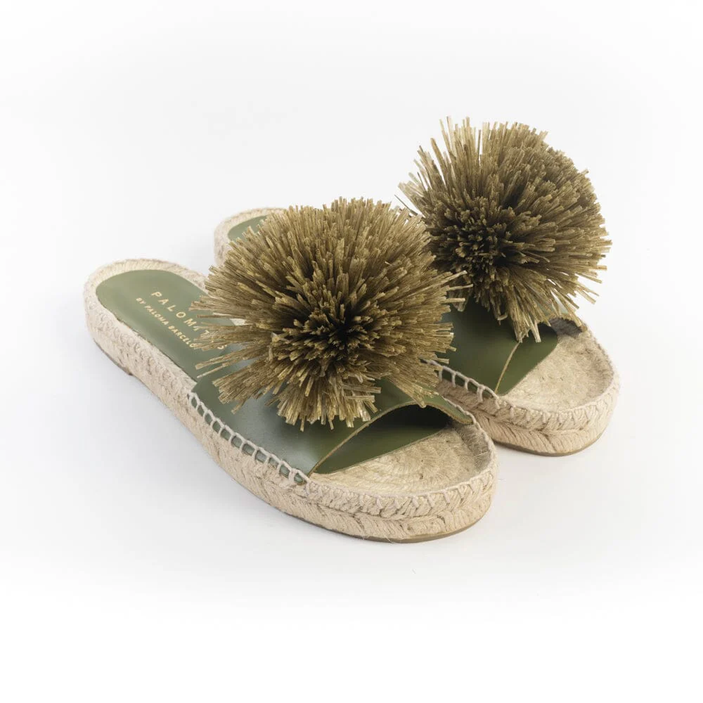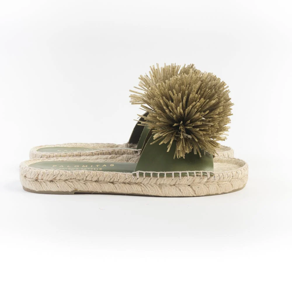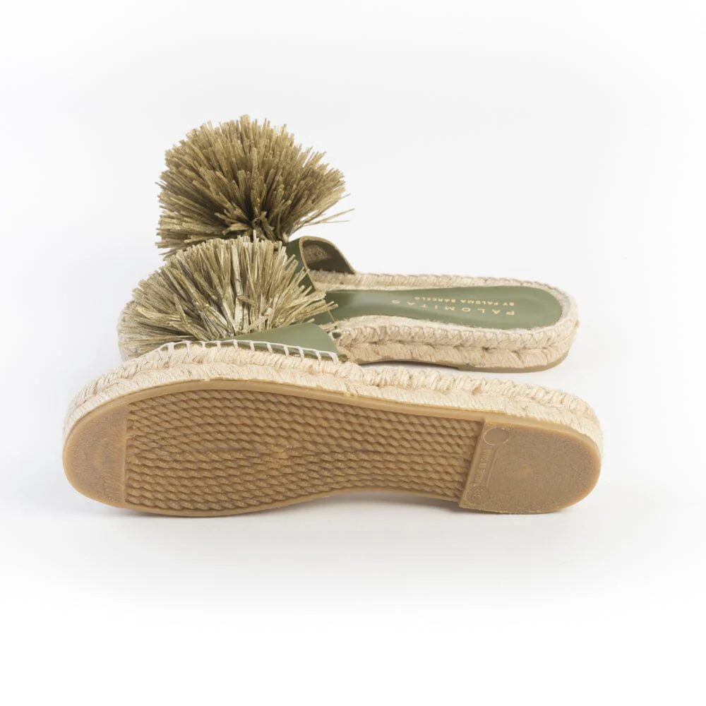Sandalo mule di Palomitas realizzato in morbida pelle di colore verde kakhi, con originale decorazione a pon pon in rafia sull’avampiede. Sottopiede in pelle. Suola in corda naturale in nuance di 2 centimetri. Fondo gomma