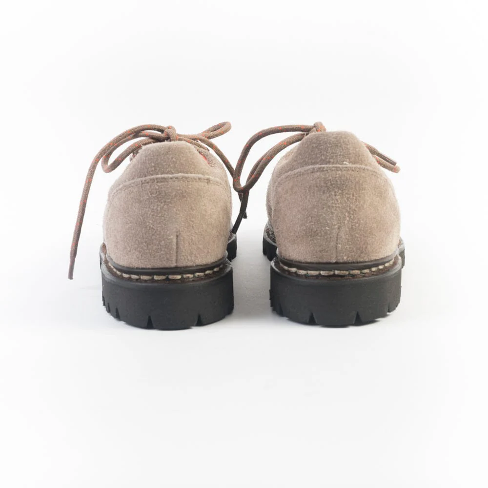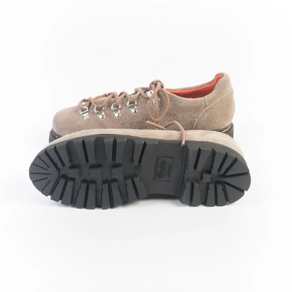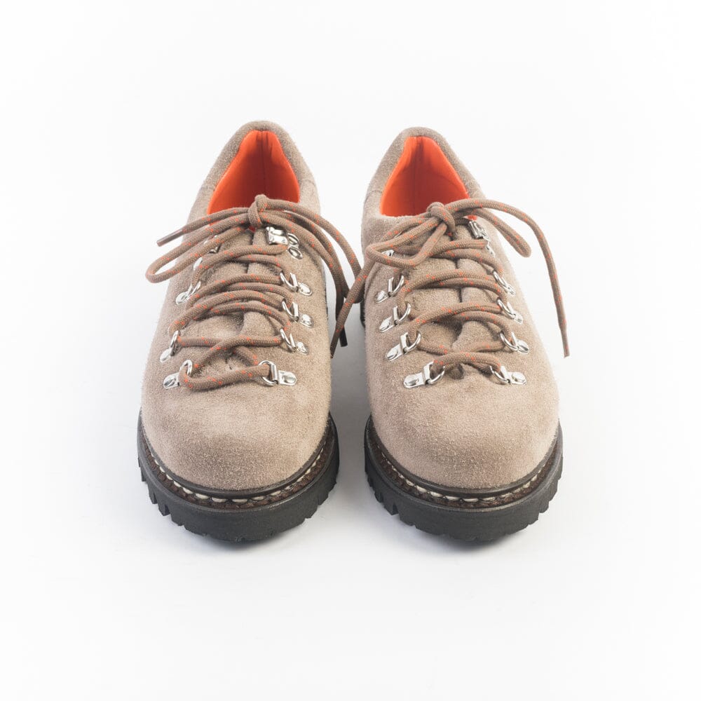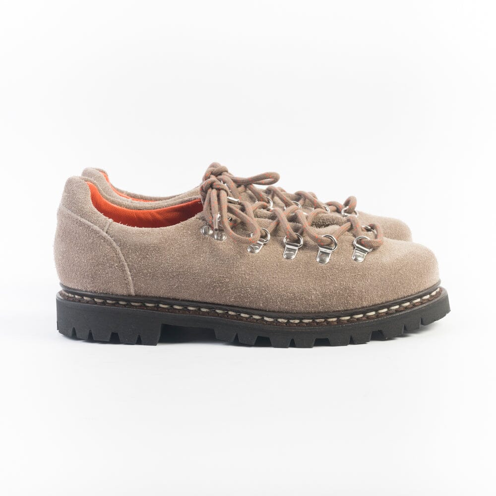 Pedula bassa Clusaz Jannu di Paraboot realizzata in pelle scamosciata di colore beige. Chiusura tramite cinque passanti con ganci in metallo e lacci in cotone spesso in nuance. Doppia impuntura che tiene insieme la tomaia e la suola, assicurando resistenza e assoluta impermeabilitร . Fodera interna in pelle di colore arancione. Autentiche suole Paraboot in gomma.