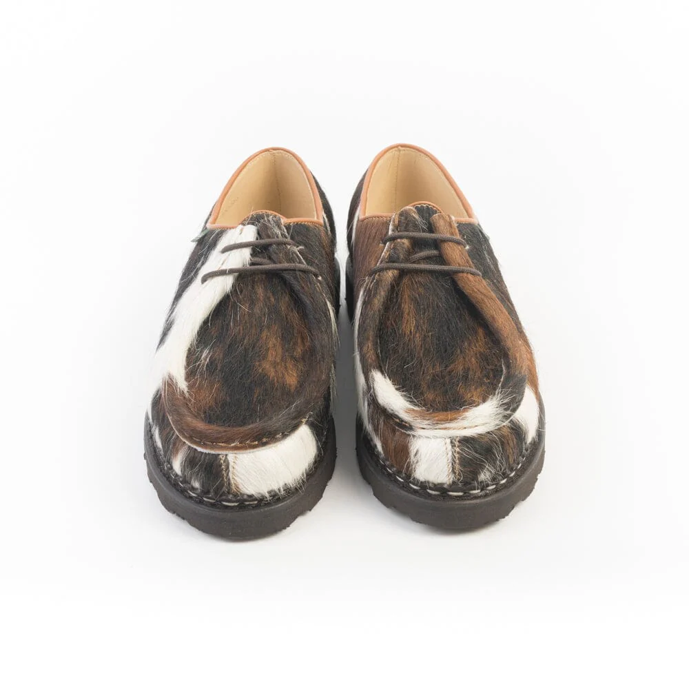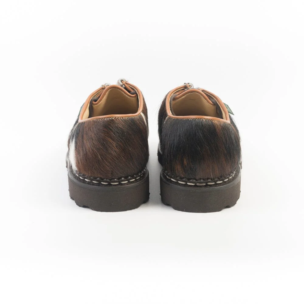 Iconico Derby Michael di Paraboot in pelo rasato su base bovina di colore marrone/bianco (a seconda del numero, puรฒ assumere una colorazione diversa sino ad essere quasi completamente bianca. Questo dipende appunto dal taglio del pellame nella macchia colore del pelo naturale). Doppia cucitura norvegese che tiene insieme la tomaia e la soletta, assicurando resistenza e assoluta impermeabilitร . Fodera interna in pelle. Morbidi lacci in cotone. Autentiche suole Paraboot in gomma naturale.