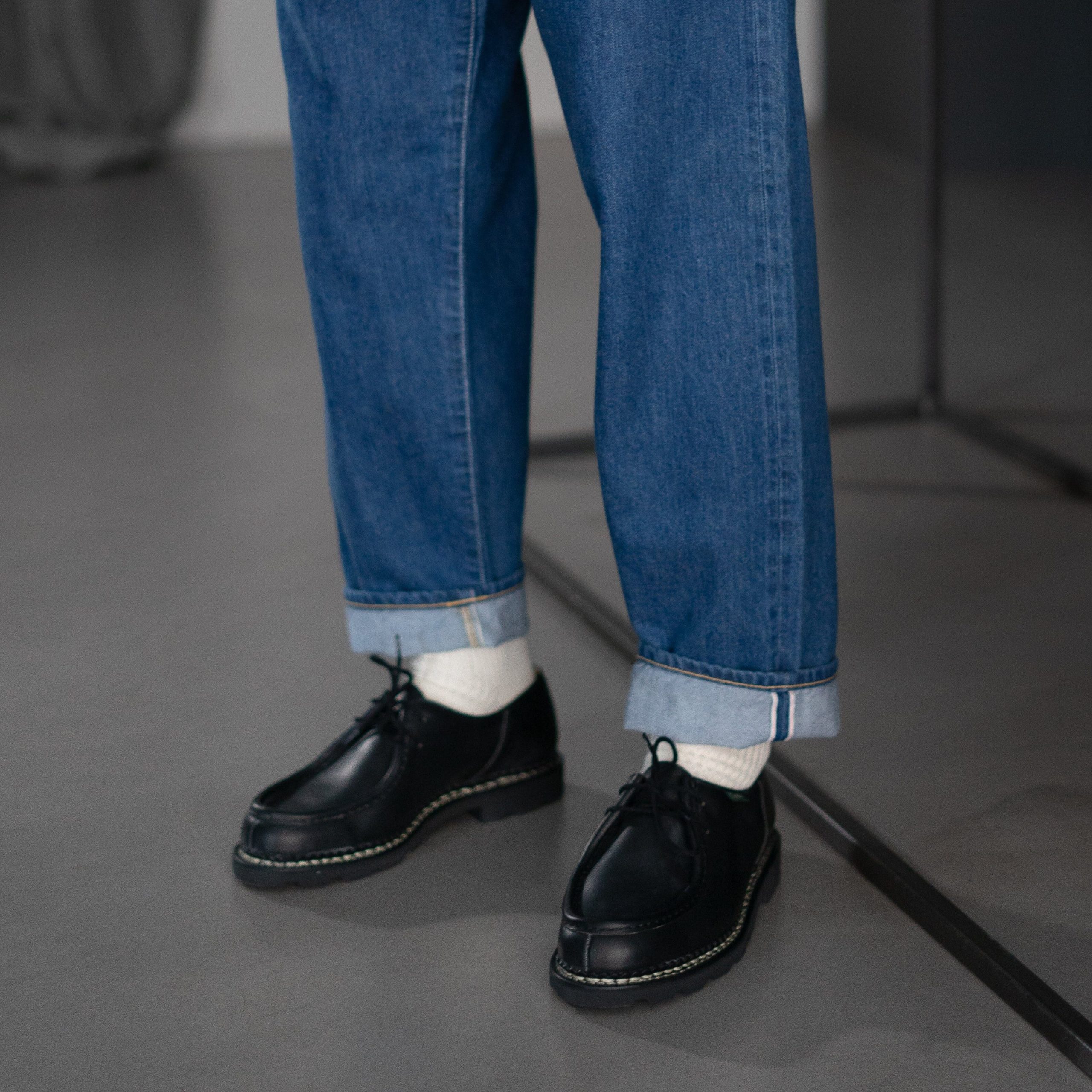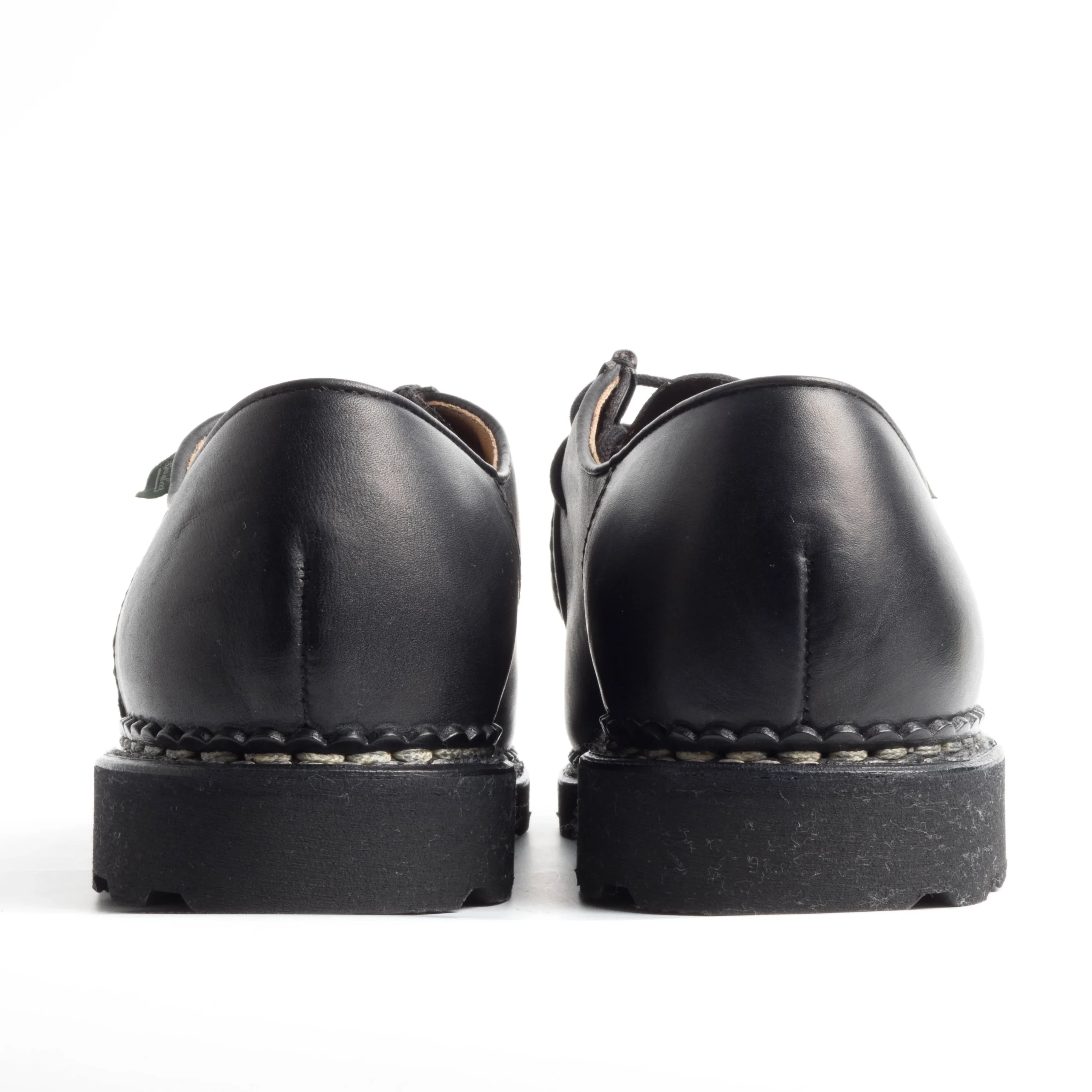 Iconico Derby Michael / Marche II Paraboot in pregiata pelle conciata al vegetale di colore nero con costruzione norvegese. Doppia impuntura che tiene insieme la tomaia e la soletta, assicurando resistenza e assoluta impermeabilitร . Fodera interna in pelle. Morbidi lacci in cotone. Autentiche suole Paraboot in gomma.