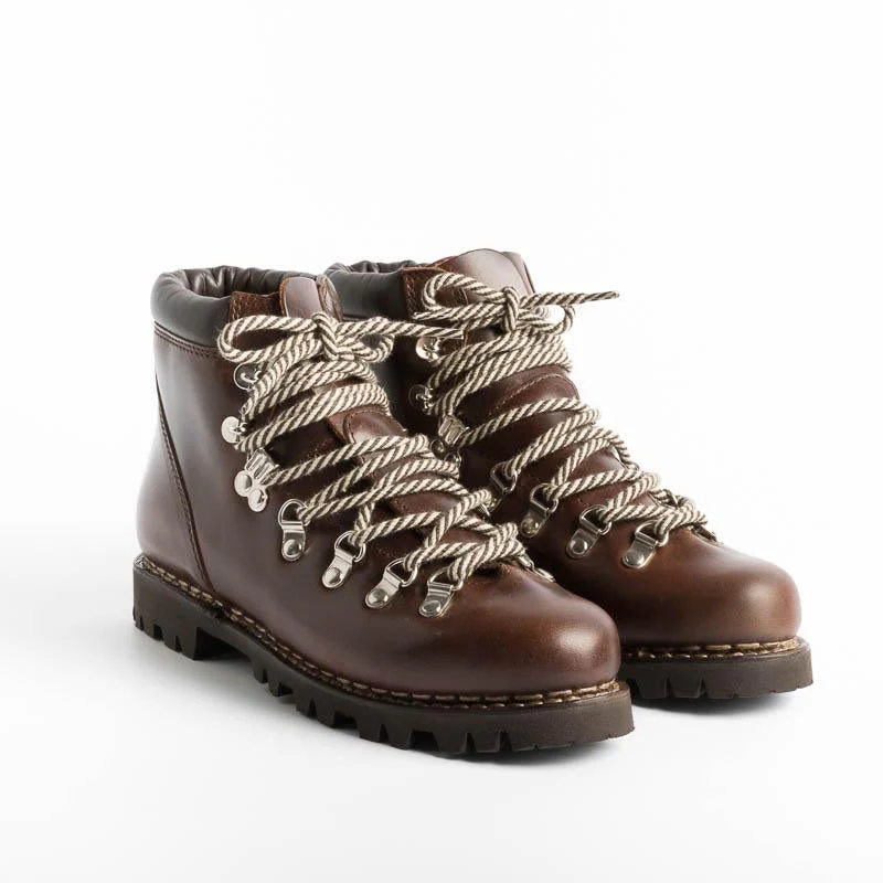 Pedula Avoriaz di Paraboot realizzato in pregiata pelle conciata al vegetale di colore marrone. Chiusura tramite quattro passanti e tre ganci con lacci in cotone. Doppia impuntura che tiene insieme la tomaia e la suola, assicurando resistenza e assoluta impermeabilitร . Fodera interna in pelle. Autentiche suole Paraboot in gomma.