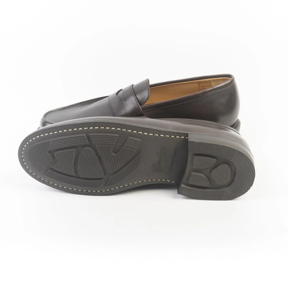 Mocassino con mascherina di Paraboot, realizzato in pregiata pelle di vitello liscia semi lucida di colore testa di moro. Fodera interna in pelle. Autentiche suole Paraboot in gomma cucite.