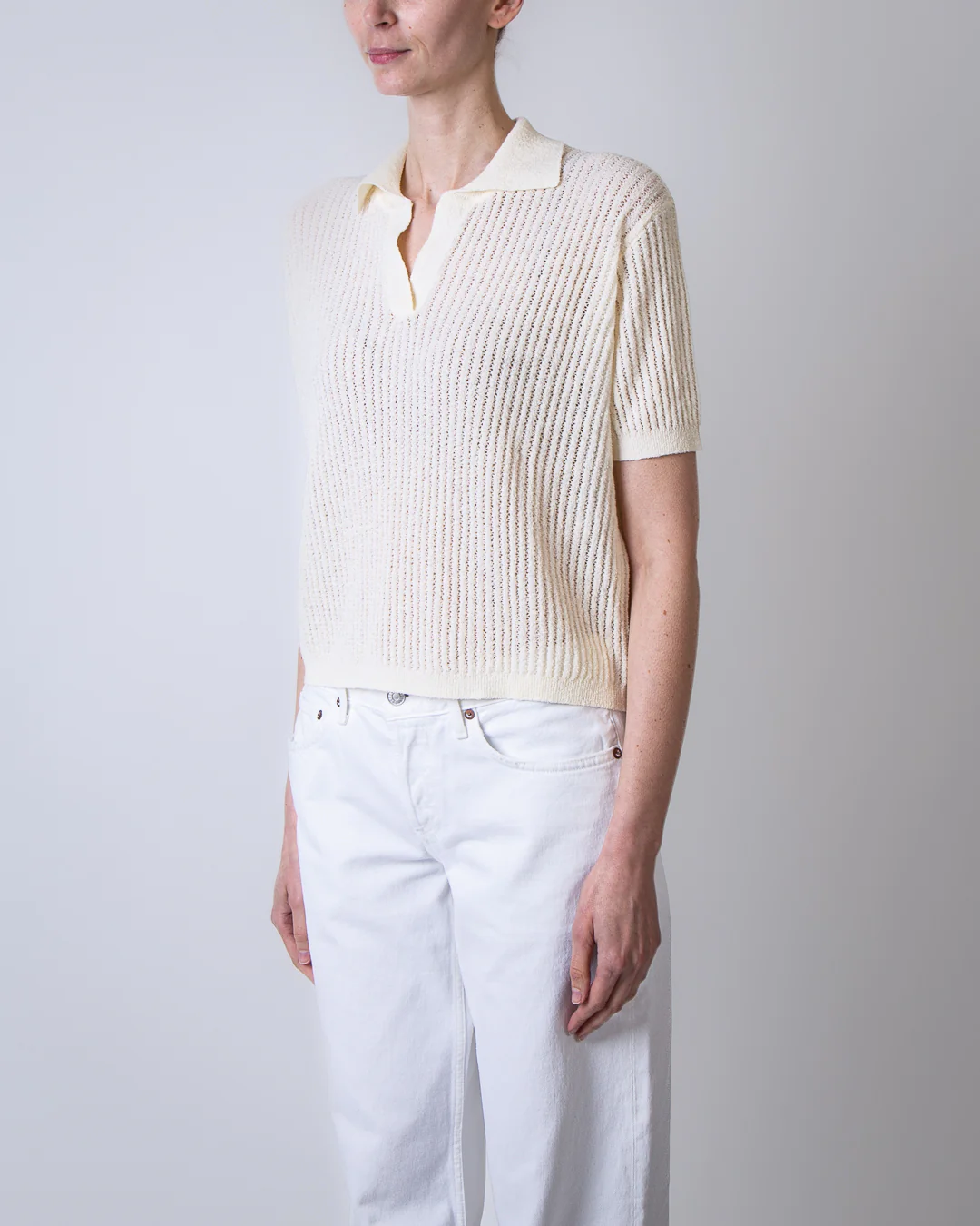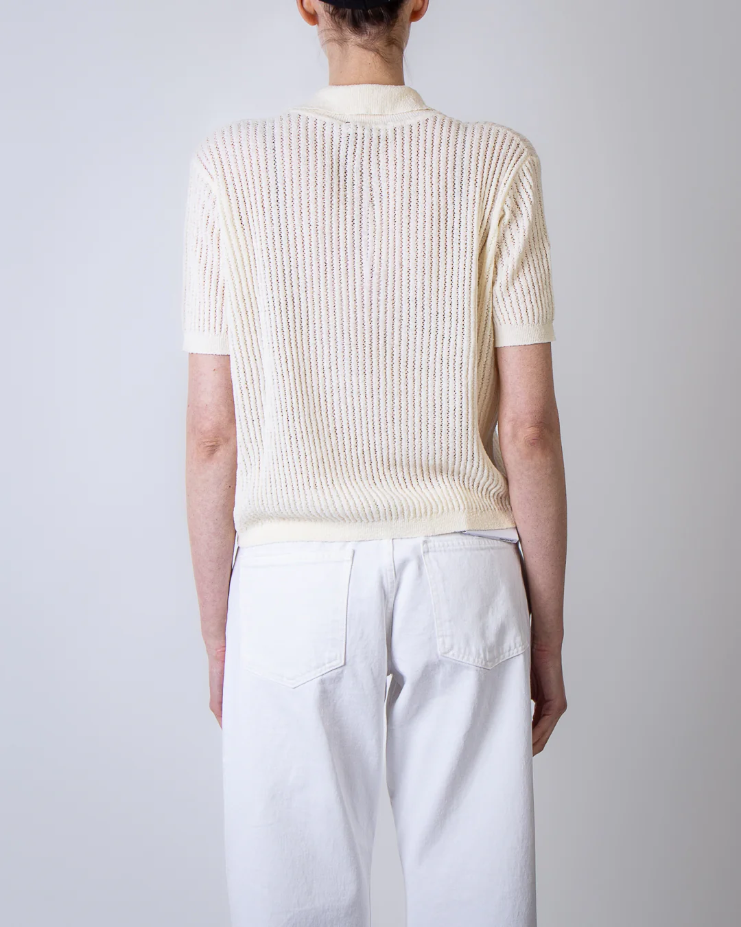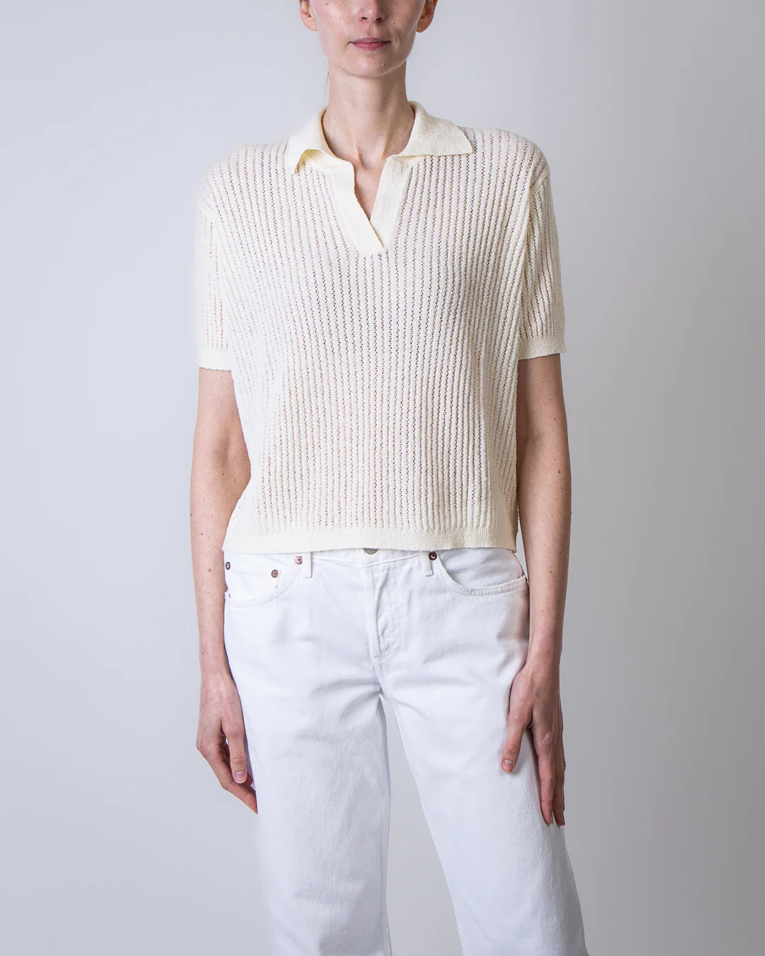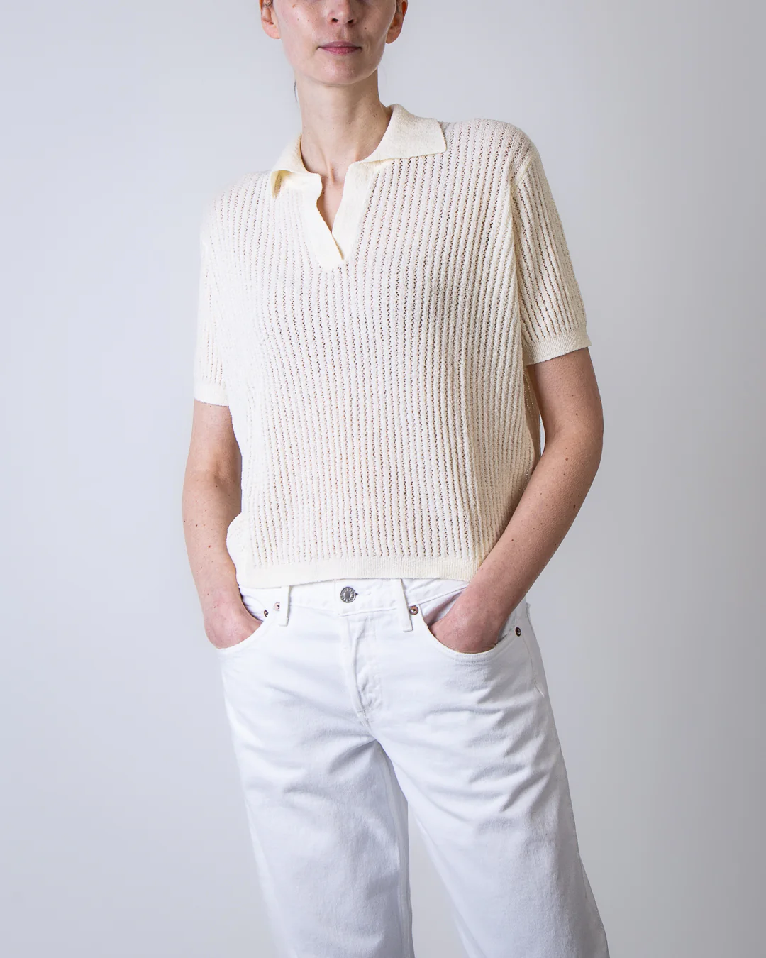 Roberto Collina, maglia donna F20024 02 beige, polo traforata manica corta 70%cotone 30%poliammide. La modella รจ alta 175cm e indossa la taglia S