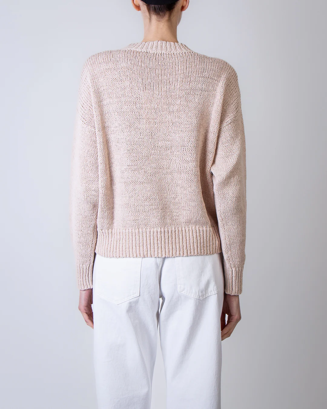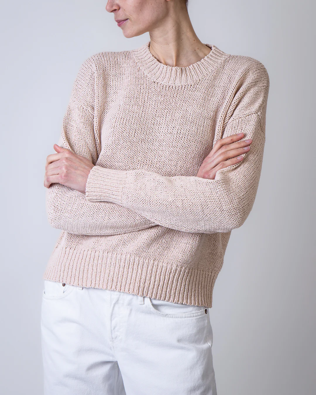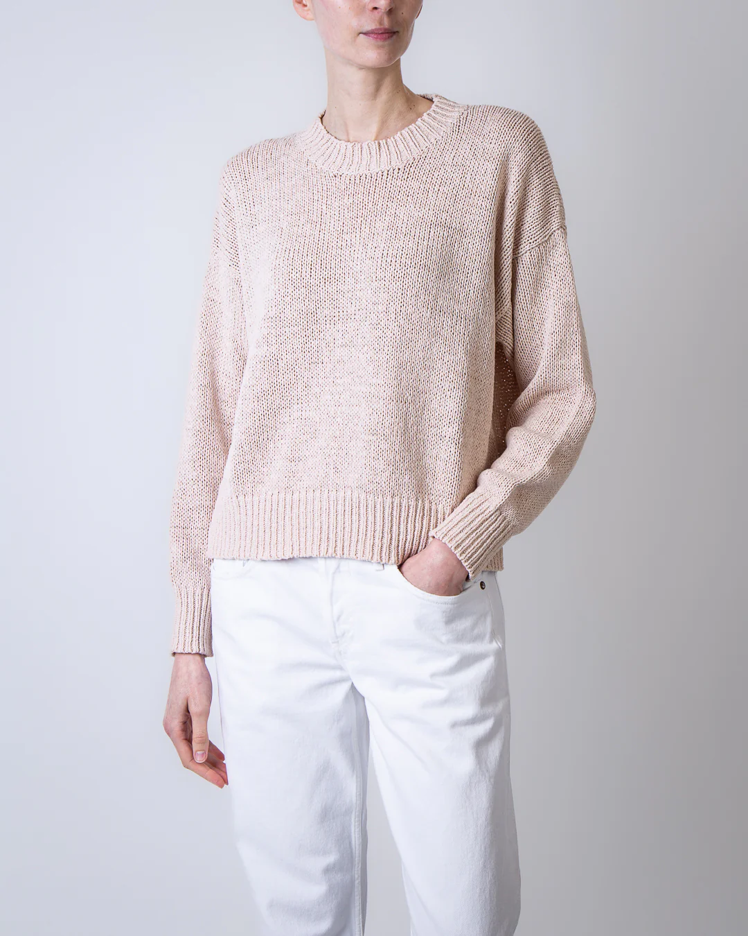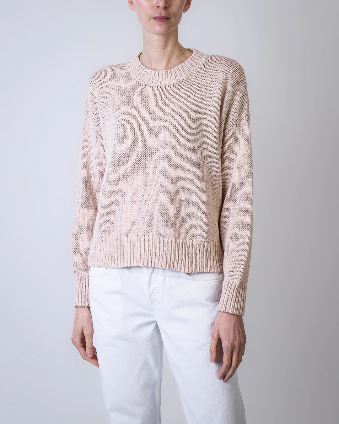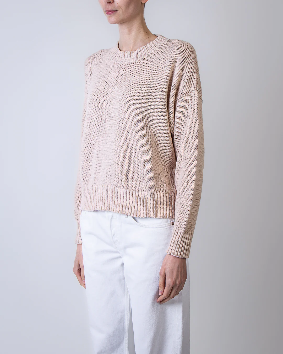 Roberto Collina, maglia donna F41001 03 beige, girocollo manica lunga 66% cotone 34% poliammide. La modella รจ alta 175cm e indossa la taglia M