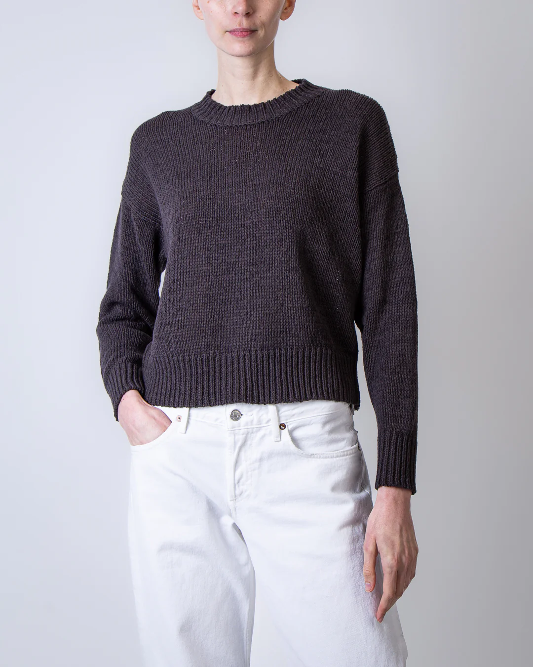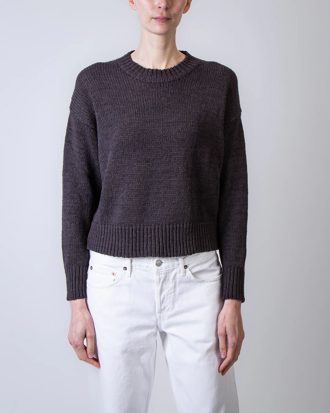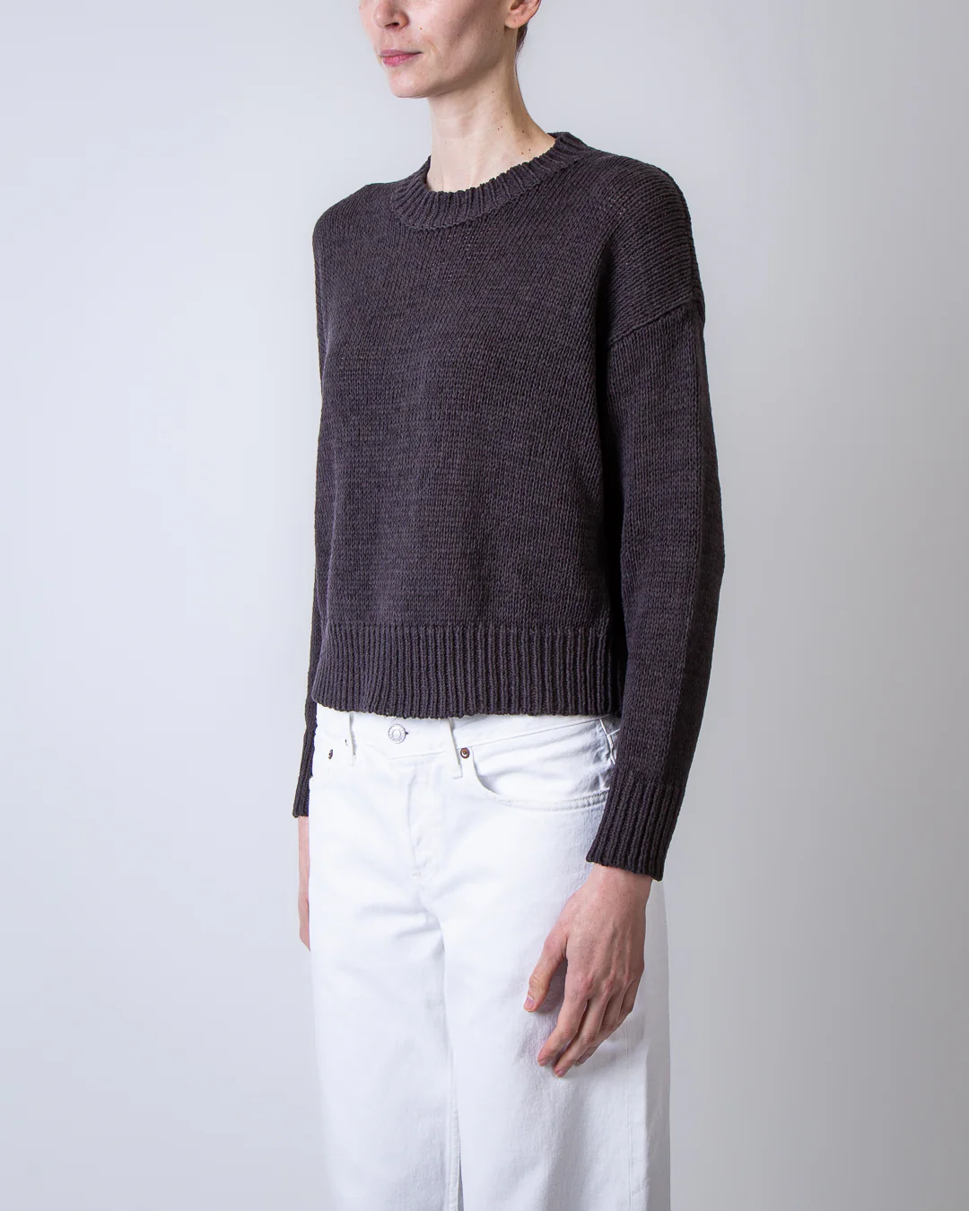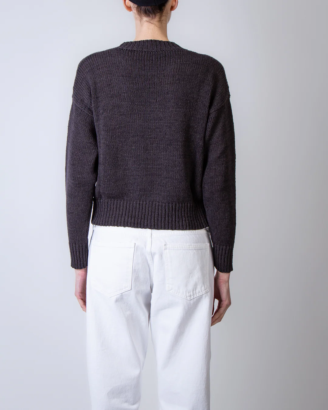 Roberto Collina, maglia donna F41001 08 marrone, girocollo manica lunga 66% cotone 34%poliammide. La modella รจ alta 175cm e indossa la taglia S