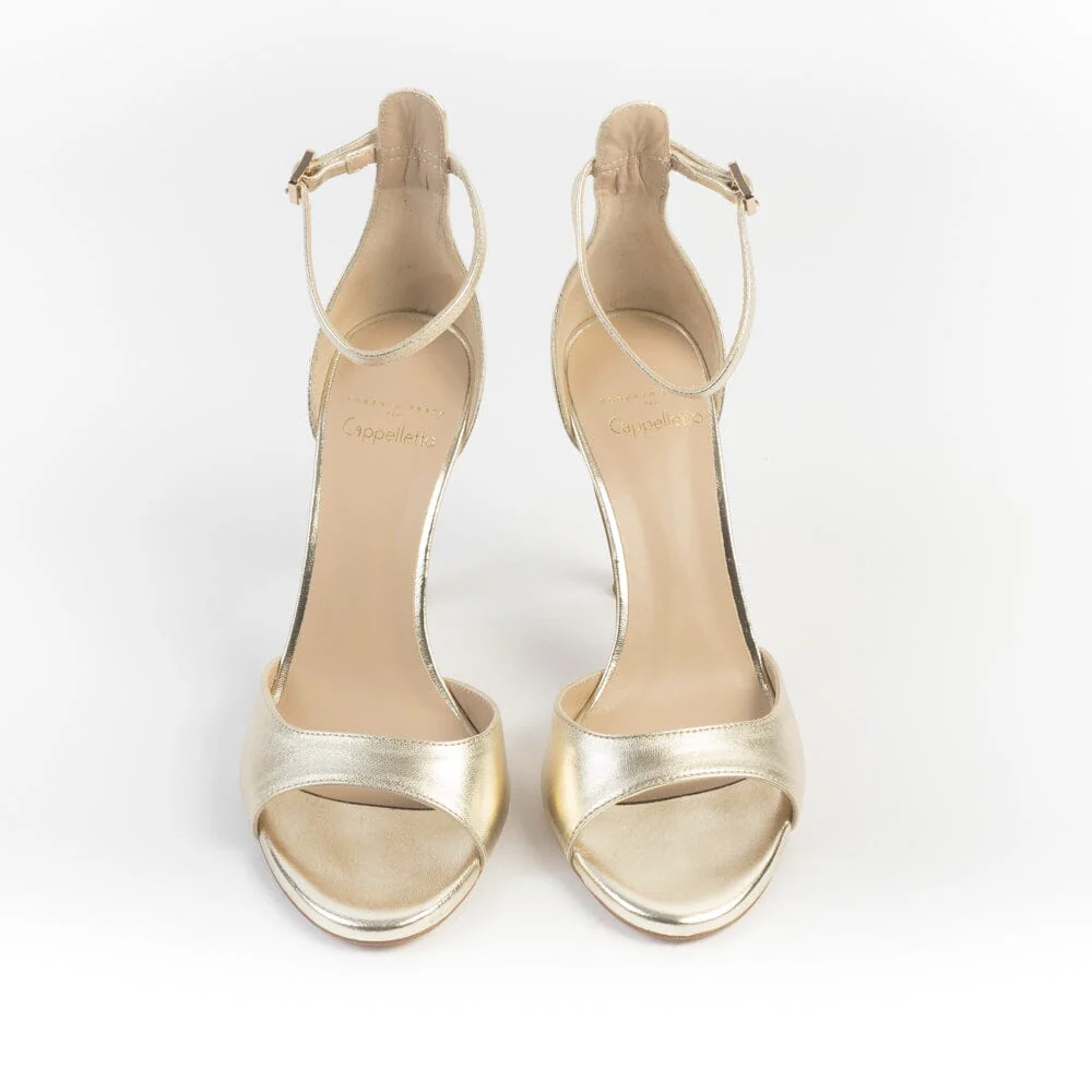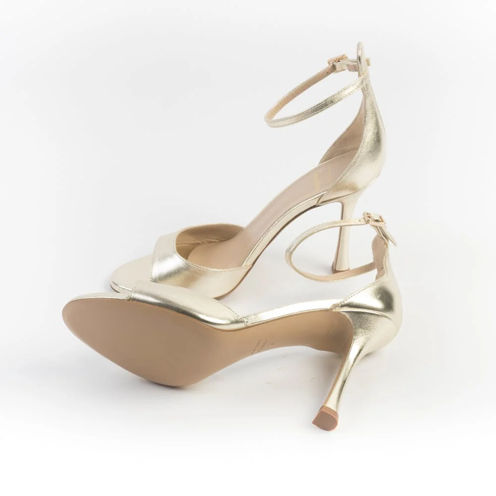 Sandalo a fascia di Roberto Festa, realizzato in pelle laminata di colore platino. Fodera interna e sottopiede in pelle. Chiusura con allacciatura alla caviglia. Tacco di 10 cm circa, tallone chiuso. Suola in cuoio. Realizzato anche nel colore argento. Lavorazione artigianale. Calzata regolare Realizzato in Italia Guida taglie Per maggiori informazioni sulla calzata contattaci>