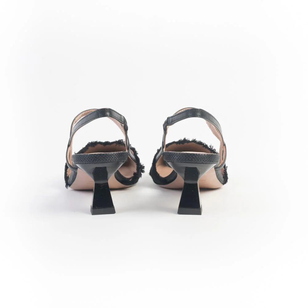 Sling Back a punta di Roberto Festa, realizzate in rafia di colore nero con due fasce accavallate in tessuto rigato e sfrangiato. Cinturino con elastico alla caviglia e sul collo del piede. Fodera interna e sottopiede in pelle. Tacco rocchetto in nuance, di cm 6 circa. Suola in cuoio.