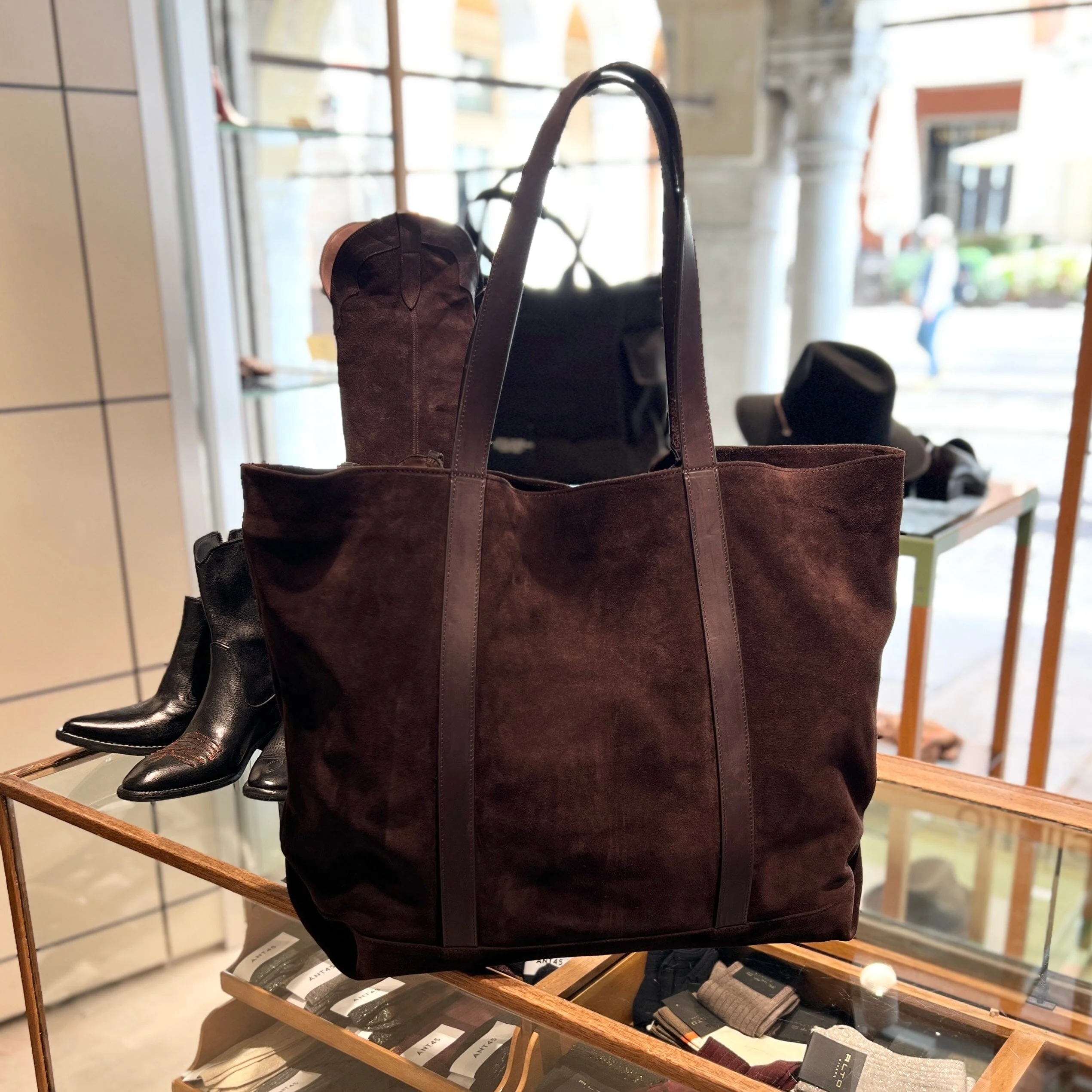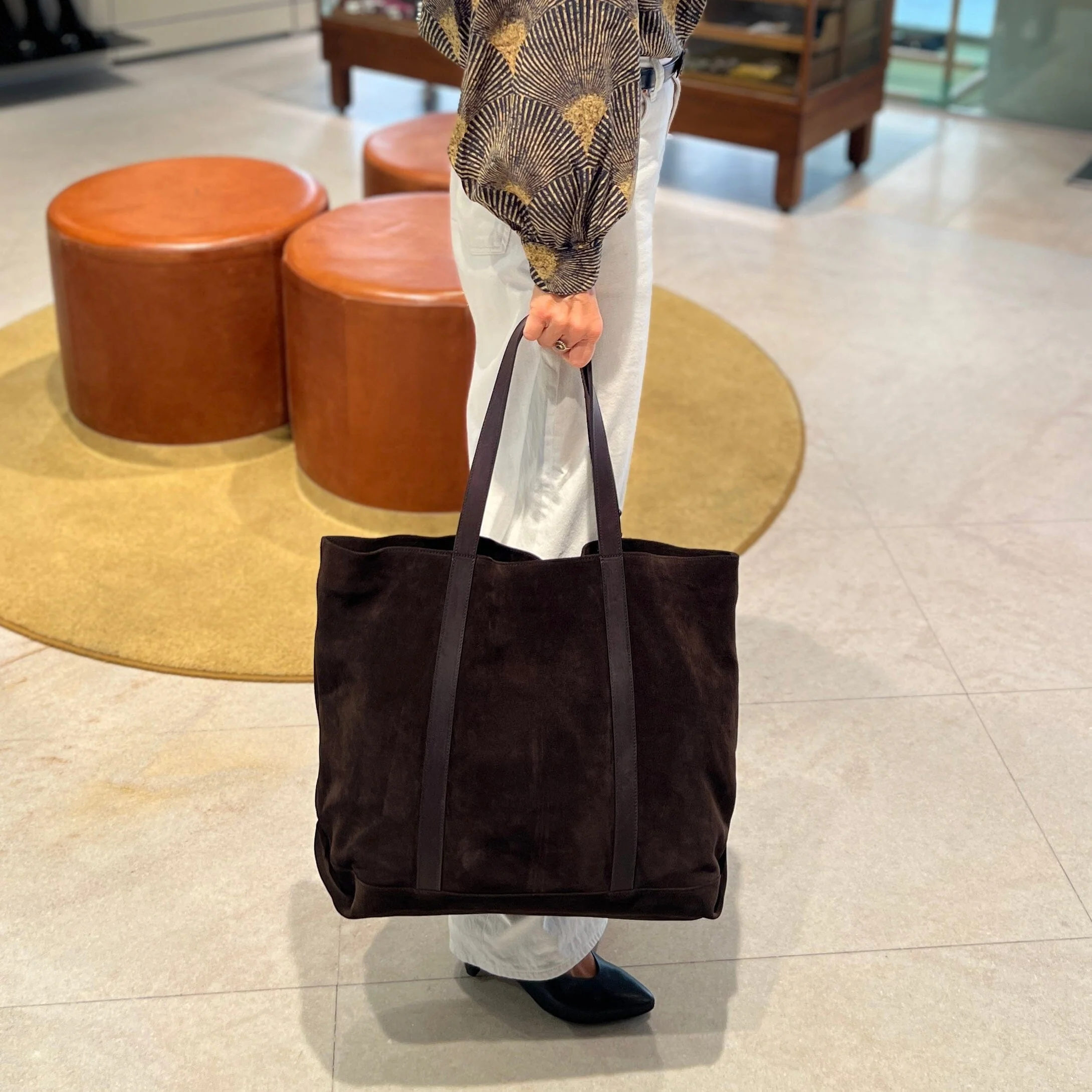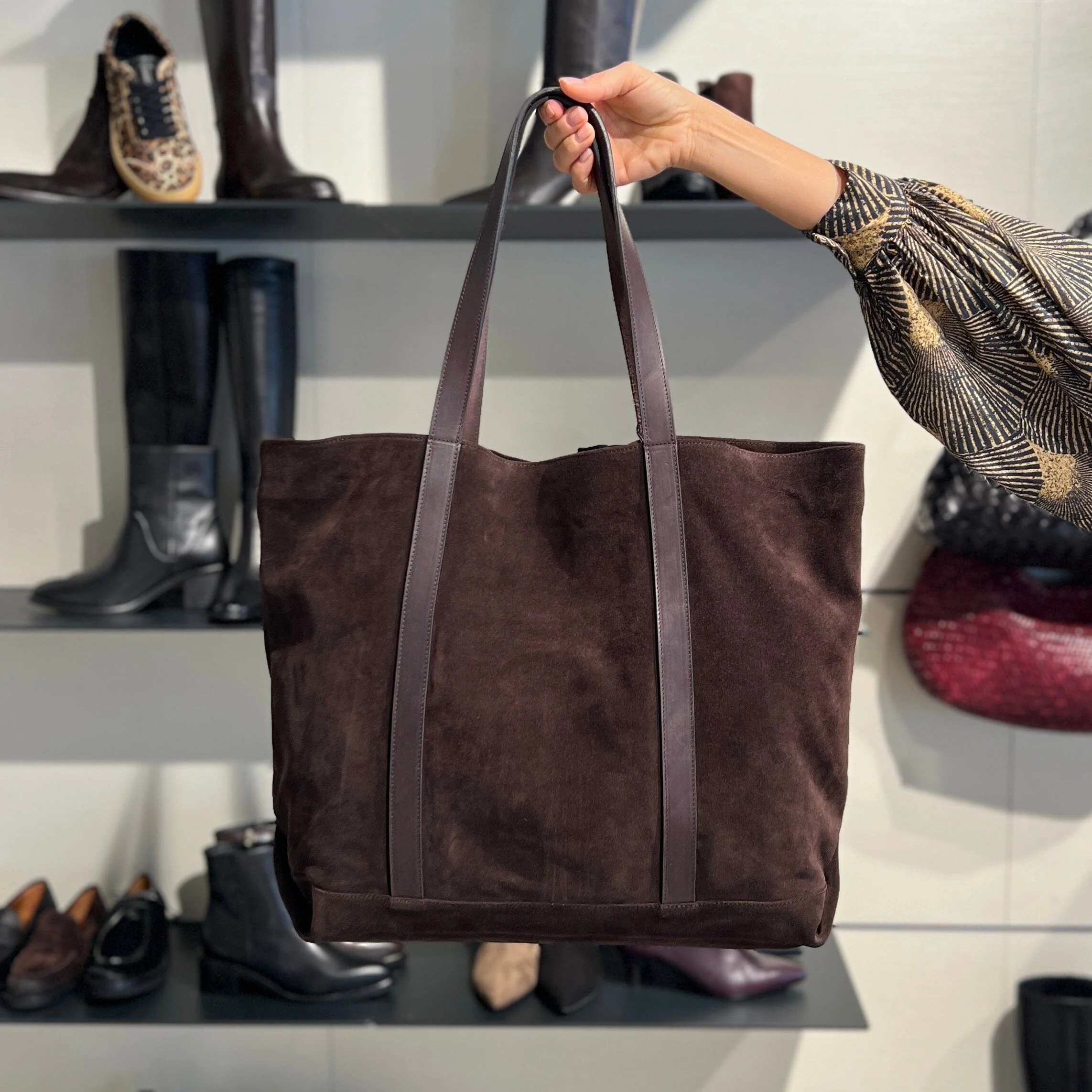 Borsa a spalla di Sachet realizzata in pregiato camoscio di colore moro. Foderata internamente in tessuto logato con taschino chiuso da zip. Doppi manici in vacchetta, in nuance, per essere portata a spalla Sacca anti-polvere. Misure indicative: 50x 42 x 20 cm Lavorazione artigianale Realizzata in Italia