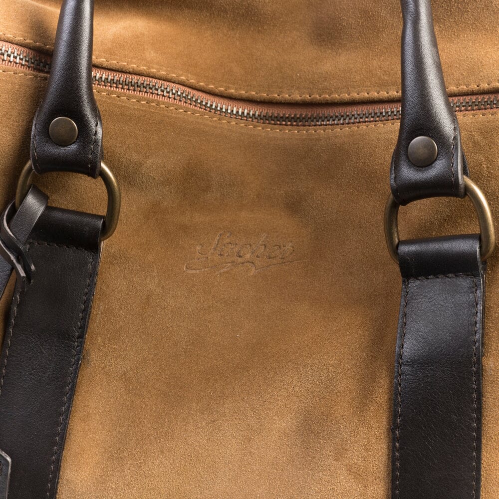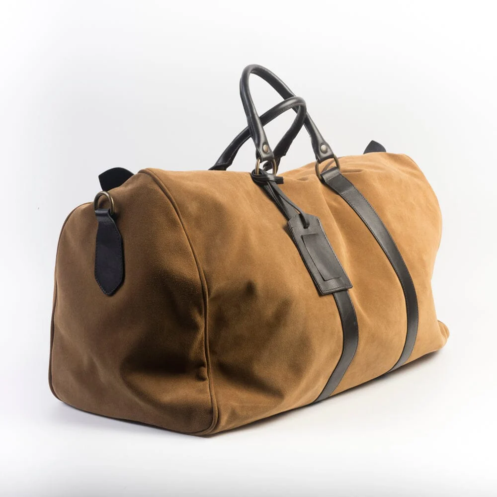 Borsone da viaggio in camoscio di colore cuoio. Apertura centrale con chiusura a zip. Robusti manici in pelle di colore testa moro, tracolla amovibile e regolabile in tessuto canvas tono su tono con passante proteggi spalla in pelle. Logo Sachet impresso sul fronte. Interno completamente foderato in tessuto in nuance, tasca laterale con chiusura con zip. Minuteria di color brunito. Targhetta porta biglietto da visita in pelle. Sacca anti-polvere.