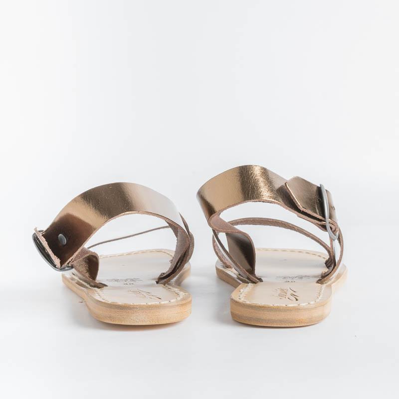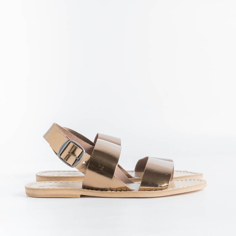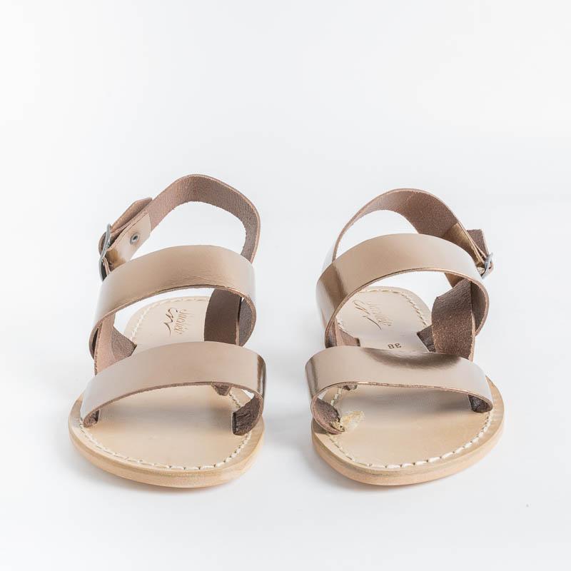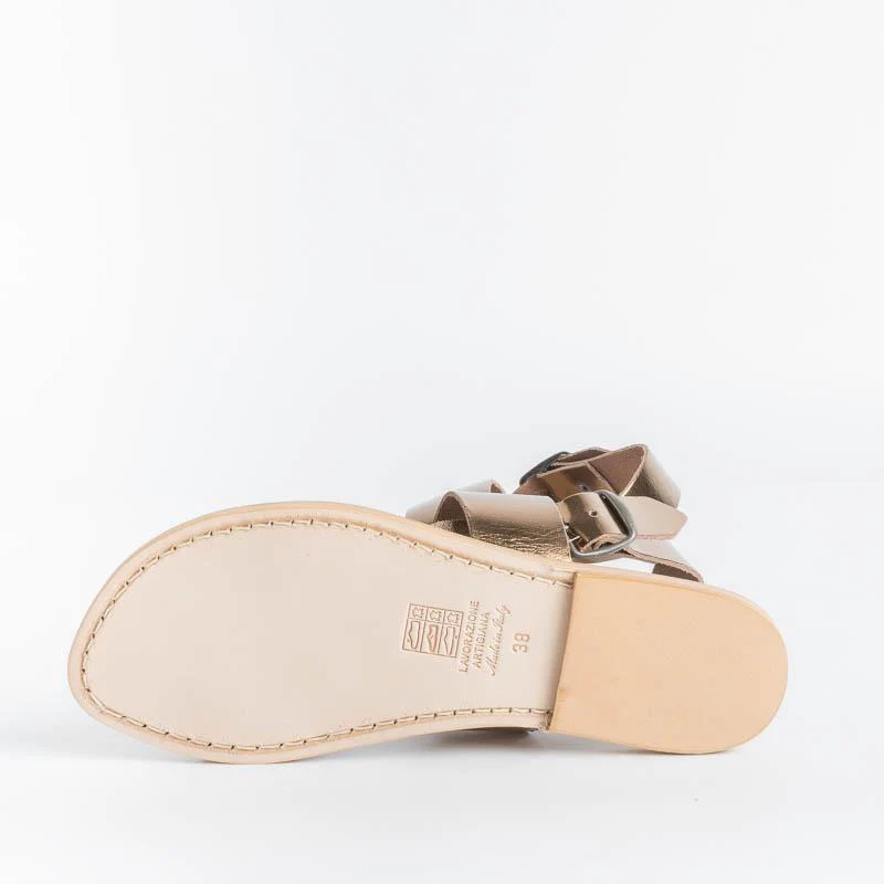 Sandalo artigianale realizzato per Sachet di vitello lucido di colore bronzo: tomaia con doppia fascia e chiusura con cinturino regolabile alla caviglia. Suola e profili in cuoio fresati ed anticati per un effetto vintage.