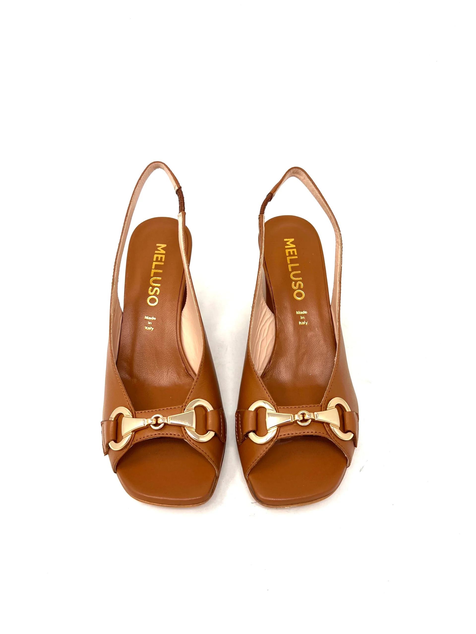 Il Sandalo con tacco cuoio Melluso -S420D รจ il perfetto mix di comfort e stile. Realizzato in vera pelle color cuoio, presenta una elegante applicazione morsetto oro che lo rende adatto ad ogni occasione. Con un tacco di 7 cm, garantisce un look sofisticato e comodo per tutto il giorno.