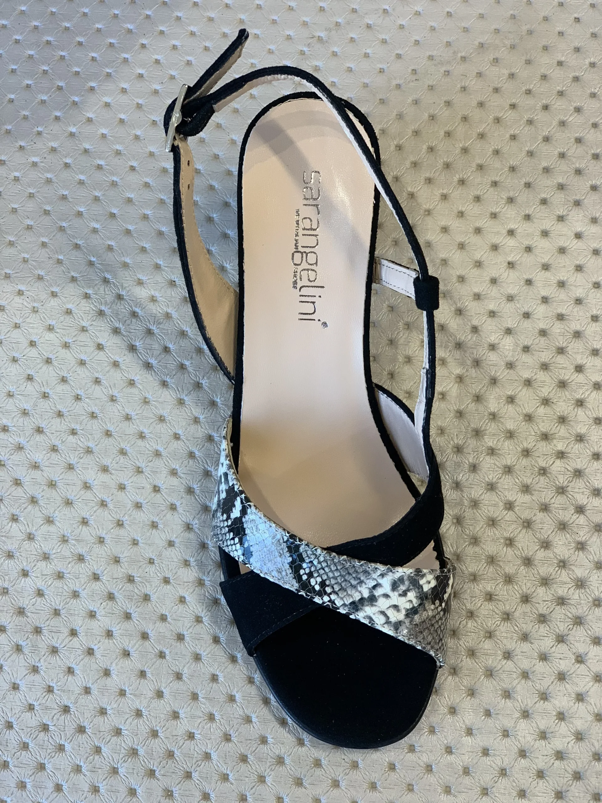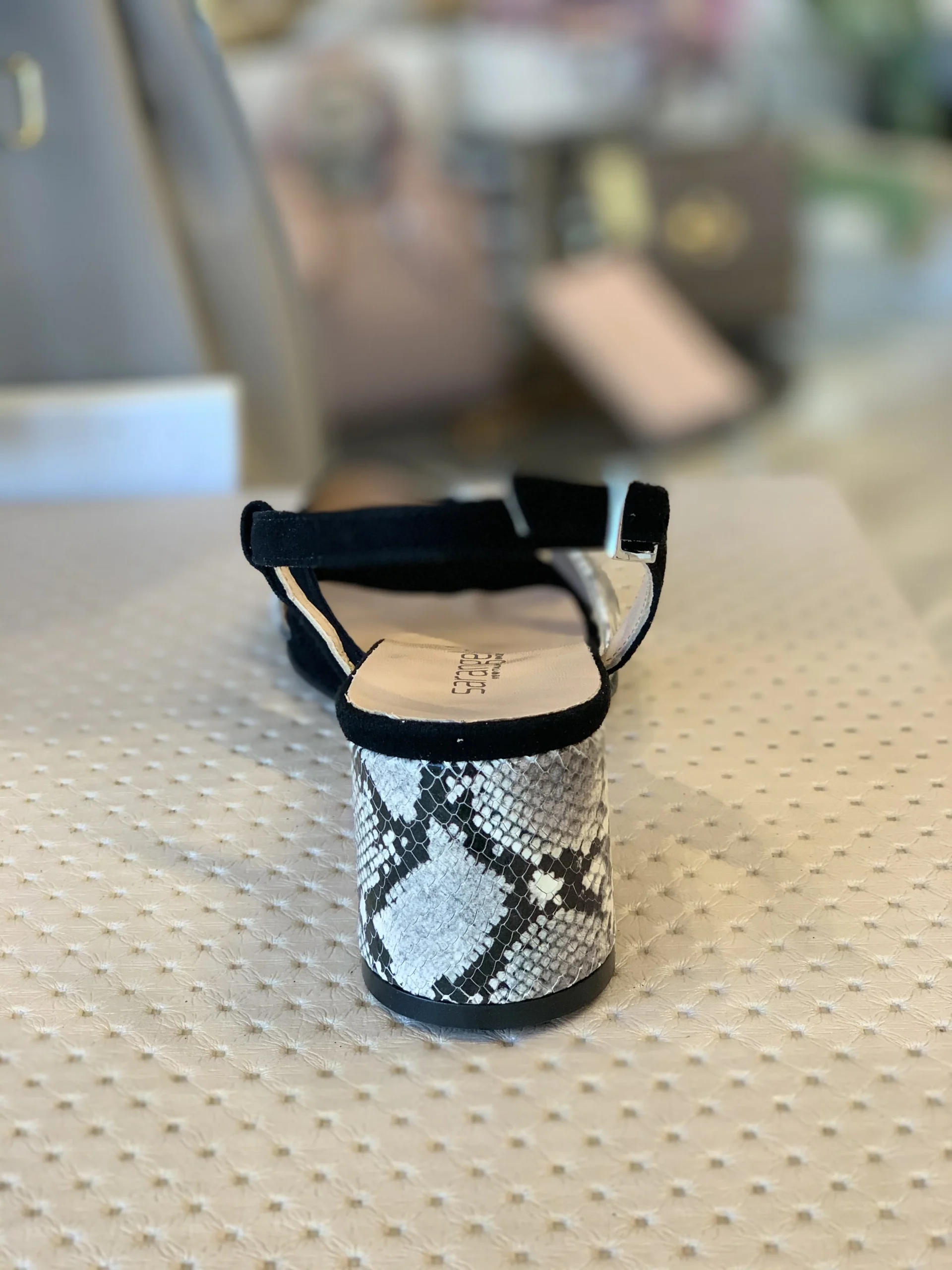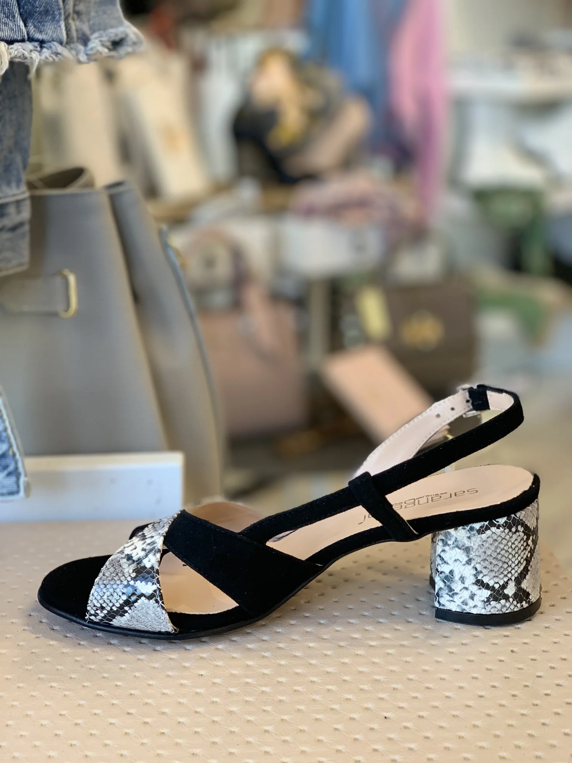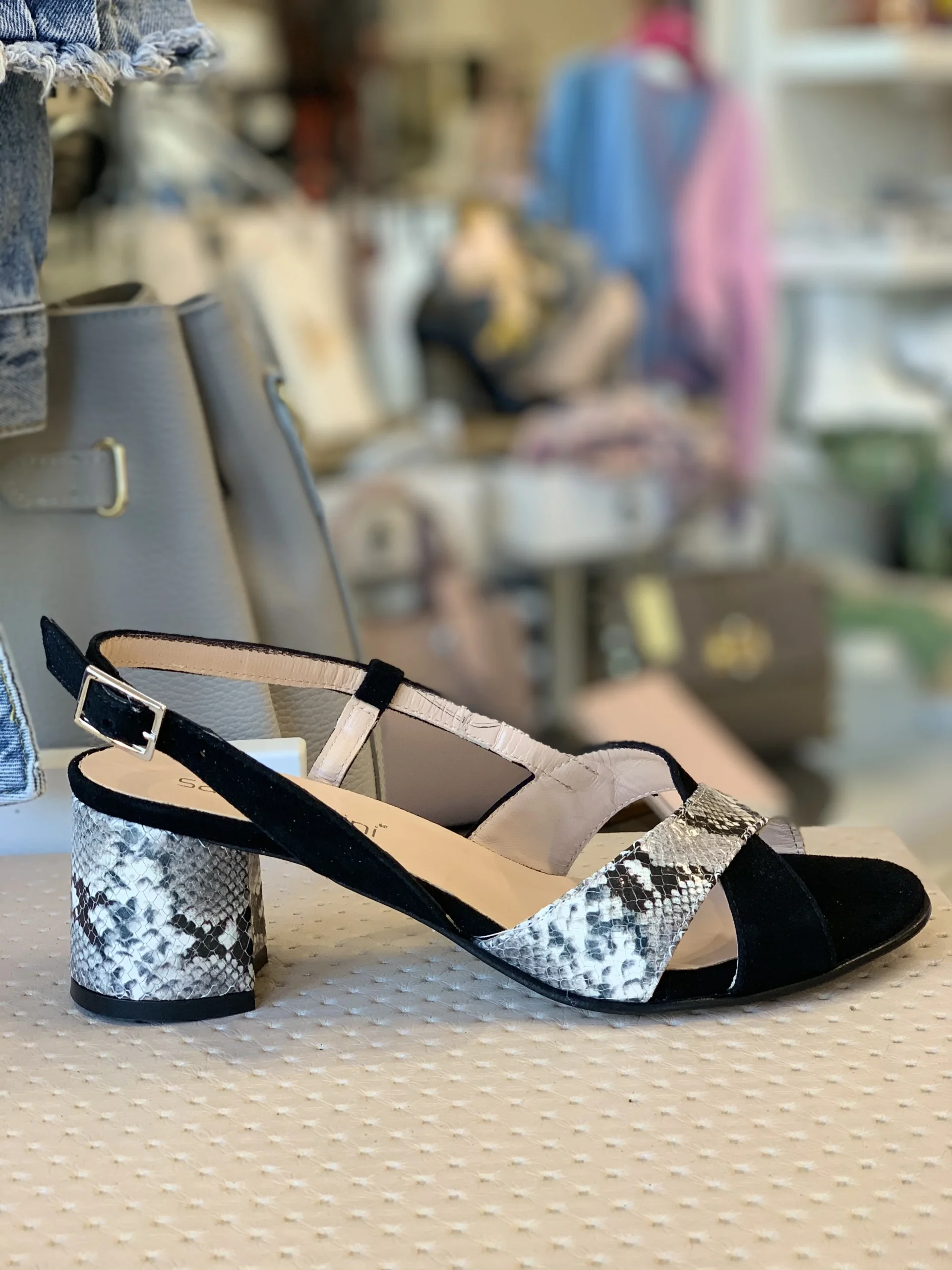 Sandalo realizzato in pelle made in Italy con fasce incrociate in camoscio nero e inserti in stampa snake roccia, spuntato con cinturino regolabile e scollo particolarissimo sul collo del piede. Morbido e comodo Altezza tacco 5 cm.