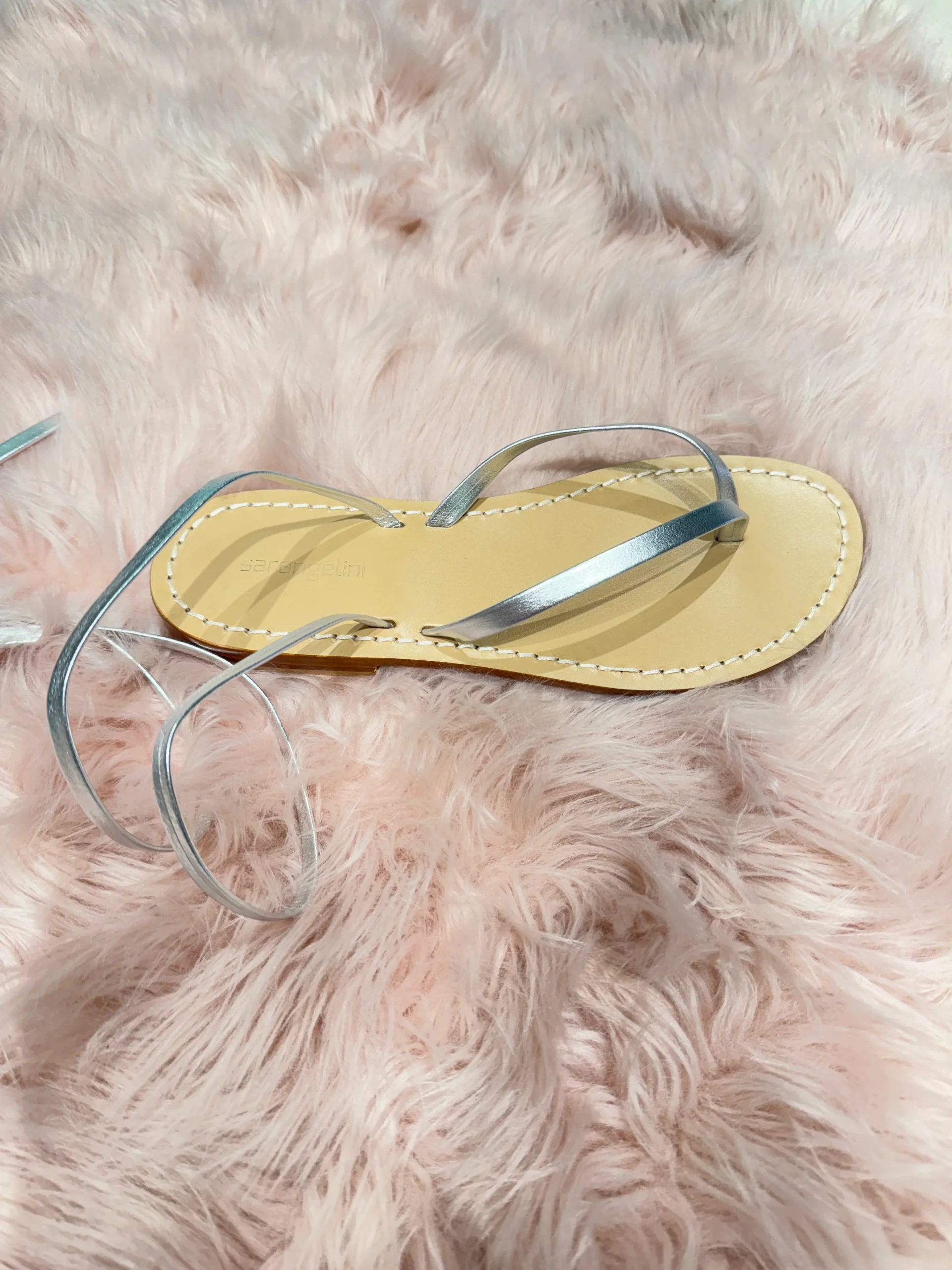 Sandalo infradito alla schiava argento con una comoda calzata regolare e una suola in cuoio, ideale per un look estivo chic e di alta qualitร . Realizzato in Italia, questa scarpa รจ perfetto per ogni occasione e dona un tocco di eleganza al tuo outfit.