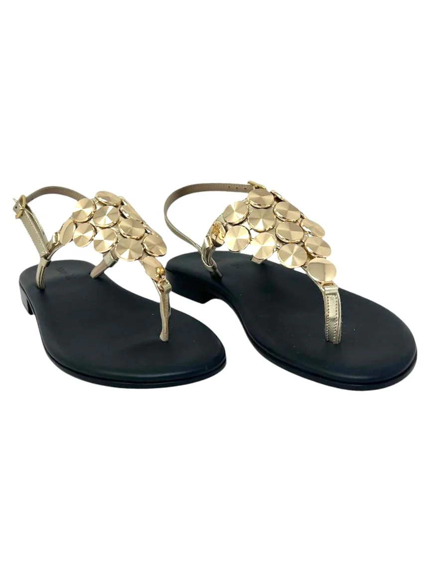 Realizzato artigianalmente in Italia con vera pelle, questo sandalo infradito in pelle รจ un’autentica opera d’arte. Le borchie oro aggiungono un tocco di eleganza, mentre la suola in cuoio assicura una maggiore durata. Goditi il massimo comfort e stile con questi sandali di alta qualitร .