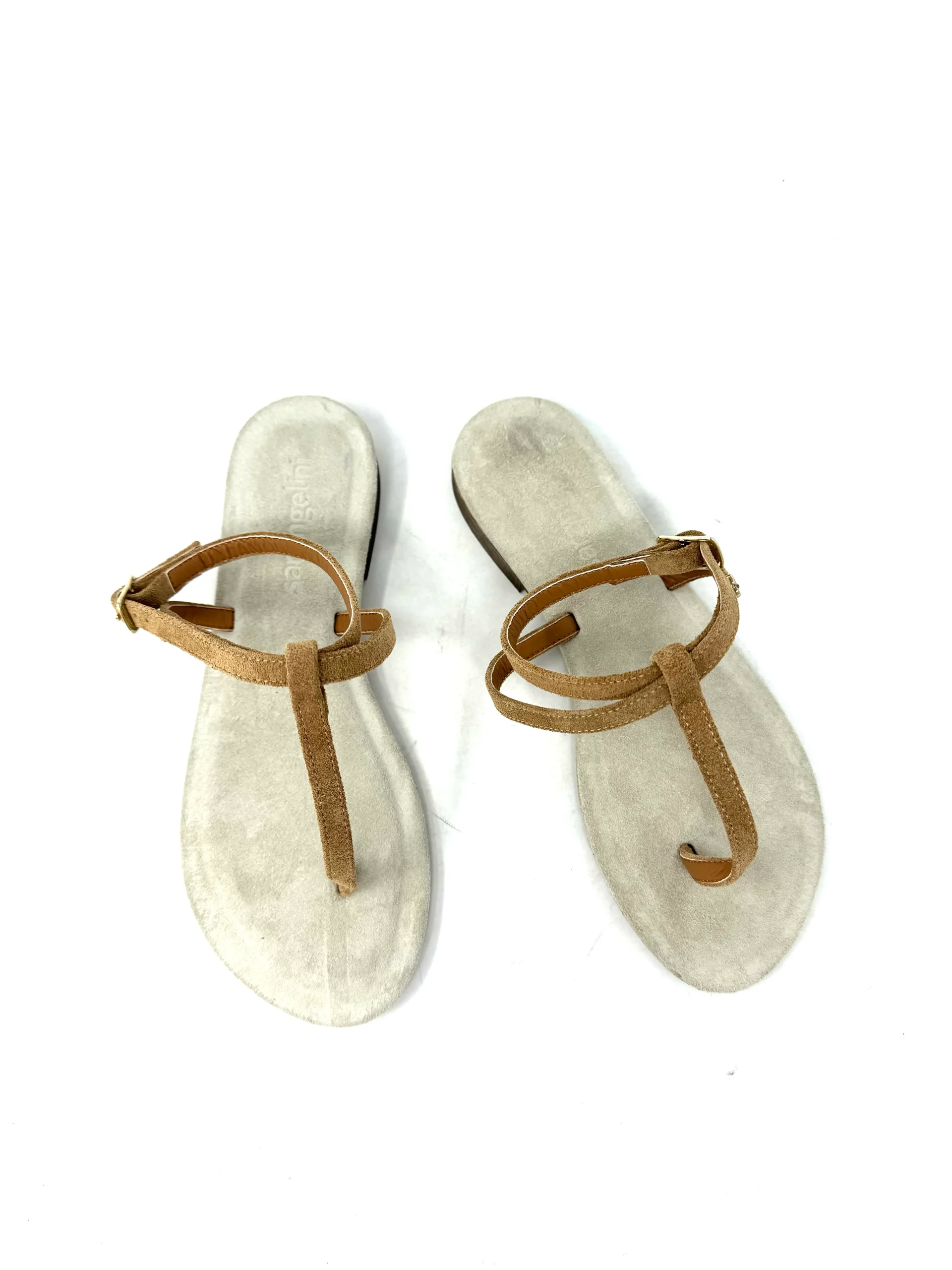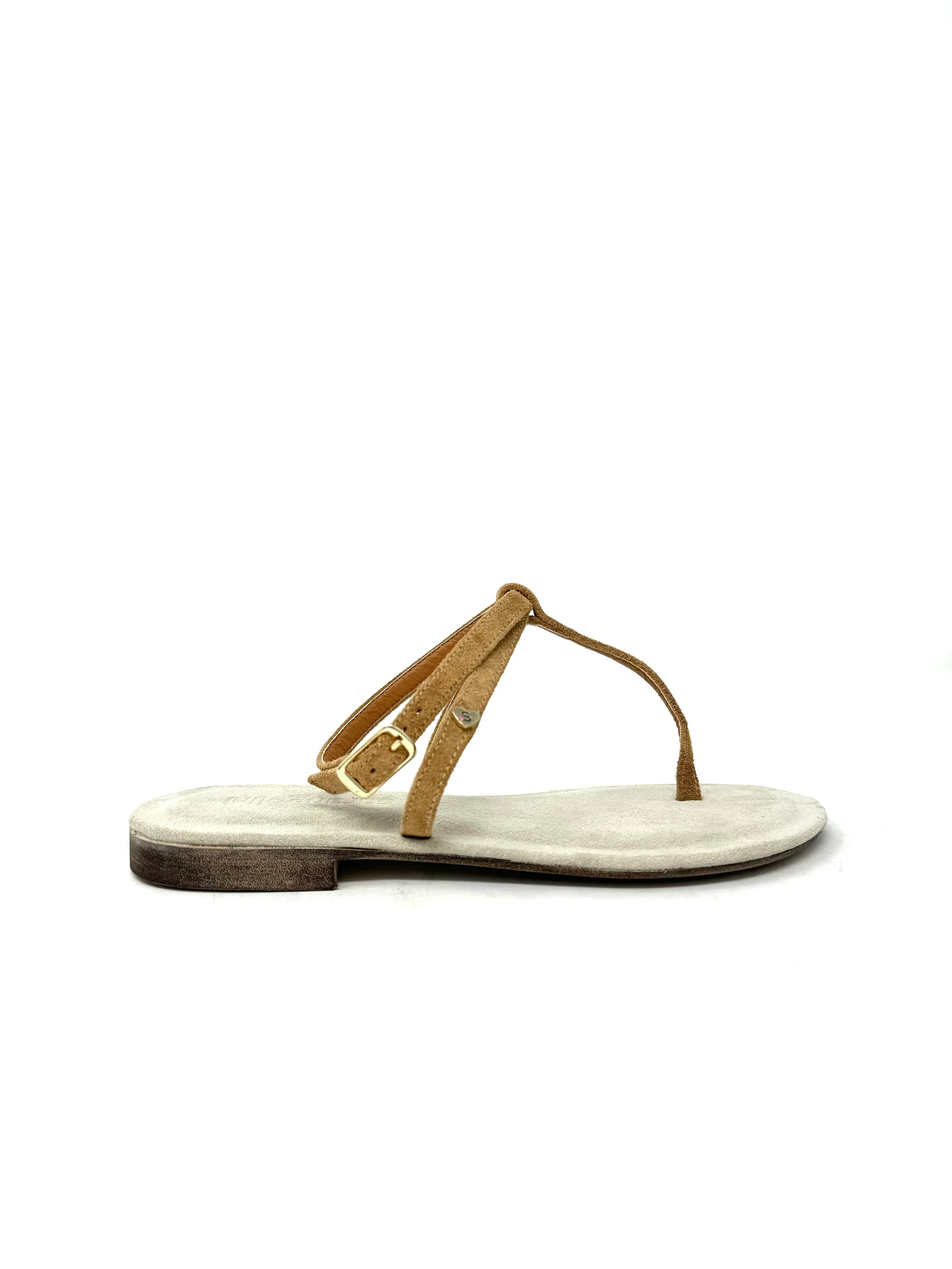 Questo sandalo flat รจ realizzato in morbido camoscio marrone e presenta un elegante cinturino alla caviglia. Comodo e versatile, รจ perfetto per aggiungere un tocco di stile ai tuoi outfit estivi. Ideale per camminare tutto il giorno con eleganza. Calzata regolare, vera pelle.