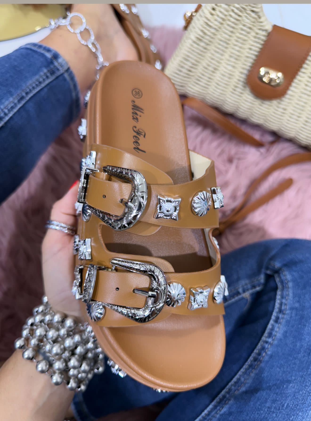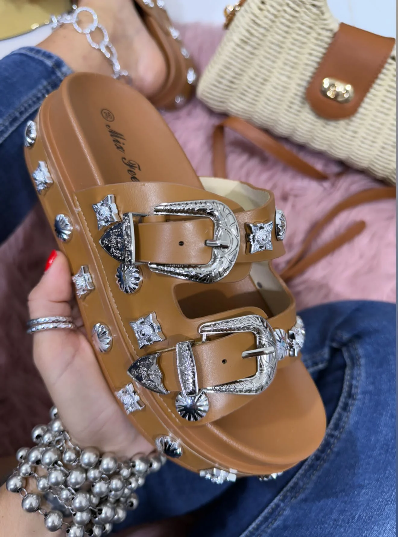 I nostri sandali Taormina sono l’accessorio perfetto per un look rock e chic. In tessuto ecopelle con spille cromate, offrono un tocco di eleganza e originalitร al tuo outfit quotidiano. Non potrai farne a meno.