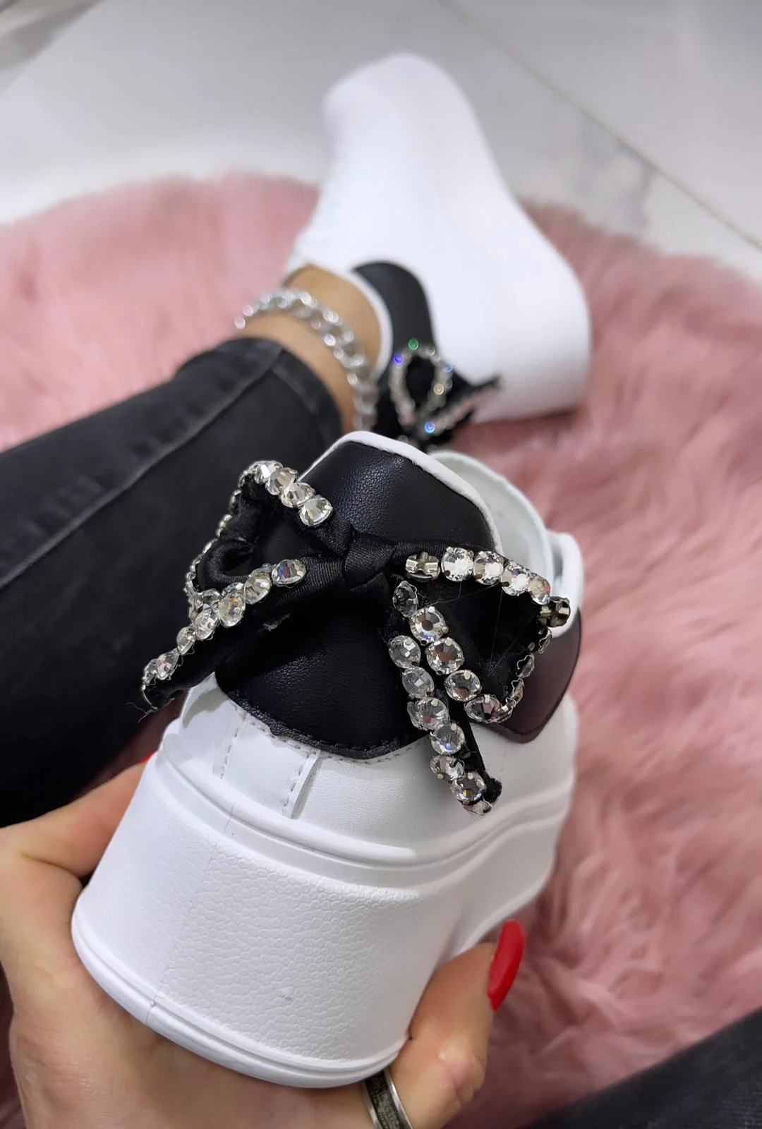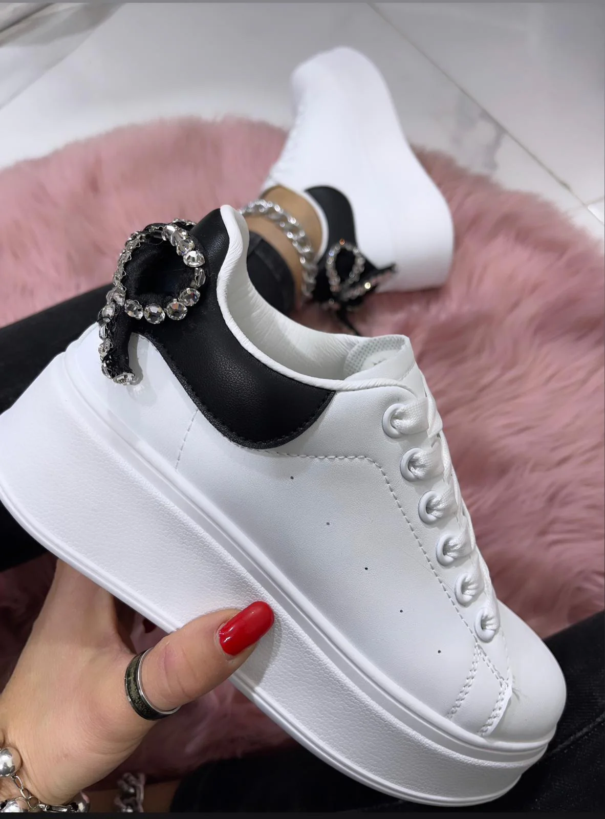 Sneakers bianche con fiocco brillantinato nero. Altezza gomma 5cm Sneakers Montreal Bianche Inserto Nero sono le classiche scarpe da ginnastica in ecopelle con suola alta e inserti colorati. Perfetto per uno stile sportivo ed elegante, comodo e resistente. Aggiungi un tocco di moda al tuo look con queste sneakers alla moda.