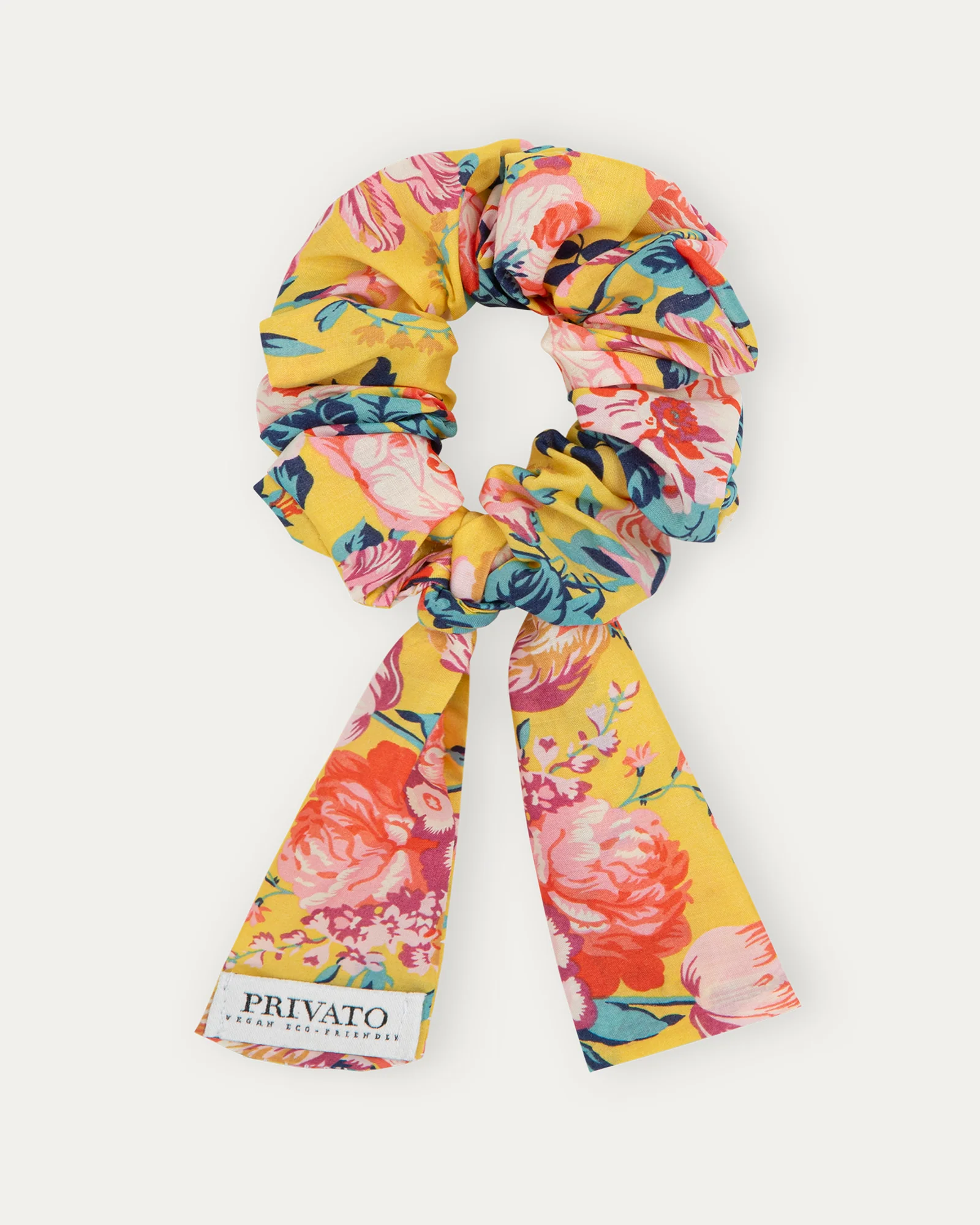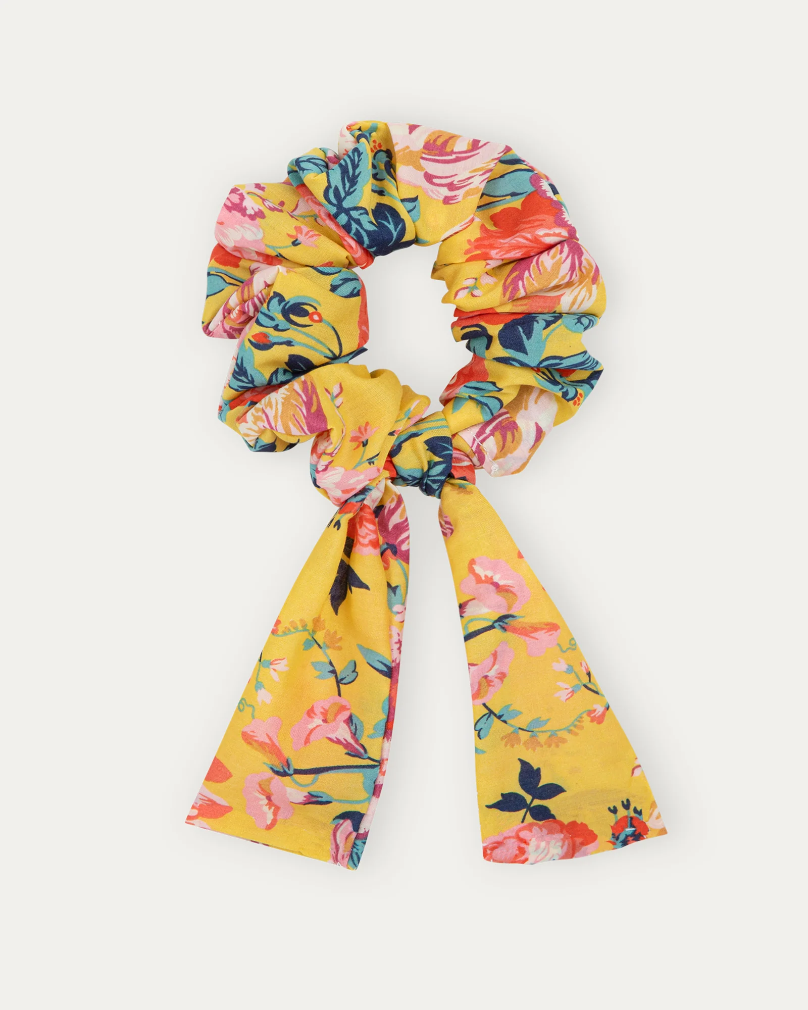 Scrunchy artigianale con fiocco annodato rimovibile. Realizzato a mano con tessuto Liberty of London rinomato per le sue stampe floreali vivaci e pratiche di produzione sostenibile. Non tira o spezza i capelli Piccole produzioni, zero sprechi Prodotto realizzato artigianalmente nel nostro laboratorio in Puglia. 100% Cotone Tana Lawn.