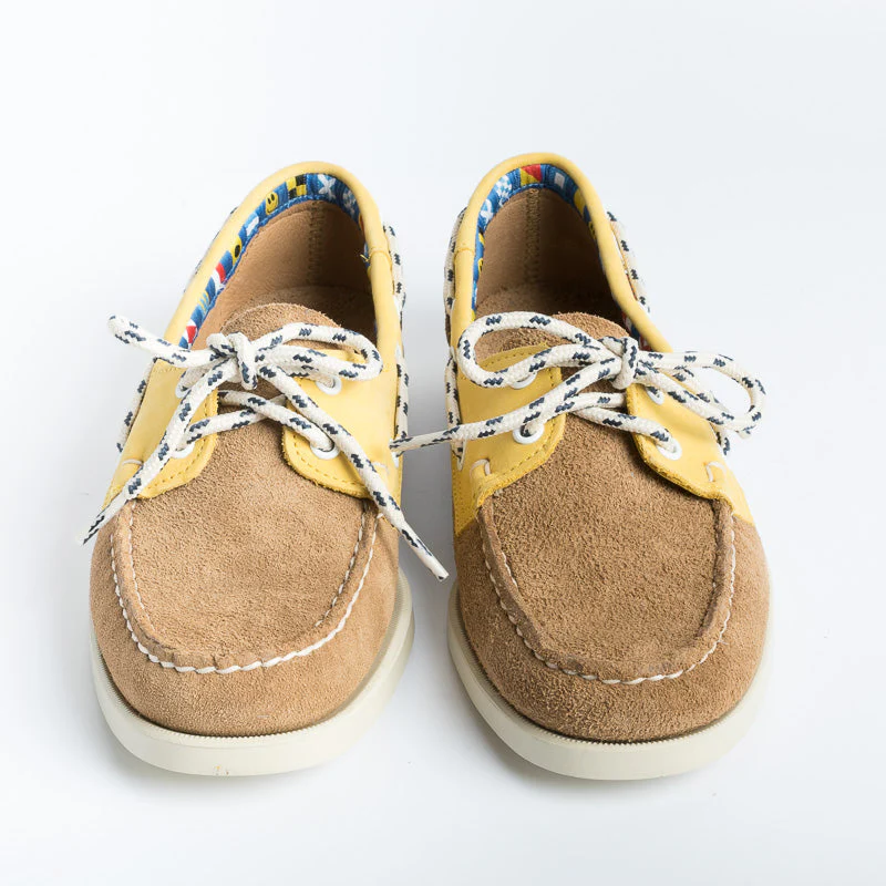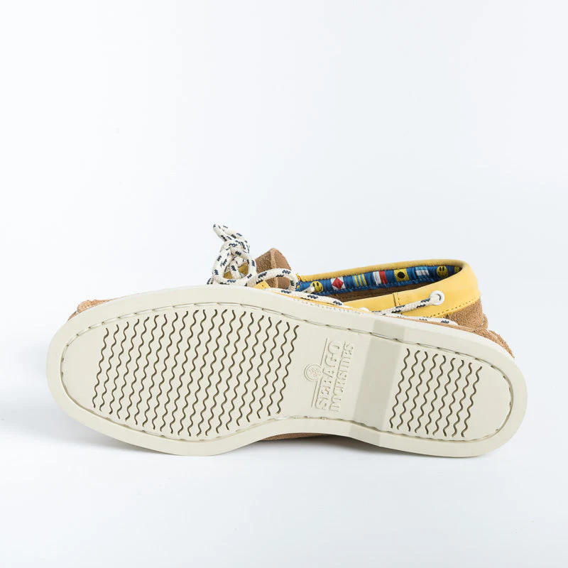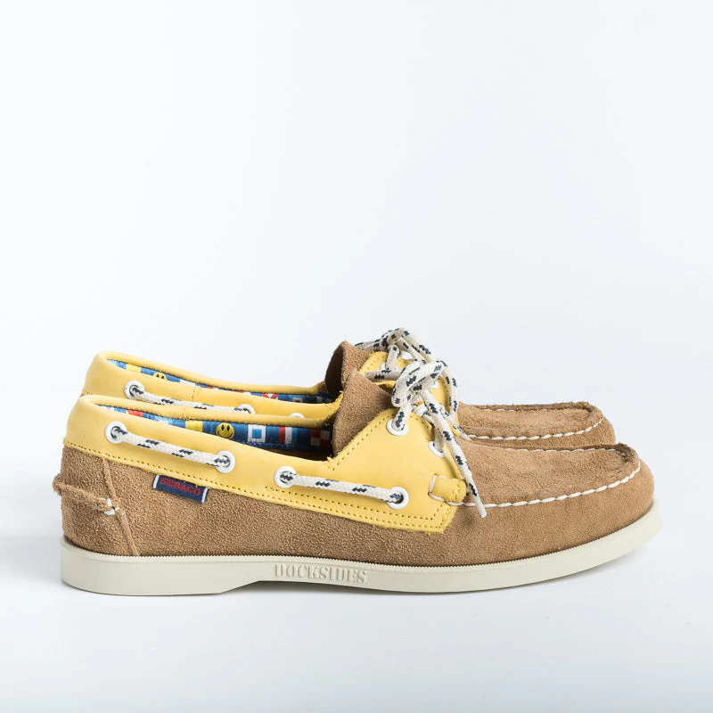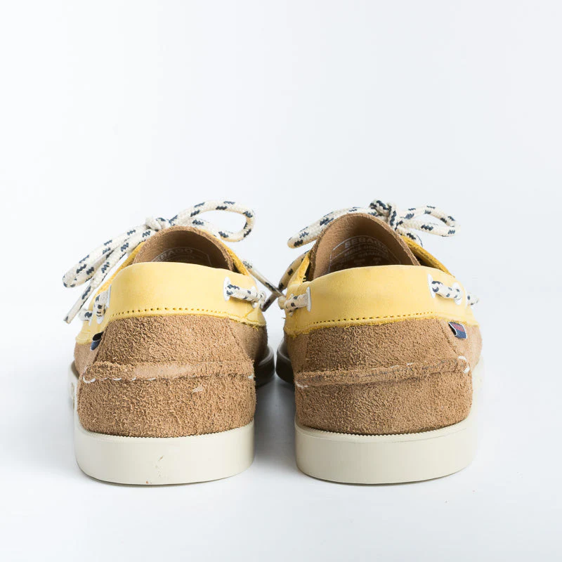 Scarpa da barca Sebago realizzata con un unico pezzo di pelle scamosciata a grana fine e cucita a mano con la migliore lavorazione artigianale. Colore Beige cammello con inserto in nabuk di colore giallo. Creata per avere un look esclusivo e durare a lungo, รจ dotata di soletta in pelle, sistema di allacciatura a 360ยฐ in tessuto bianco blu e suola non- marking in gomma striata antiscivolo, per offrire una presa stabile in tutte le condizioni atmosferiche. Decorazione con fettuccia interna a bandiere nautiche. I mocassini “Portland” hanno nel loro stesso DNA un legame e un affetto innato verso la cittร di Portland, uno dei piรน grandi porti marittimi del New England, e sede del famoso Yachting Club omonimo.