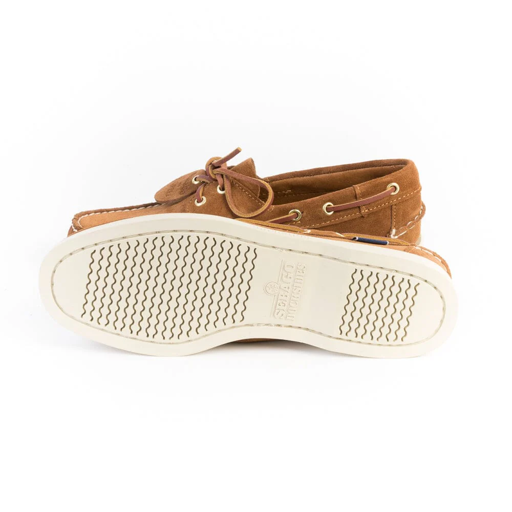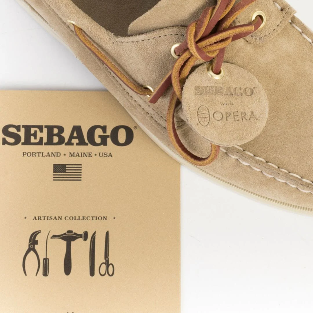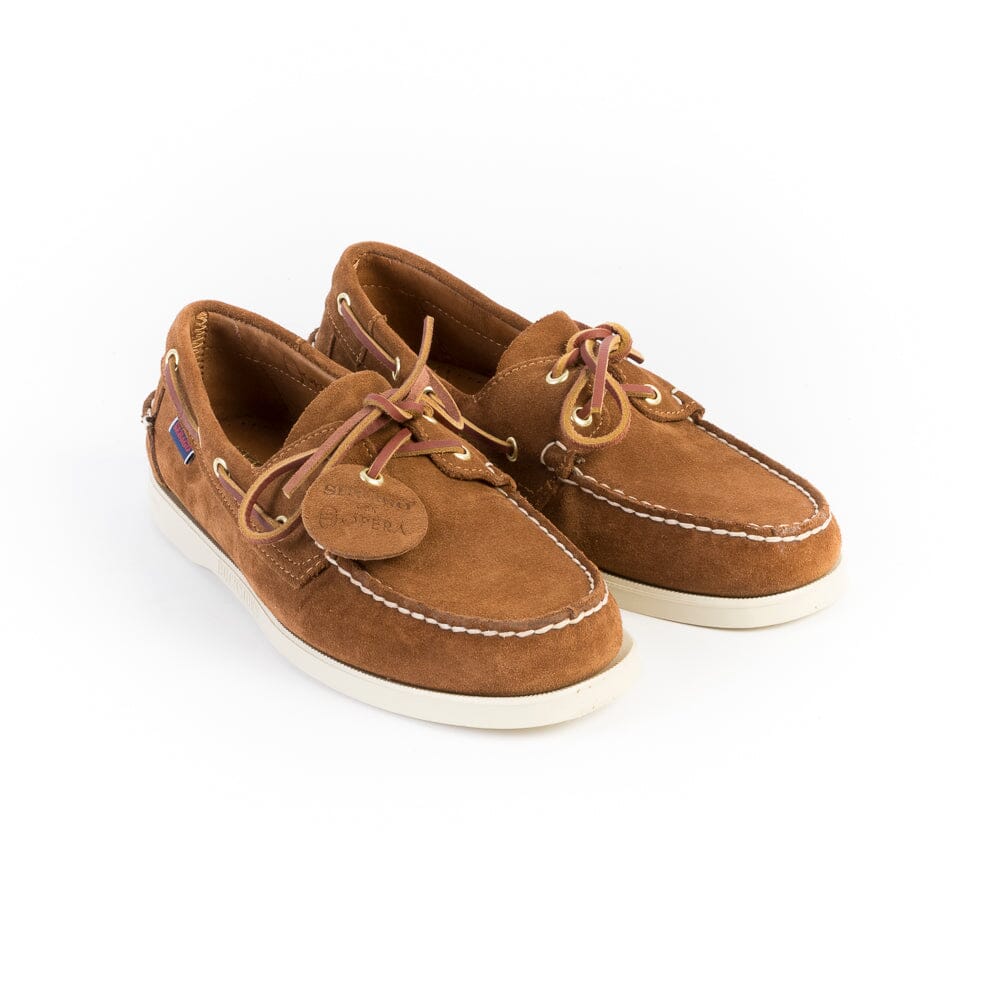 Scarpa da barca Sebago, facente parte della collezione OPERA. In particolare, la collezione viene creata utilizzando la parte piรน pregiata e morbida del pellame; inizialmente conciata al vegetale e successivamente conciata al cromo per donare alla calzatura una morbidezza senza precedenti. La scarpa รจ cucita a mano con la migliore lavorazione artigianale in pelle rovesciata di colore marrone bruciato. Creata per avere un look esclusivo e durare a lungo, รจ dotata di soletta in pelle, sistema di allacciatura a 360ยฐ in camoscio in nuance e suola non- marking in gomma striata antiscivolo, per offrire una presa stabile in tutte le condizioni atmosferiche.