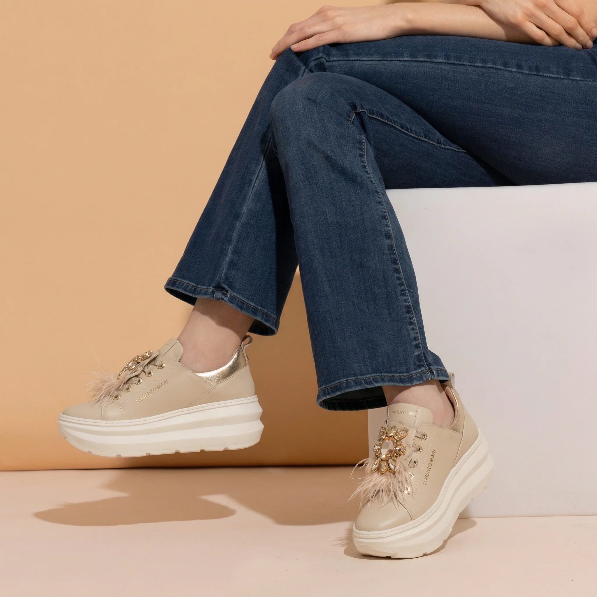 La sneaker Veronica presenta un design monocromatico ed รจ realizzata con un accessorio in strass e piume oversize che puรฒ essere rimosso lasciando la sneakers con un design semplice. Il nuovo logo LM sul tallone la rende facile da calzare inoltre la sua costruzione leggera e confortevole la rende un vero must-have! La scarpa รจ alta e caratterizzata da un platform unico ed originale alto 6cm che slancia e ammortizza ad ogni passo.