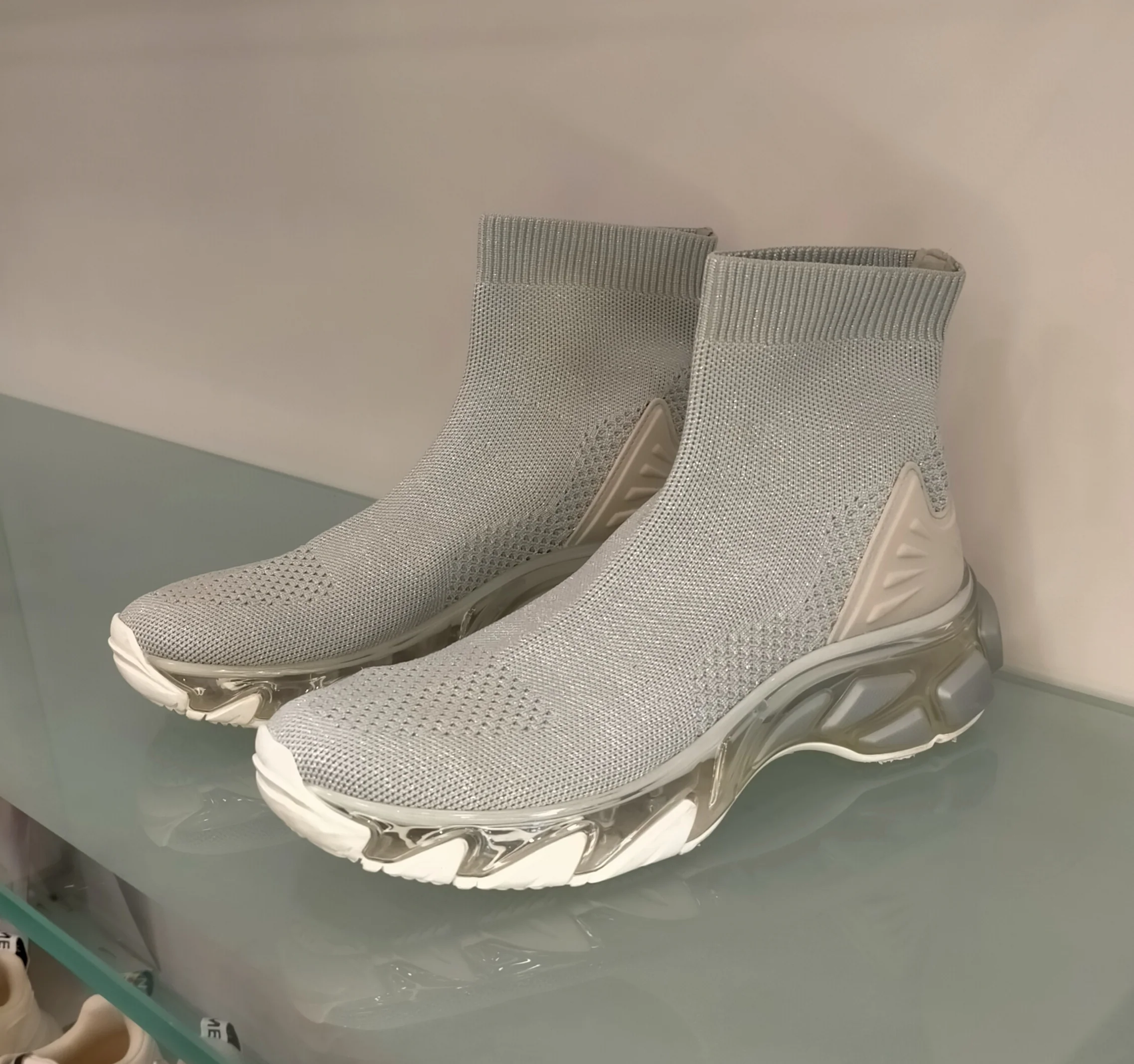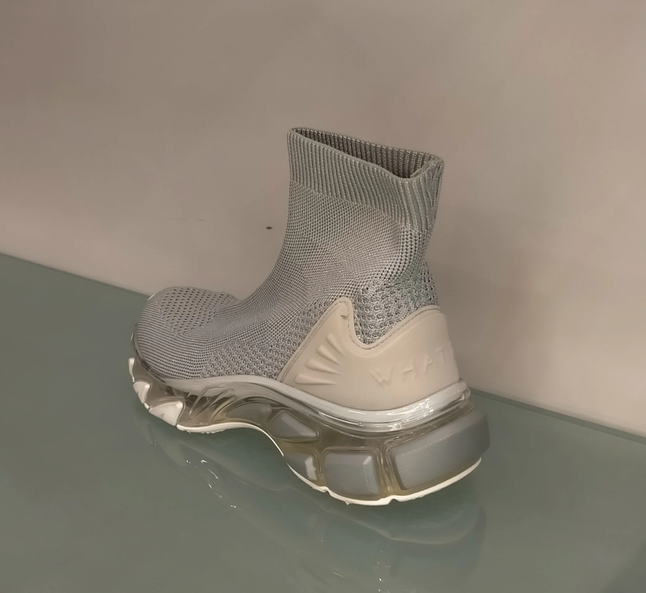 Sneakers in tessuto elasticizzato grigio con riflessi argento, fondo gomma trasparente