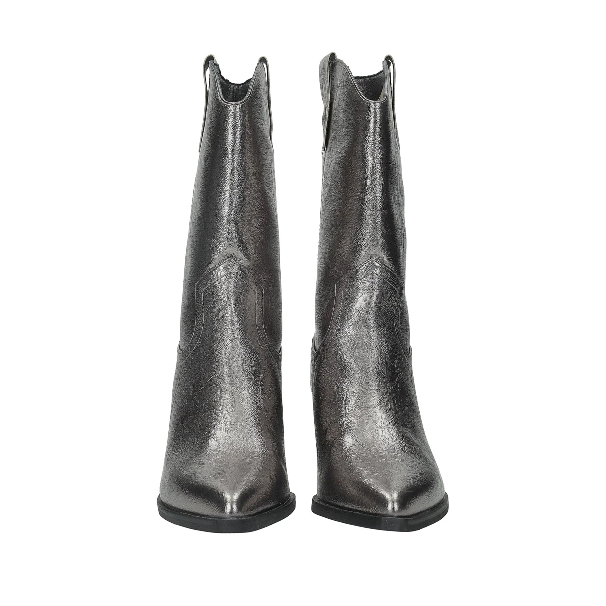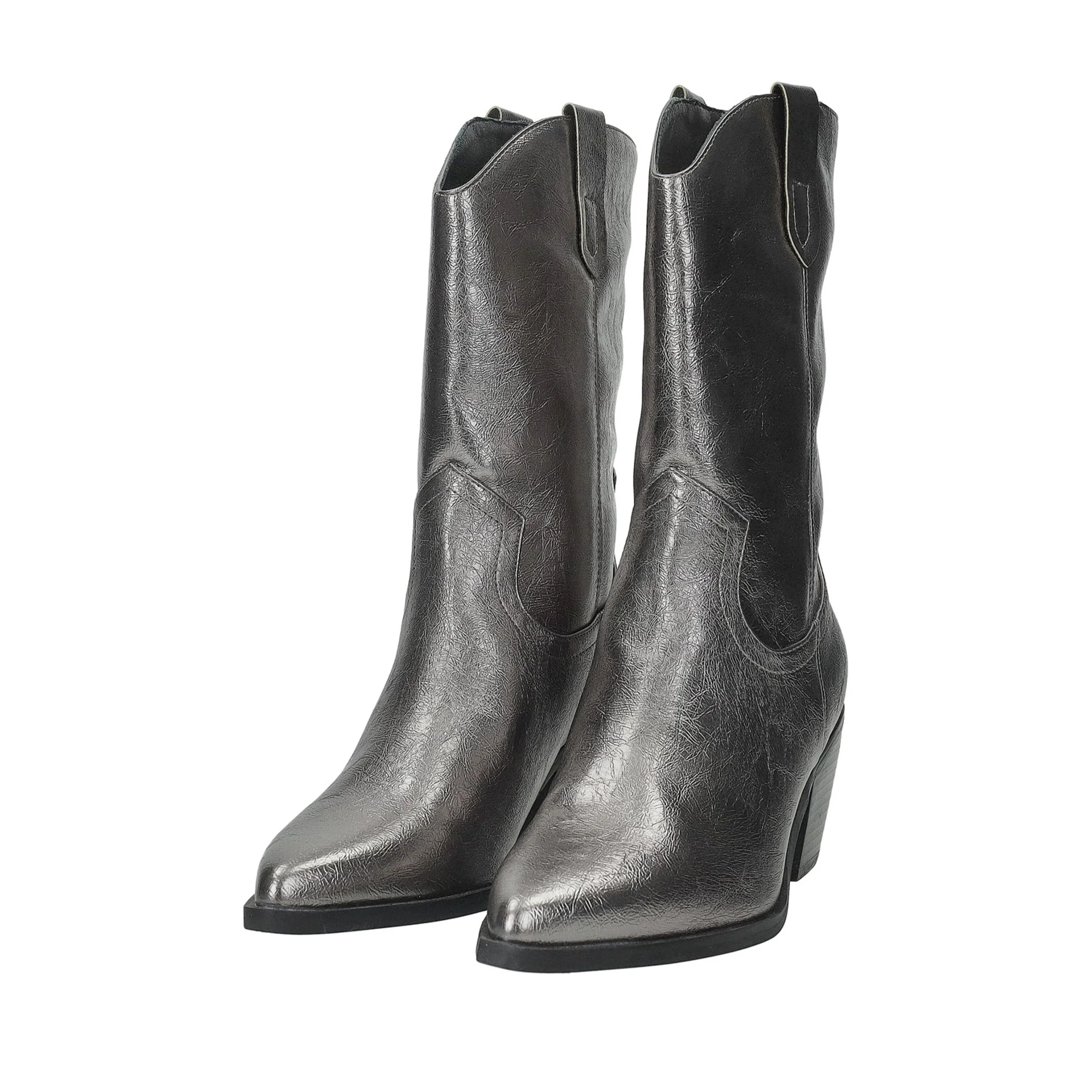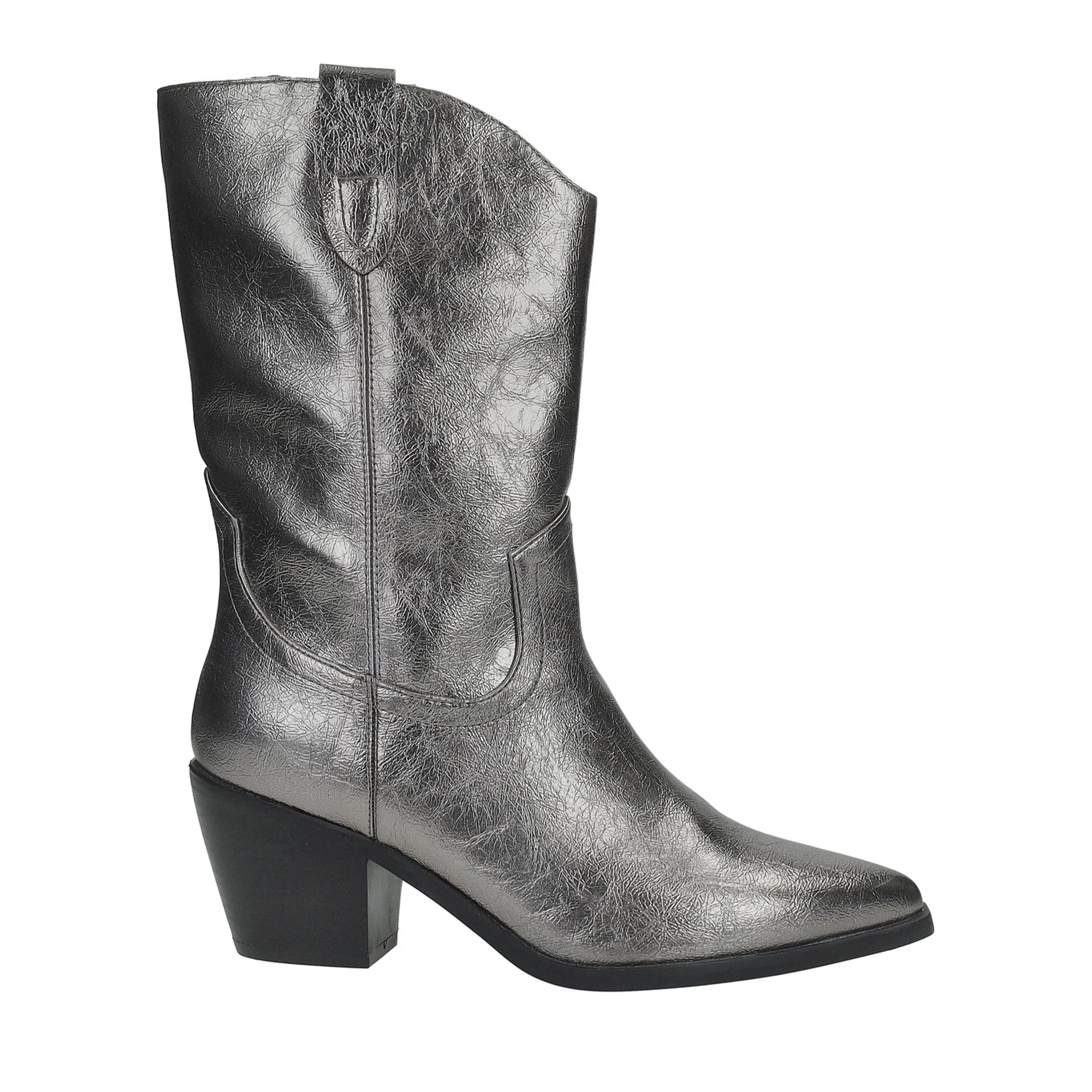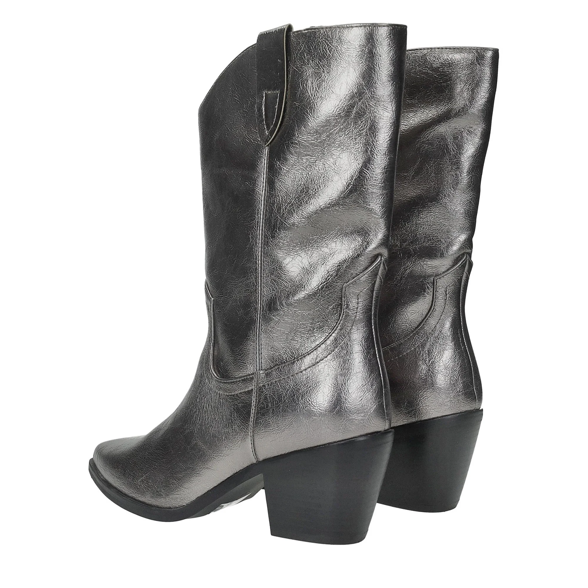 Texani silver, la scelta perfetta per completare il tuo look. Realizzati in ecopelle silver di prima qualitร , questo texano ha un tacco alto 6 cm e uno scollo a V. Il design moderno e chic renderร i tuoi outfit unici. Gambale 3/4 altezza metร polpaccio, calzata regolare.