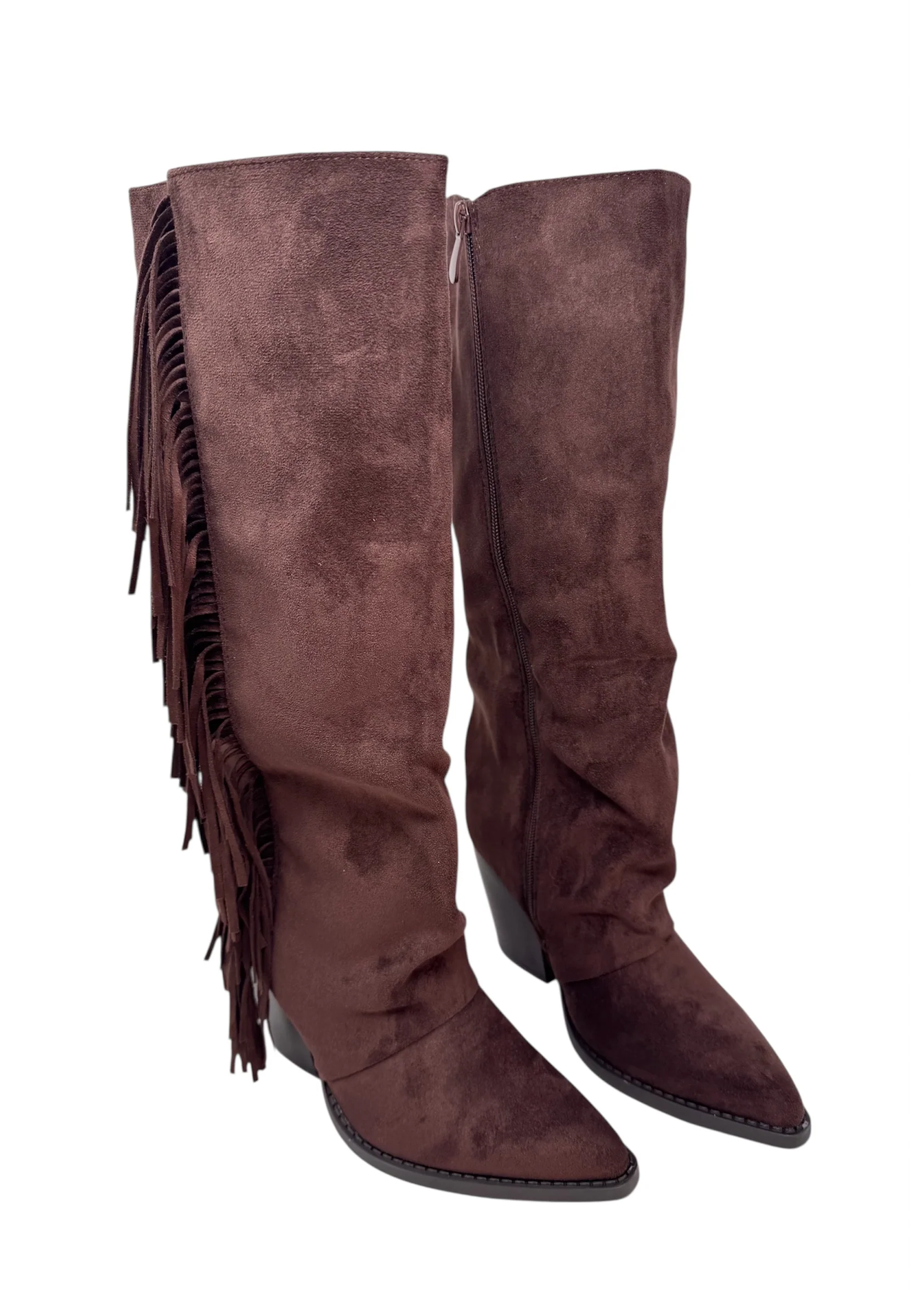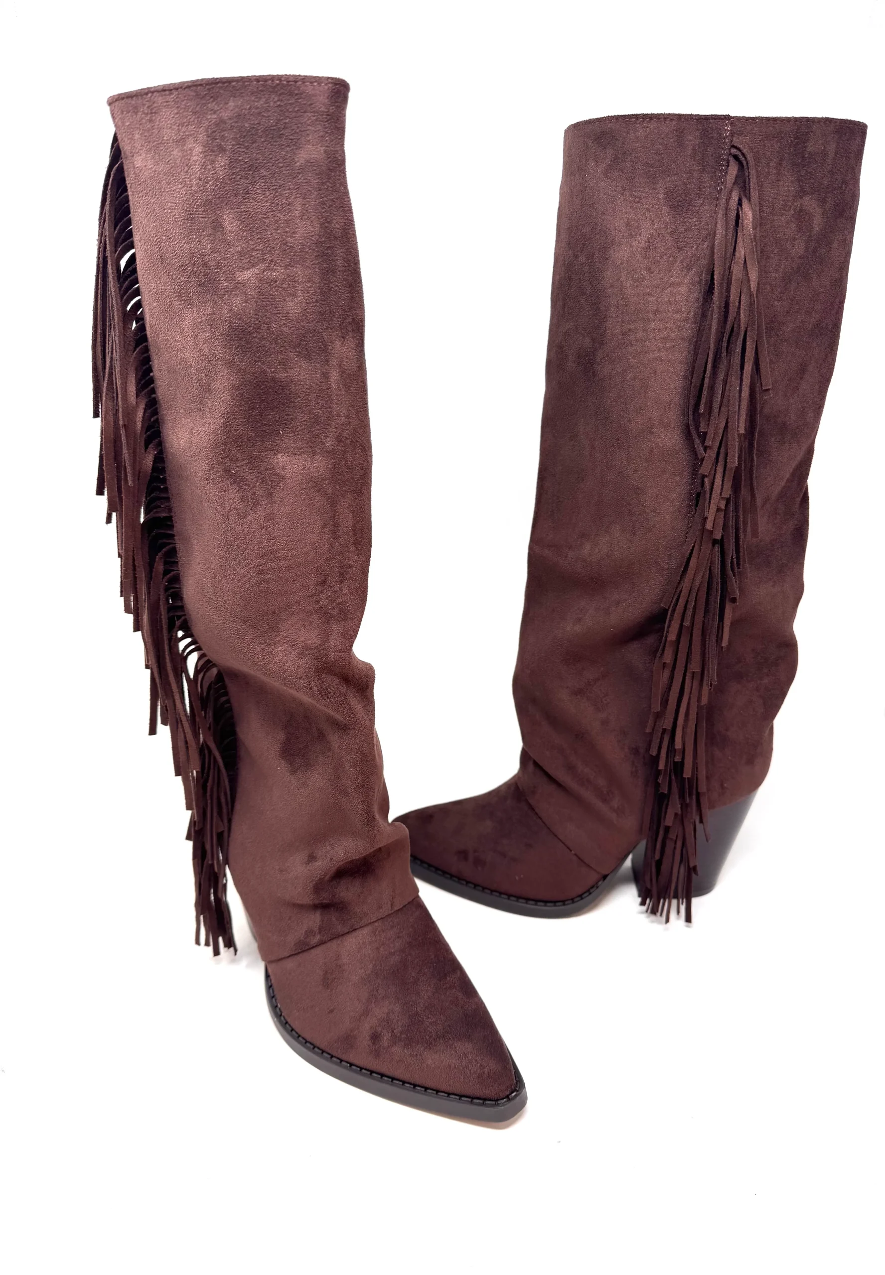 Questi stivali texani alti in tonalitร  moro con eleganti frange uniscono stile autentico e carattere distintivo. Perfetti per completare outfit dal fascino western con un tocco moderno, garantiscono comfort e resistenza durante tutta la giornata. Ideali per chi cerca un accessorio versatile e originale nel proprio guardaroba.