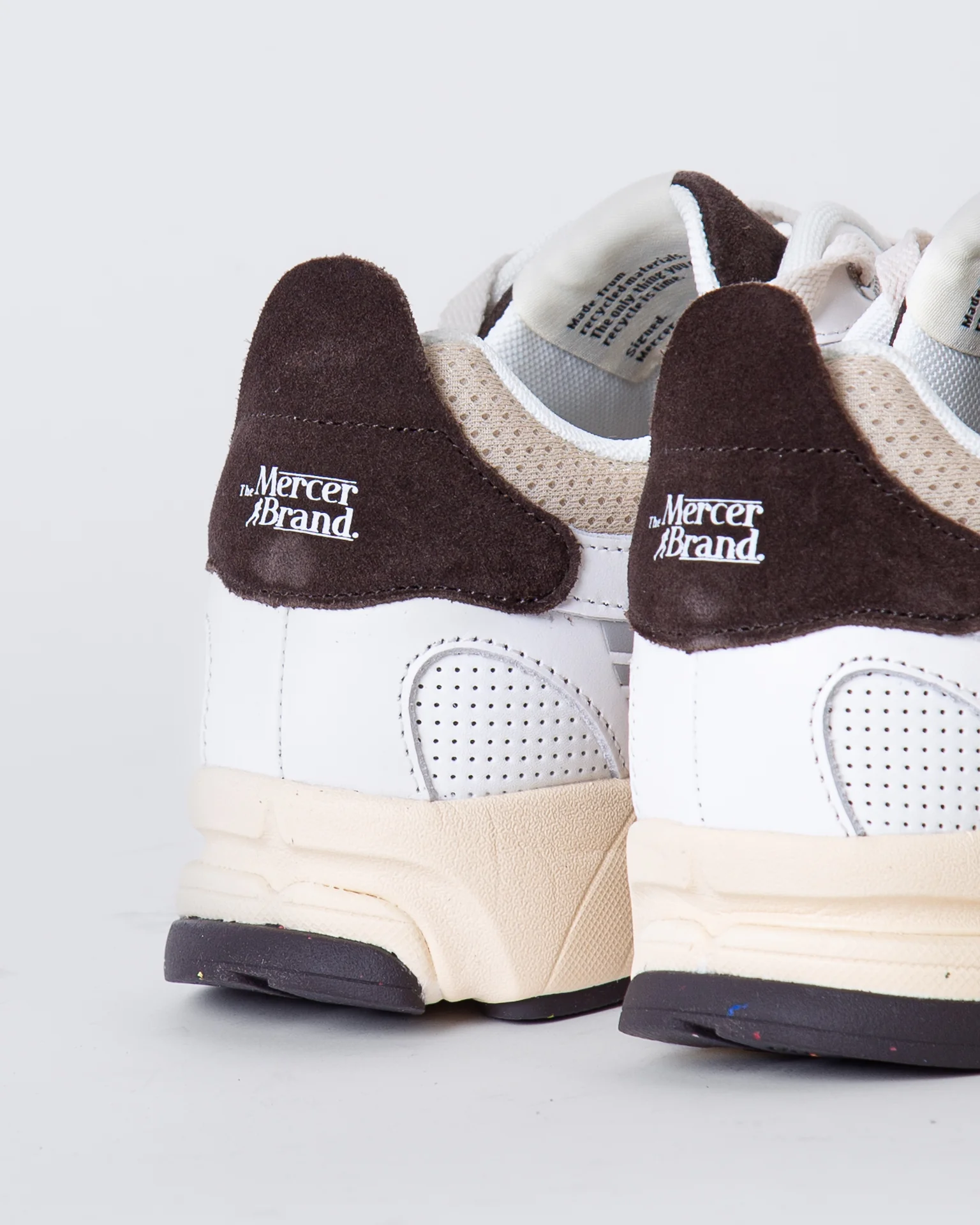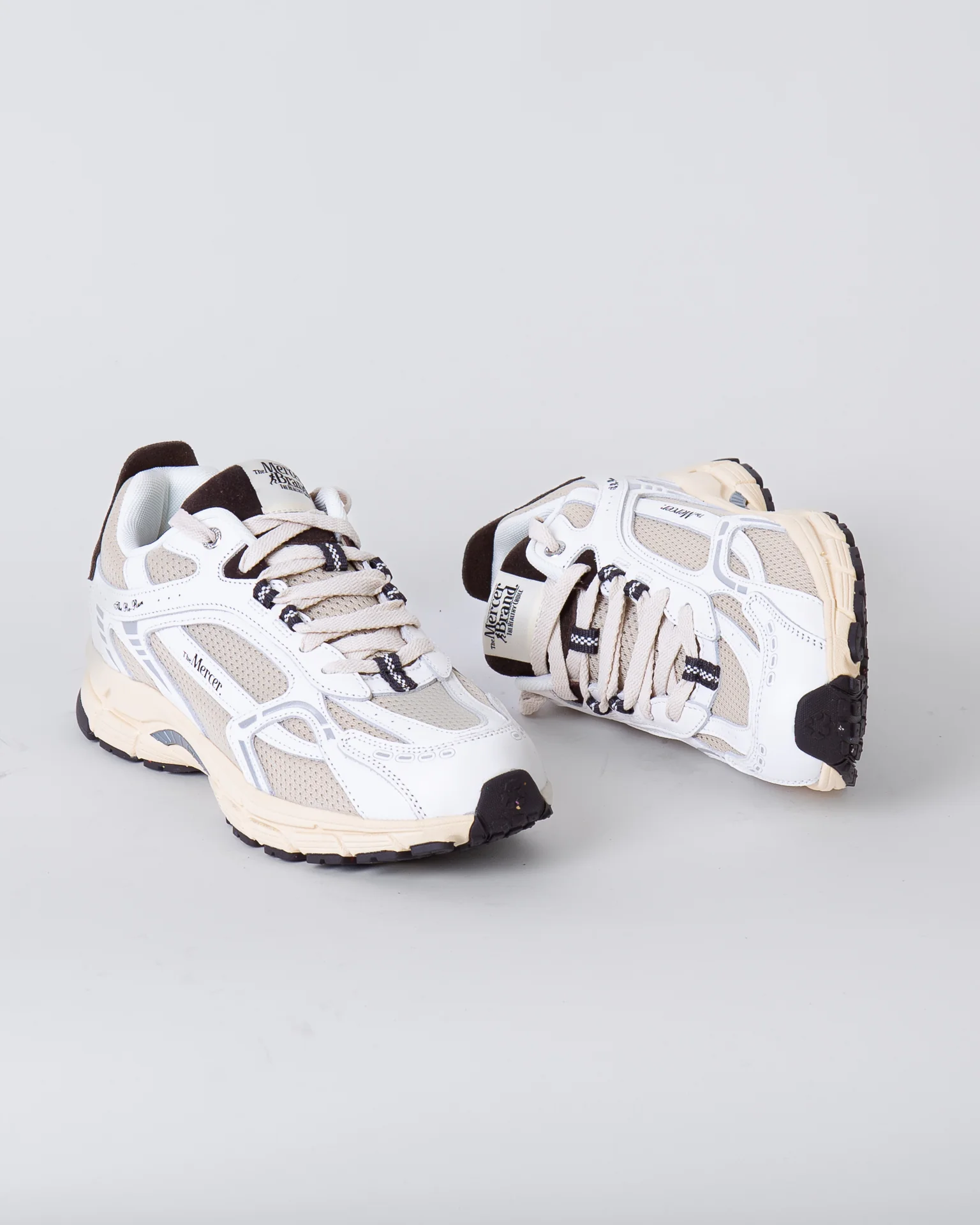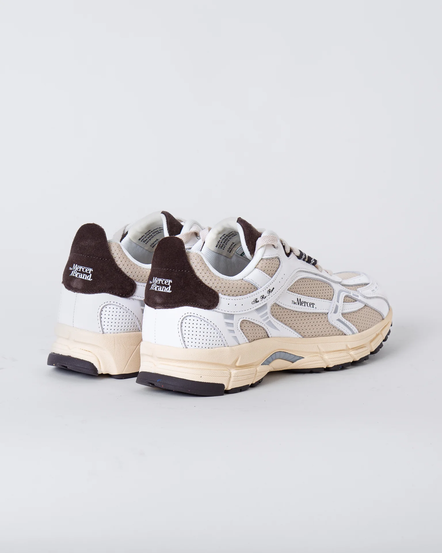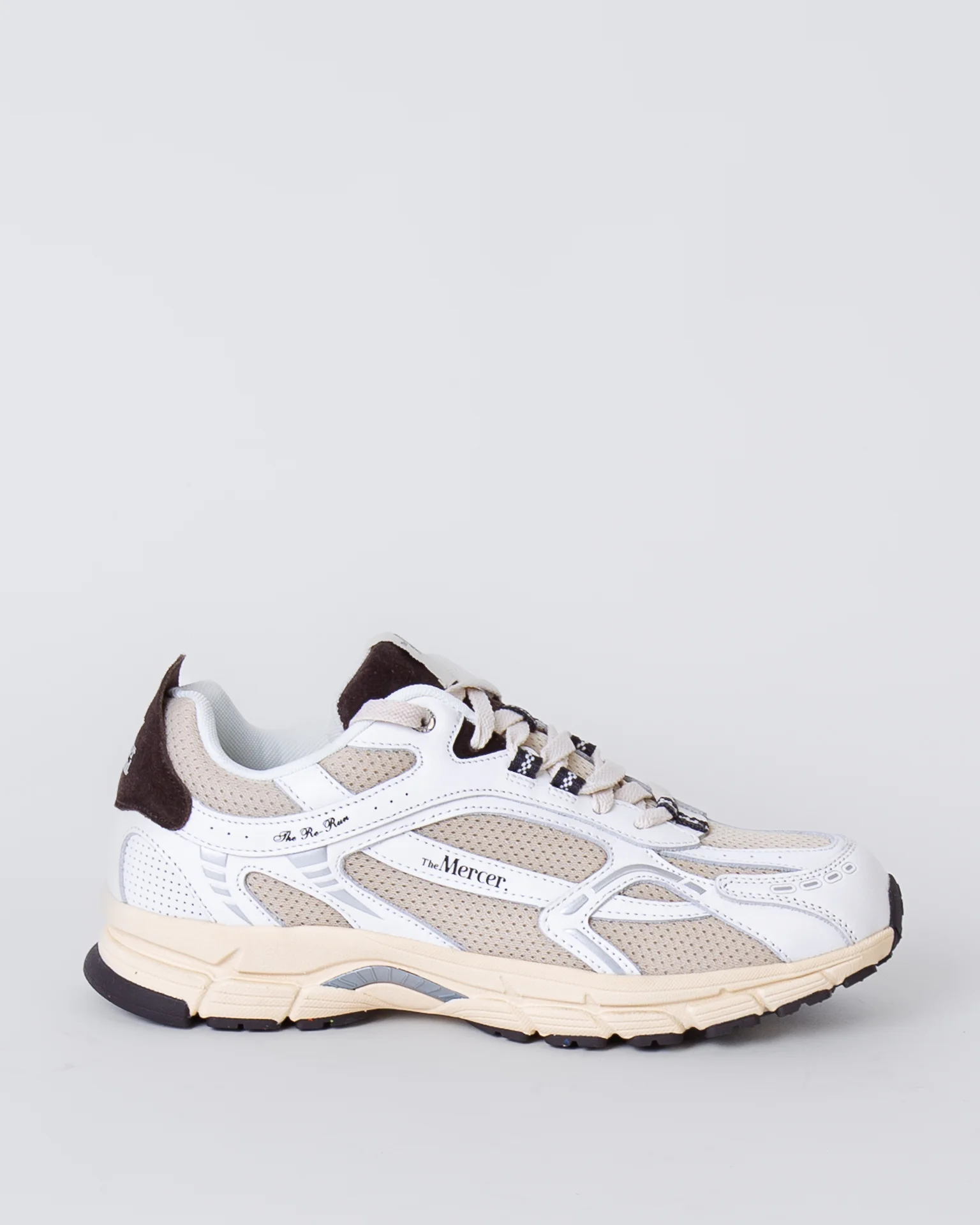 The Mercer Brand, sneakers uomo ME253012 157 avorio, modello re-run vintage, tomaia con inserti a rete, talloncino marrone a contrasto. La scarpa scattata รจ una taglia 43