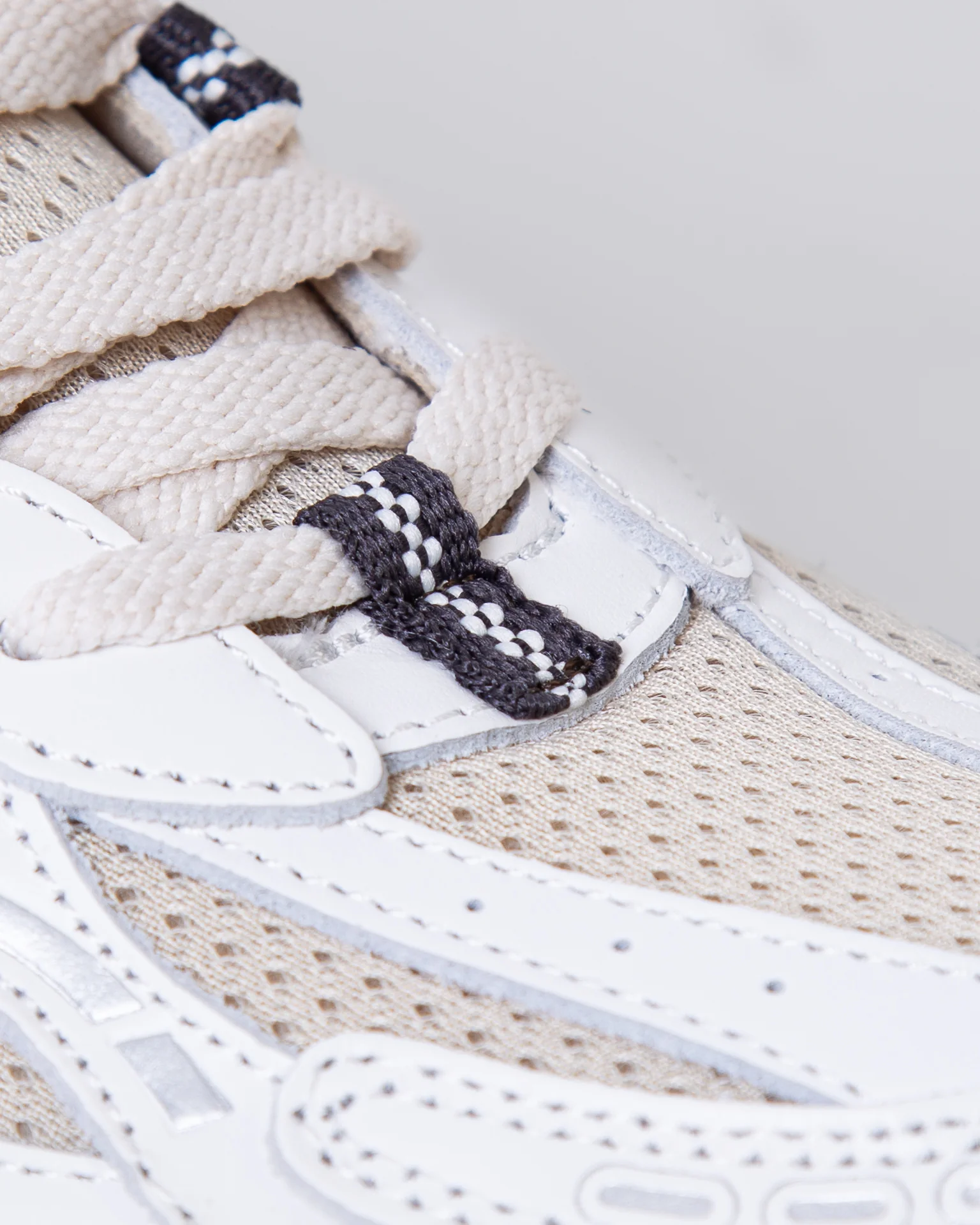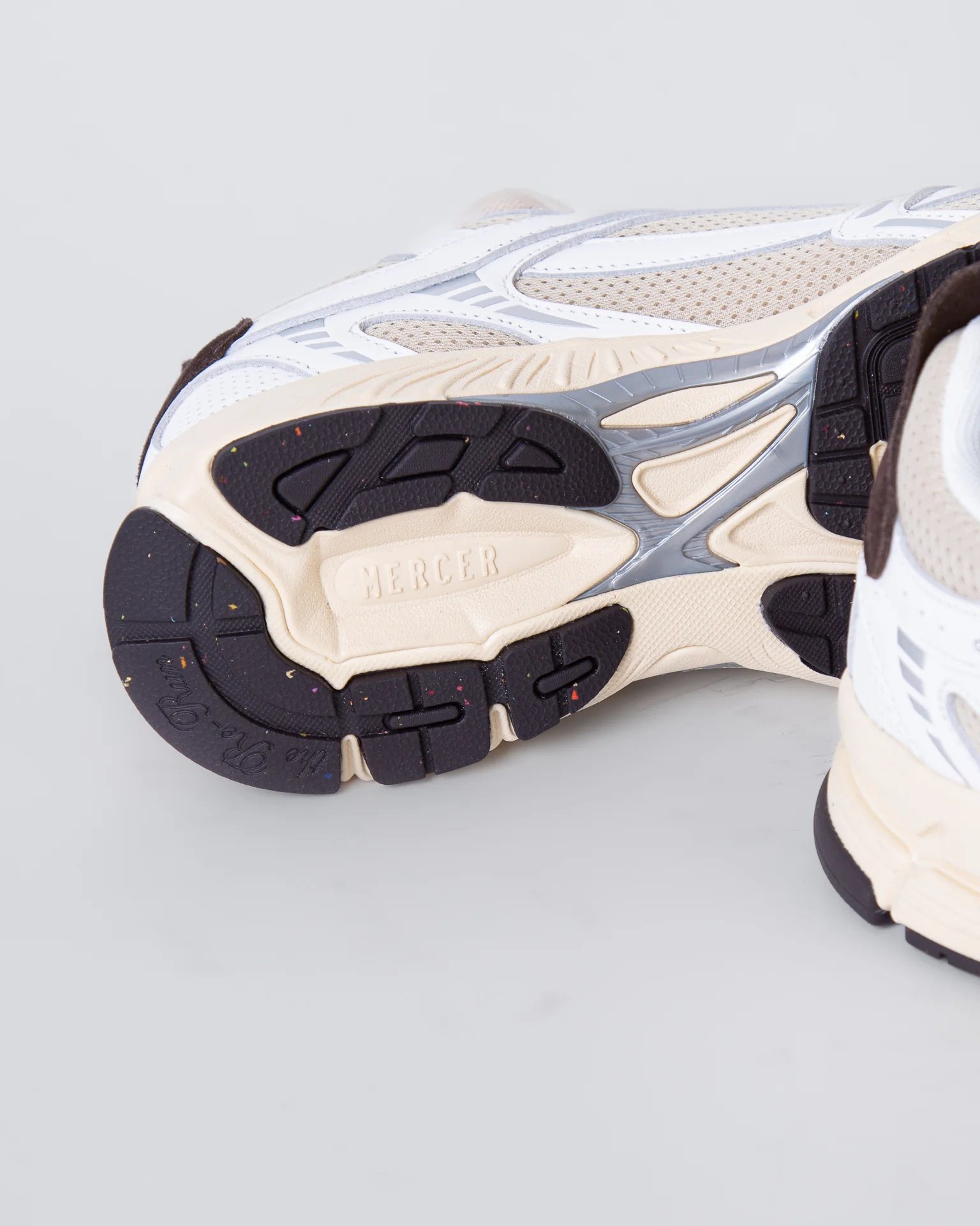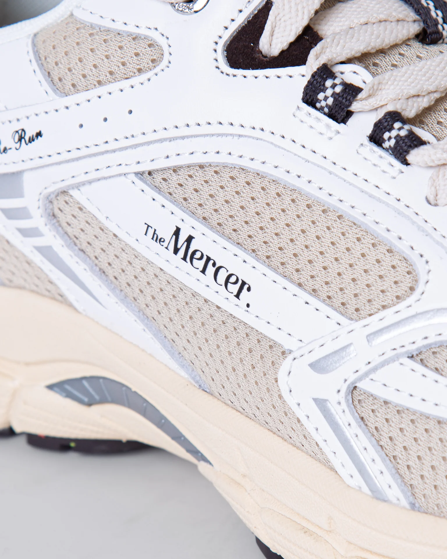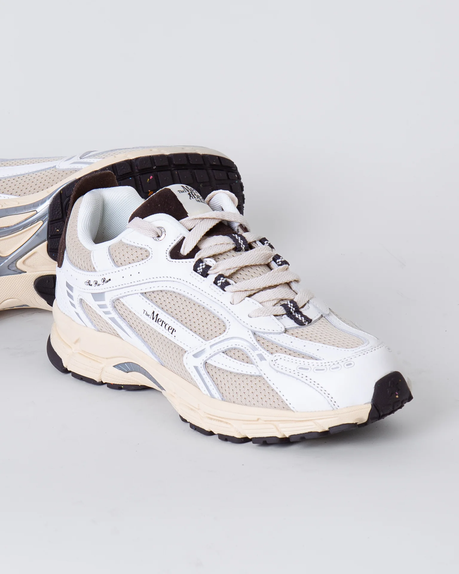 The Mercer Brand, sneakers uomo ME253012 157 avorio, modello re-run vintage, tomaia con inserti a rete, talloncino marrone a contrasto. La scarpa scattata รจ una taglia 43
