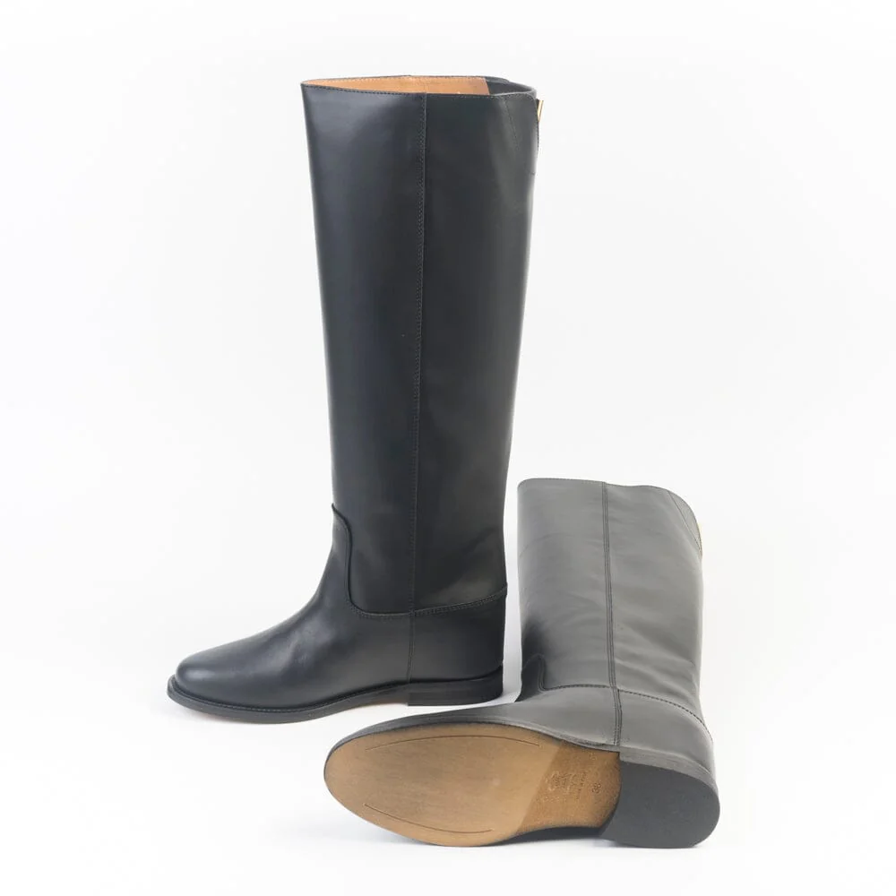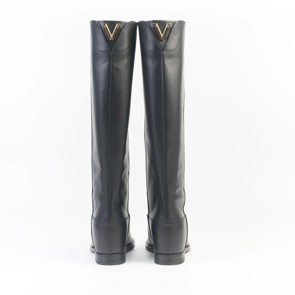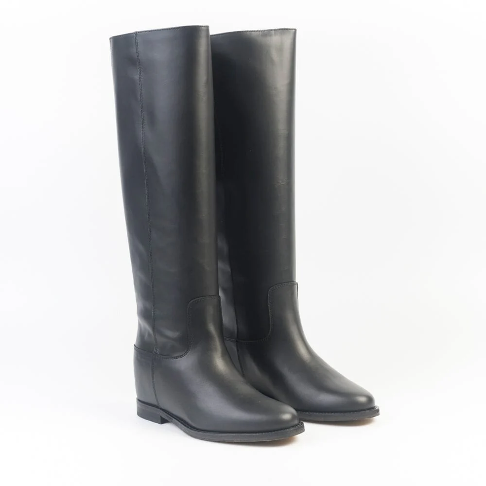 Stivale a tubo di Via Roma 15, realizzato in morbida pelle di colore nero. Applicazione della iconica V oro in metallo sul retro del gambale. Punta affusolata. Interno in pelle. Zeppa interna di 4 cm. Altezza del gambale 43 cm (riferito al numero 37). Suola in cuoio.