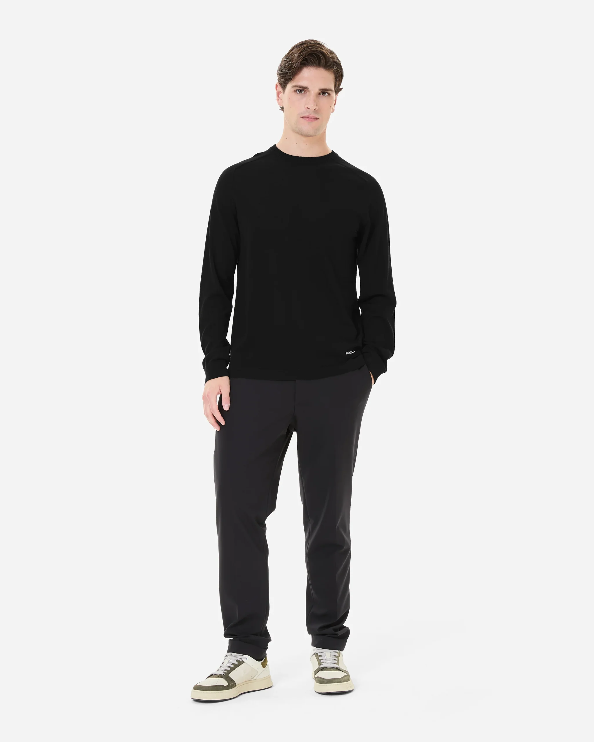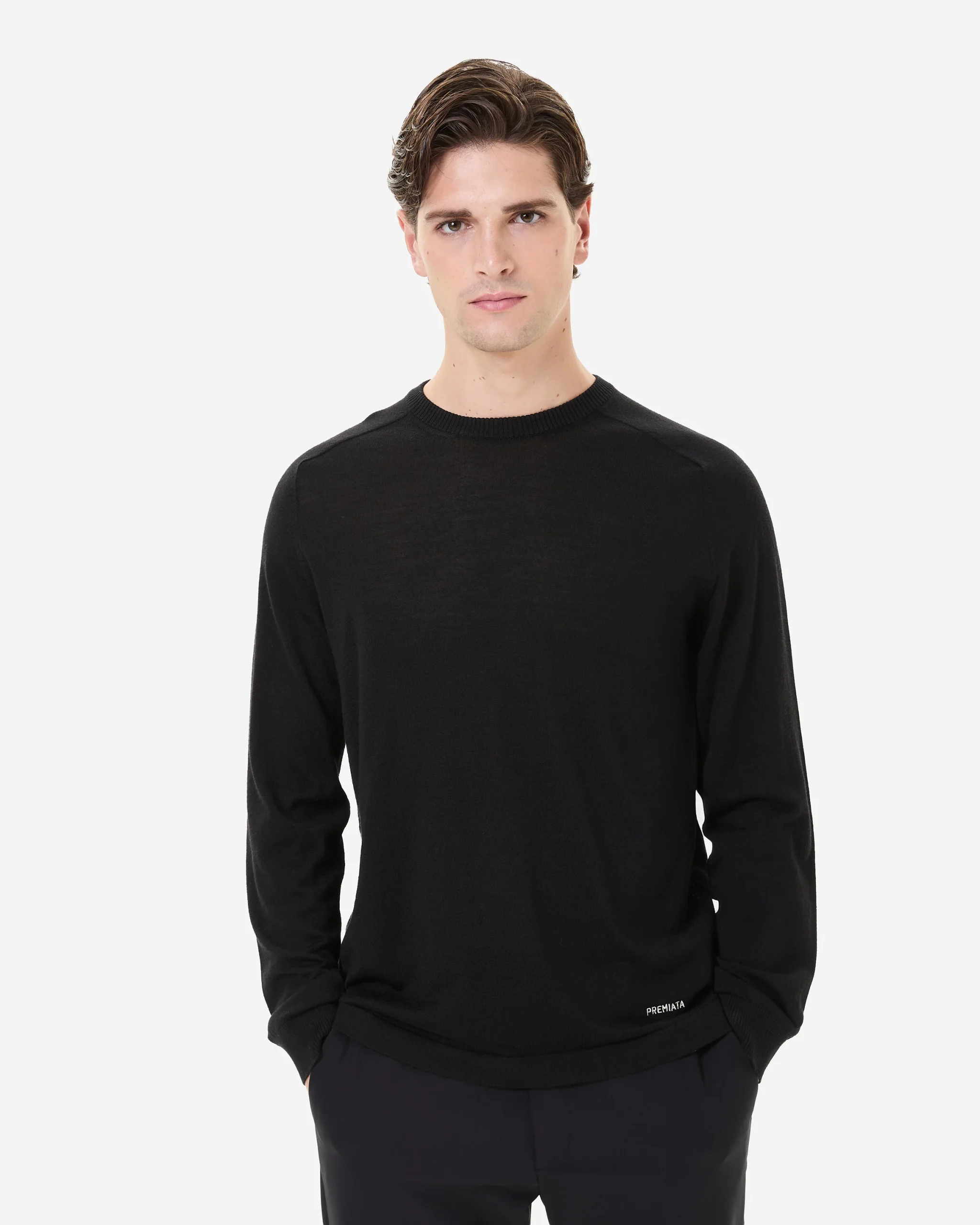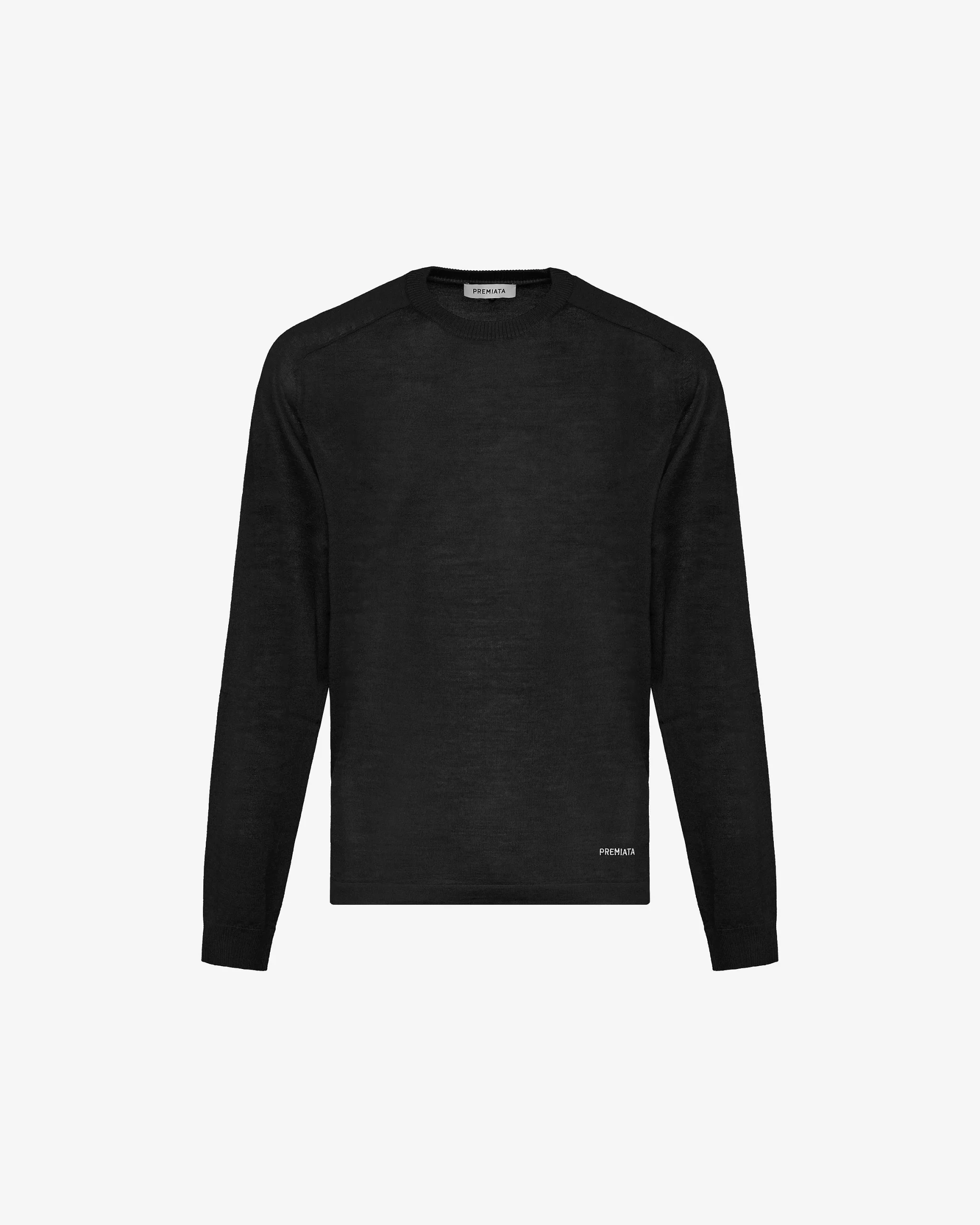 Yarn 2/60, 75% wool and 25% silk Fineness 18, 1 yarn Shaved garment Inlay pattern with second color only on inner cupel Contrasting embroidery on bottom Offset tubular hem, cuff with 2X1 rib and 2X1 double collar Saddle sleeve